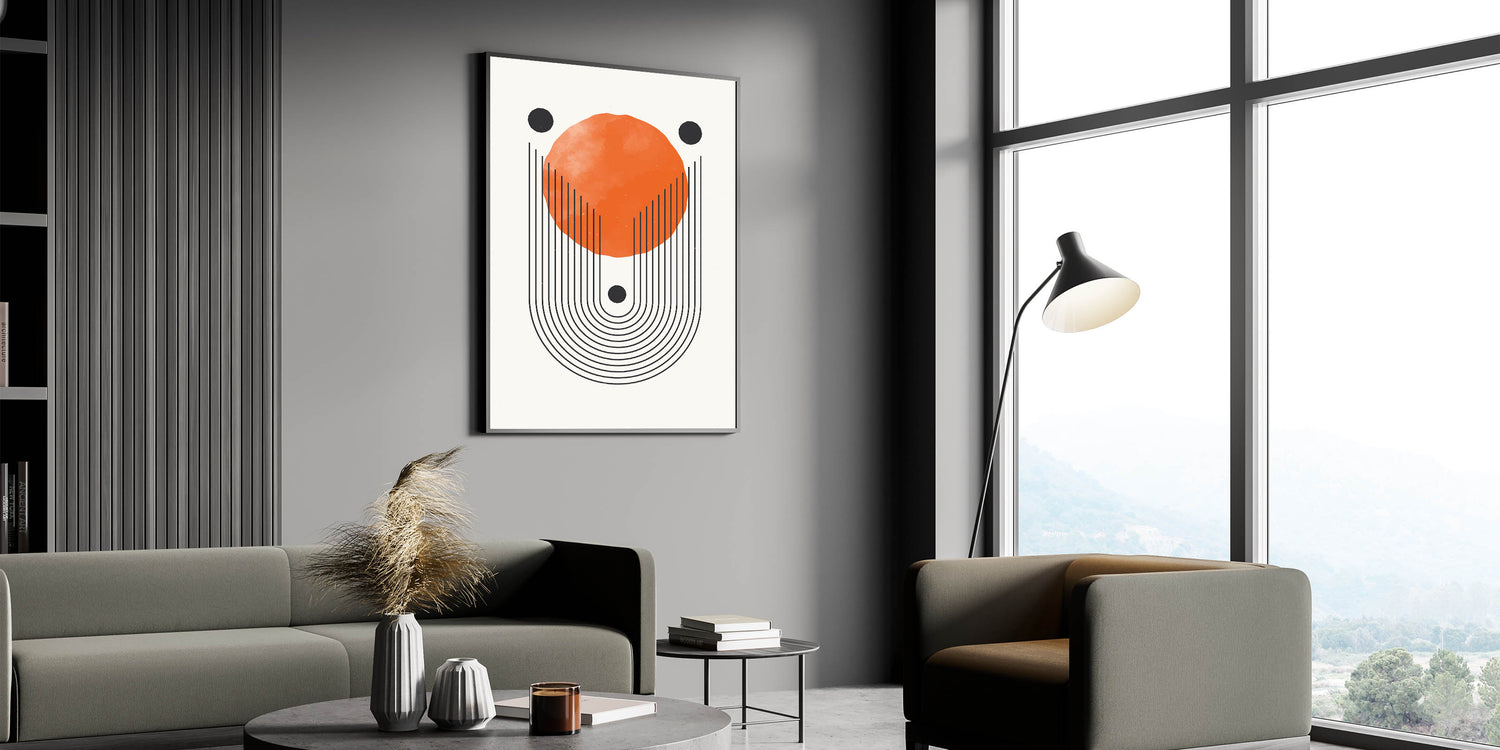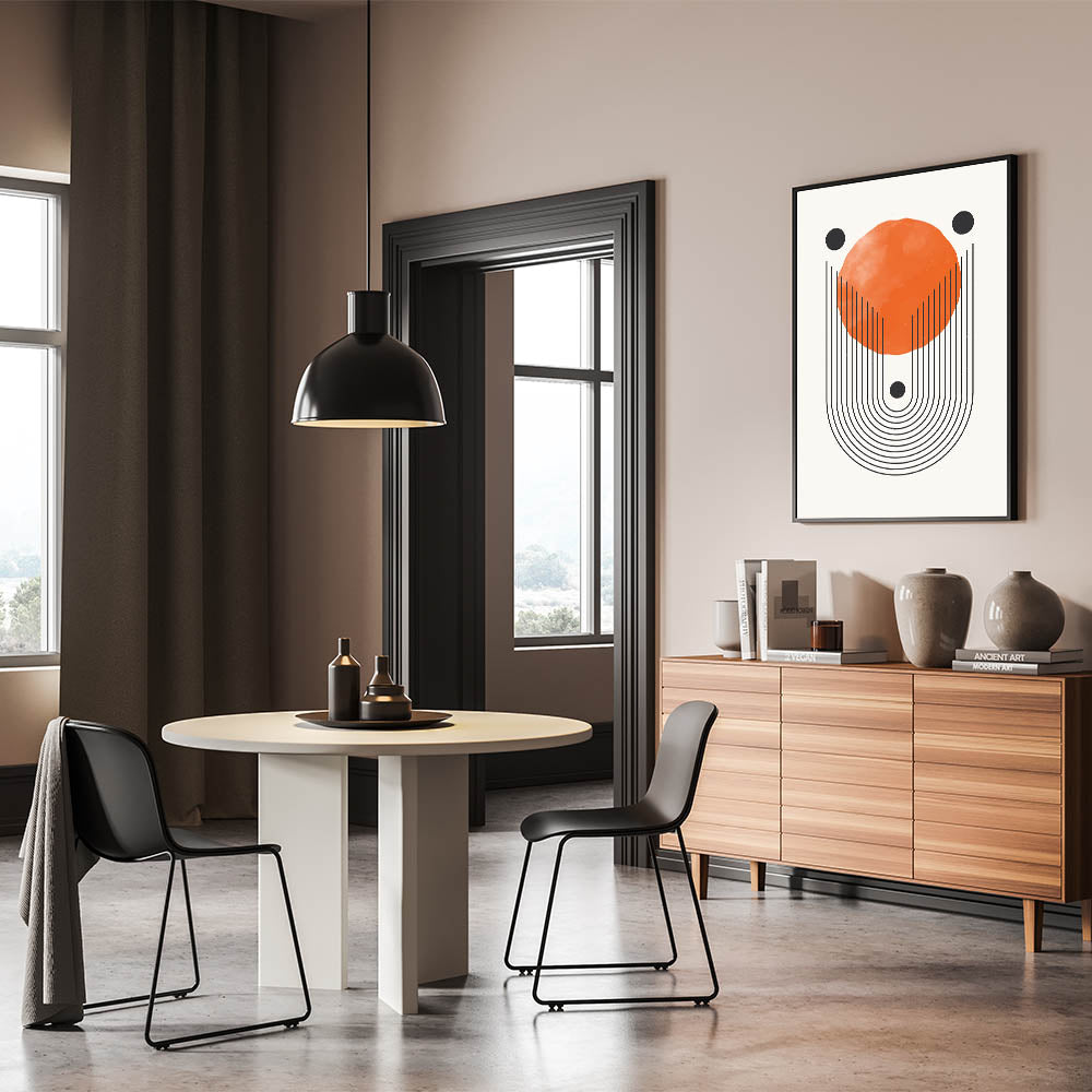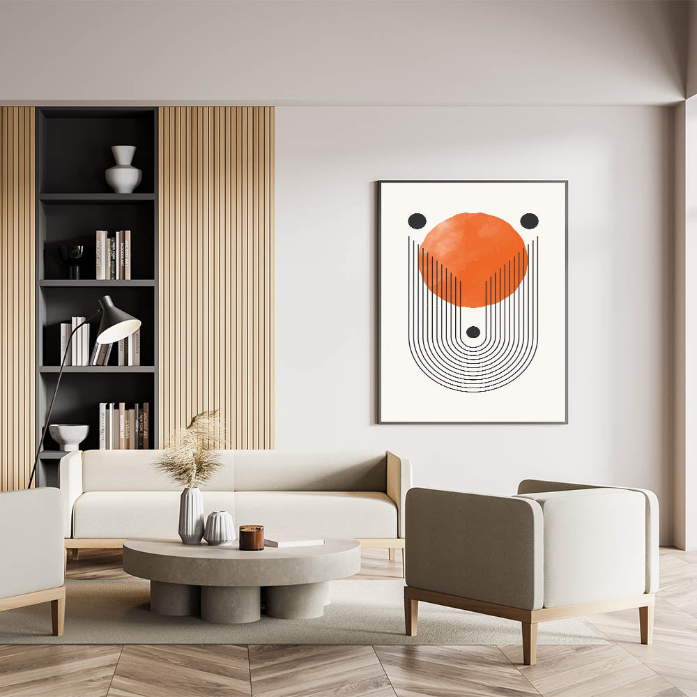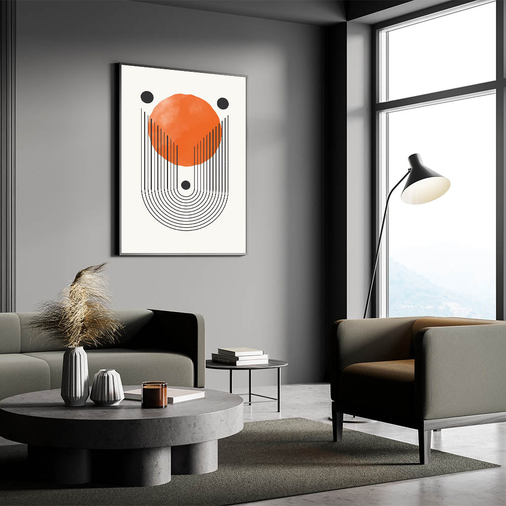 Add a modern, abstract touch to your decor with this bold Boho wall art. Featuring sleek, black geometric lines forming an arch shape, accented with a vivid orange circle, this design blends minimalism with vibrant elements. The composition is both striking and sophisticated, making it a perfect piece for contemporary bohemian spaces or modern minimalist interiors.