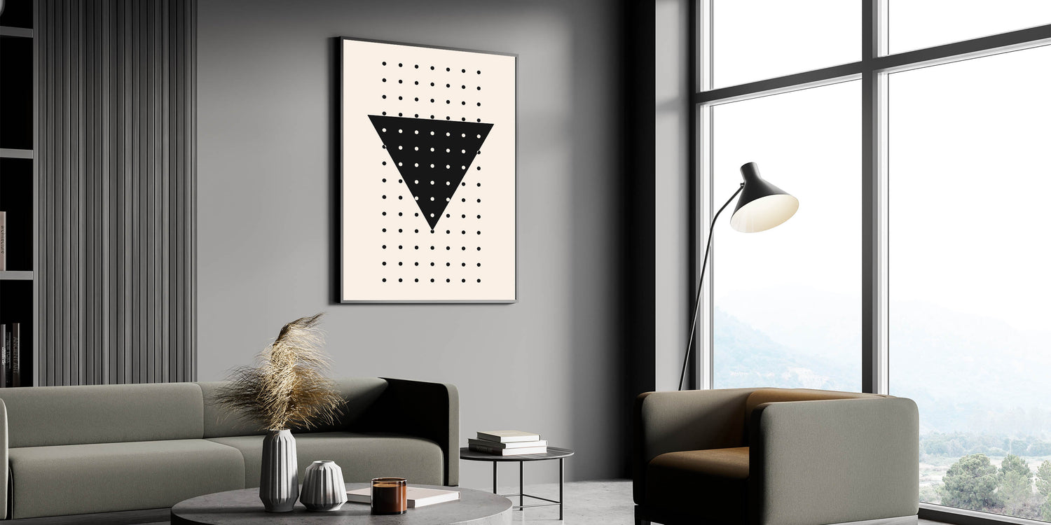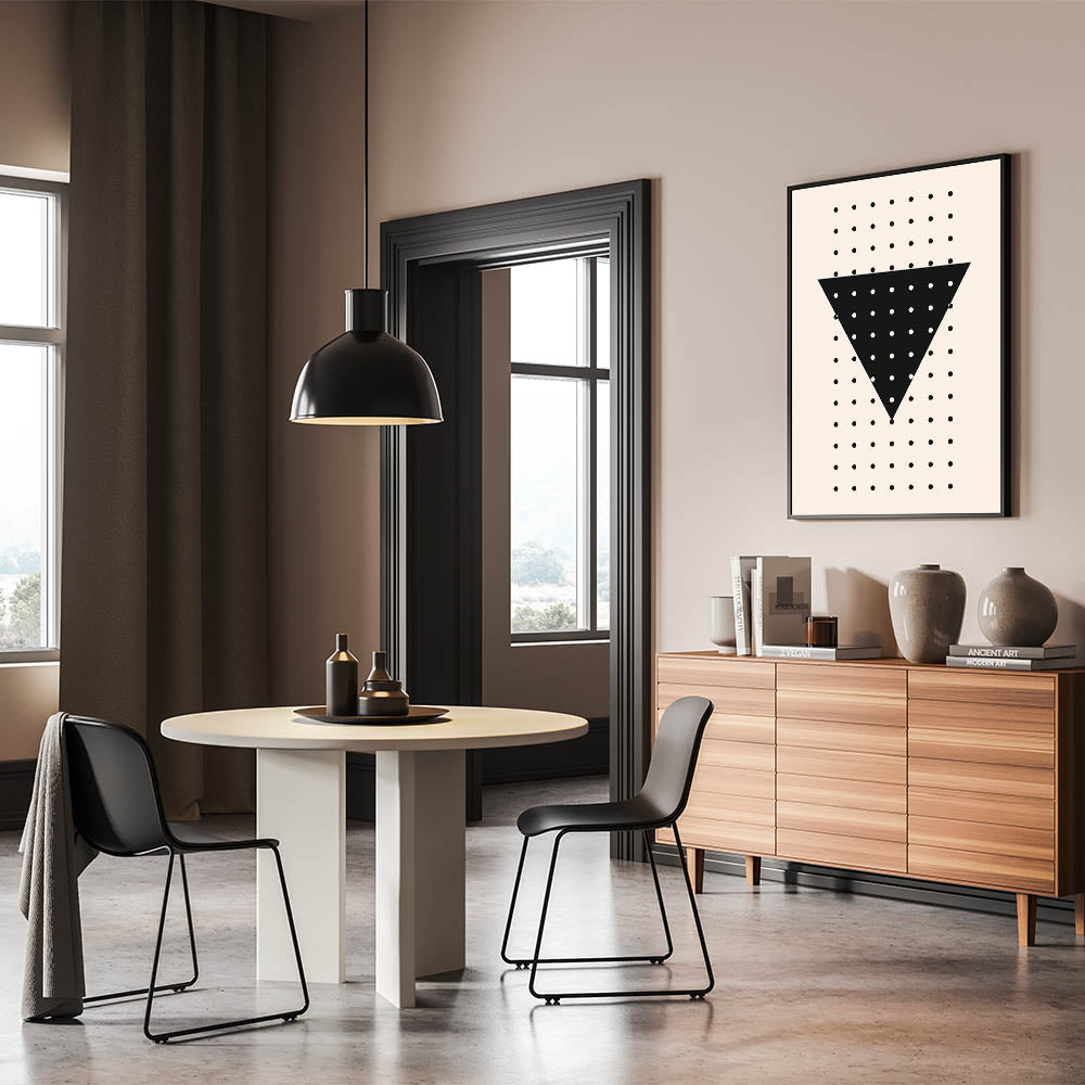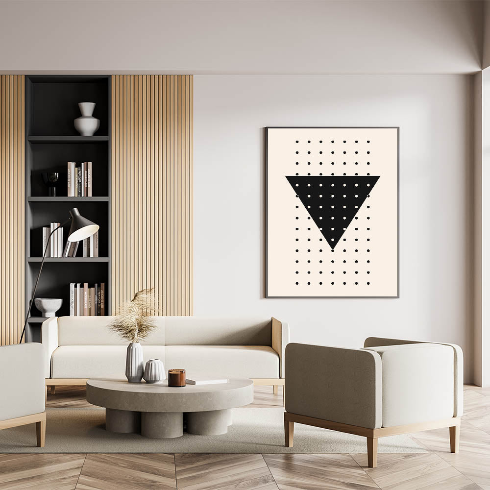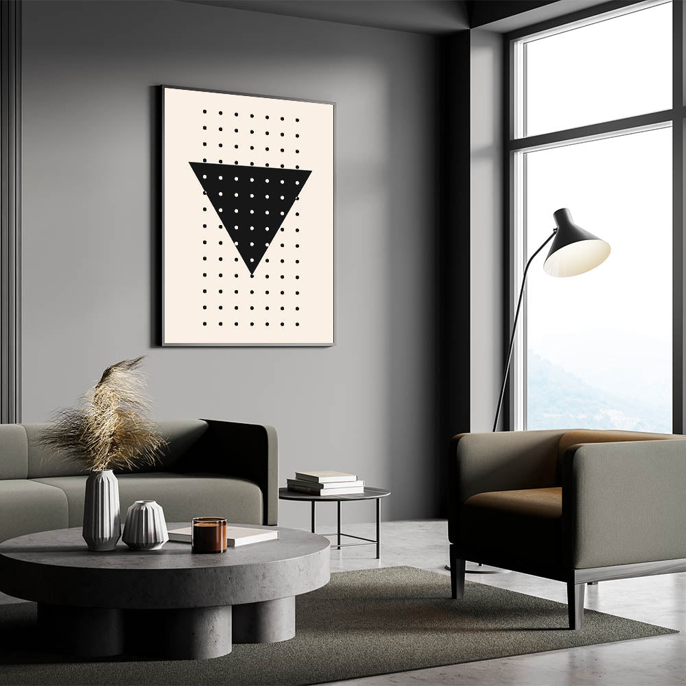 Add a modern, minimalist touch to your space with this bold geometric Boho wall art. Featuring a striking black triangle with a dotted pattern against a soft beige background, this design blends sleek, contemporary lines with boho chic style. Its clean, structured aesthetic makes it a versatile piece that complements both modern and eclectic interiors.