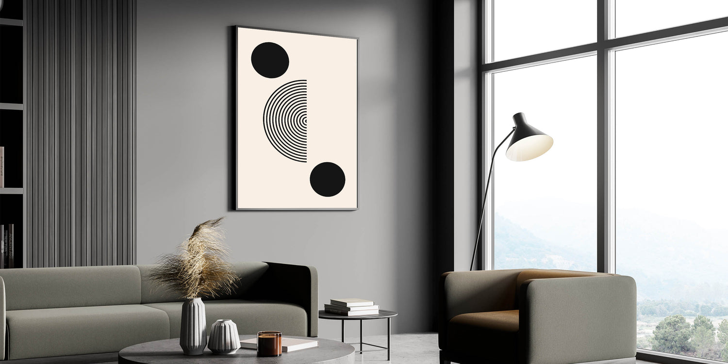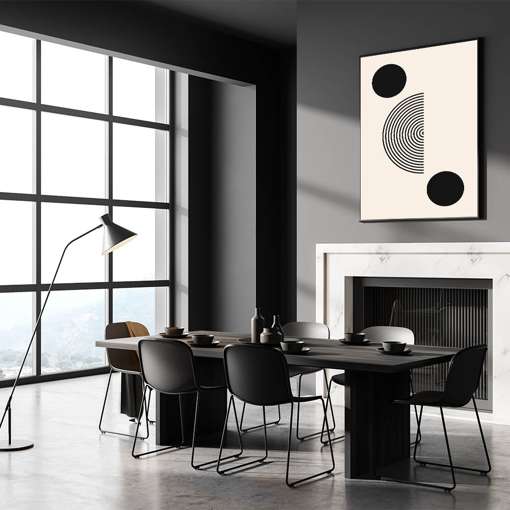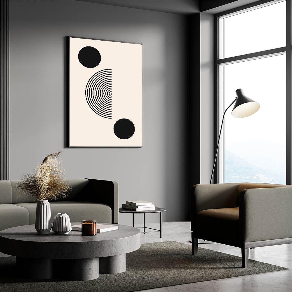 Transform your space with this sleek and modern Boho wall art. Featuring bold black geometric circles and a half-circle concentric design, this minimalist print is the perfect blend of simplicity and elegance. The clean lines and balanced composition make this piece ideal for both modern and bohemian interiors, adding a striking yet understated artistic element to your space.