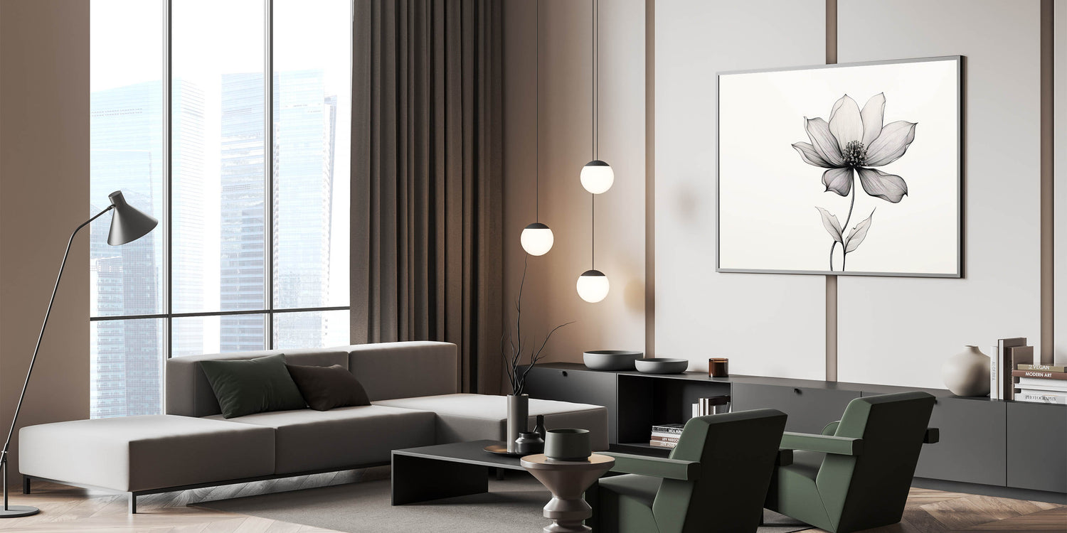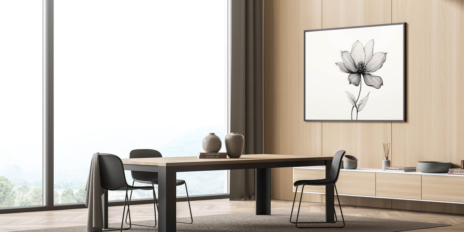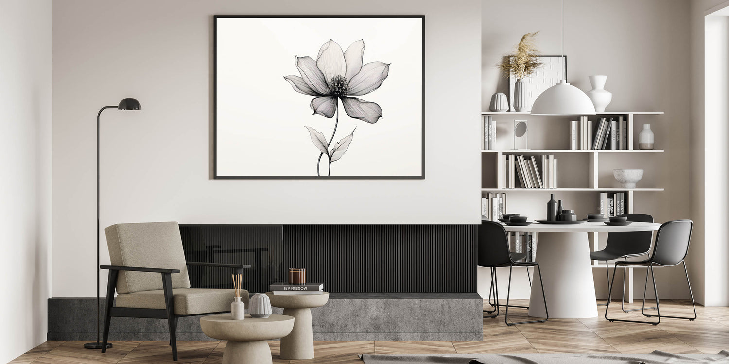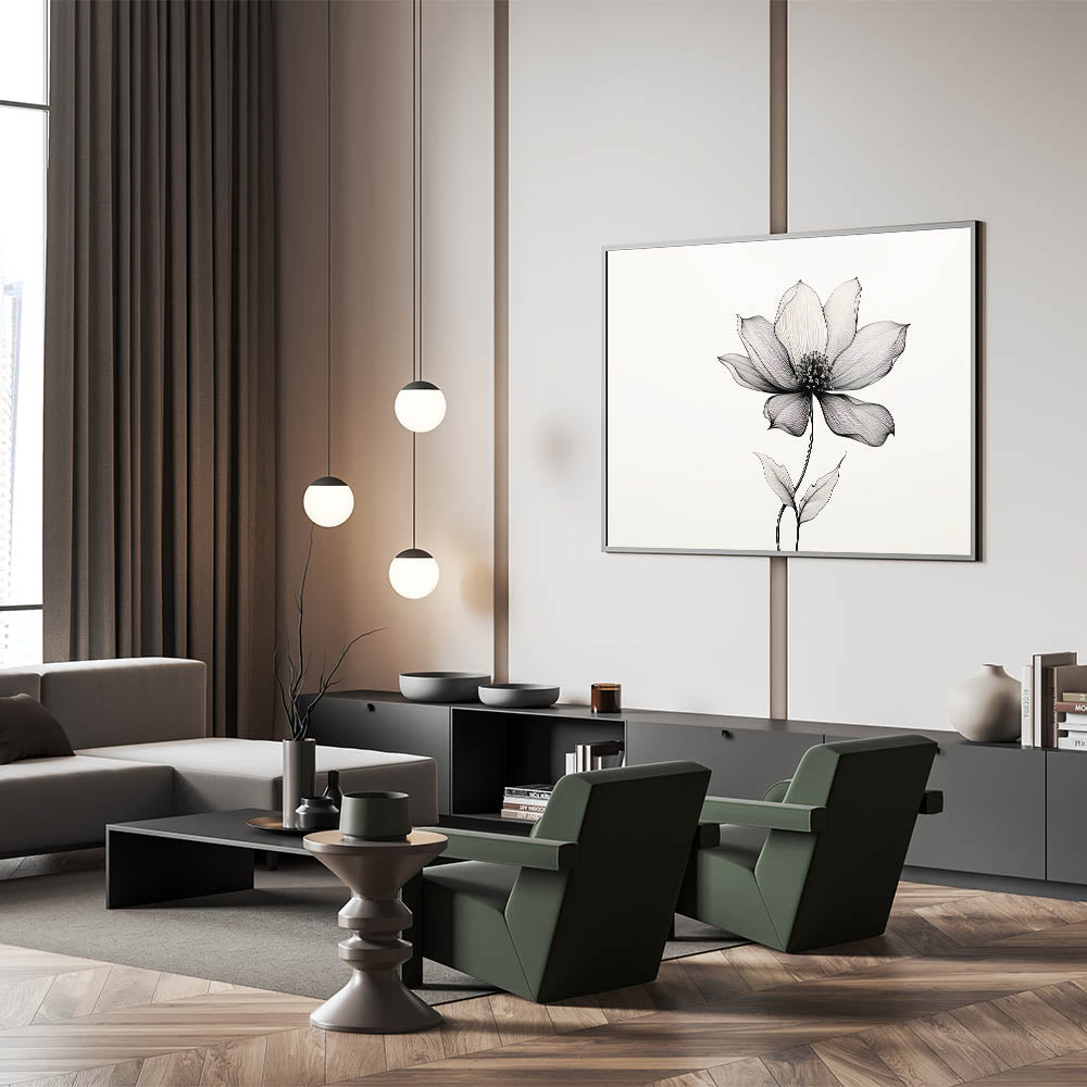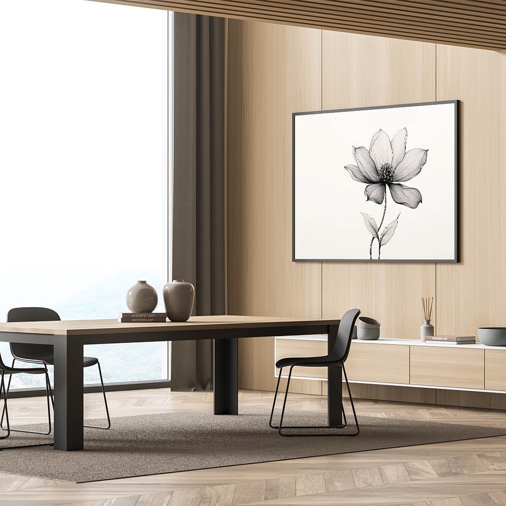 This eclectic boho wall art is available in various formats, including stretched canvas, framed canvas, and acrylic glass, allowing you to choose the perfect option for your space. The simplicity of the line art paired with the natural beauty of the flower makes this piece ideal for modern and bohemian interiors, creating a timeless and soothing focal point.