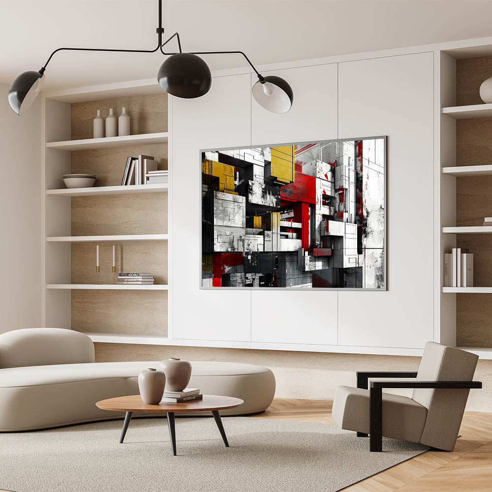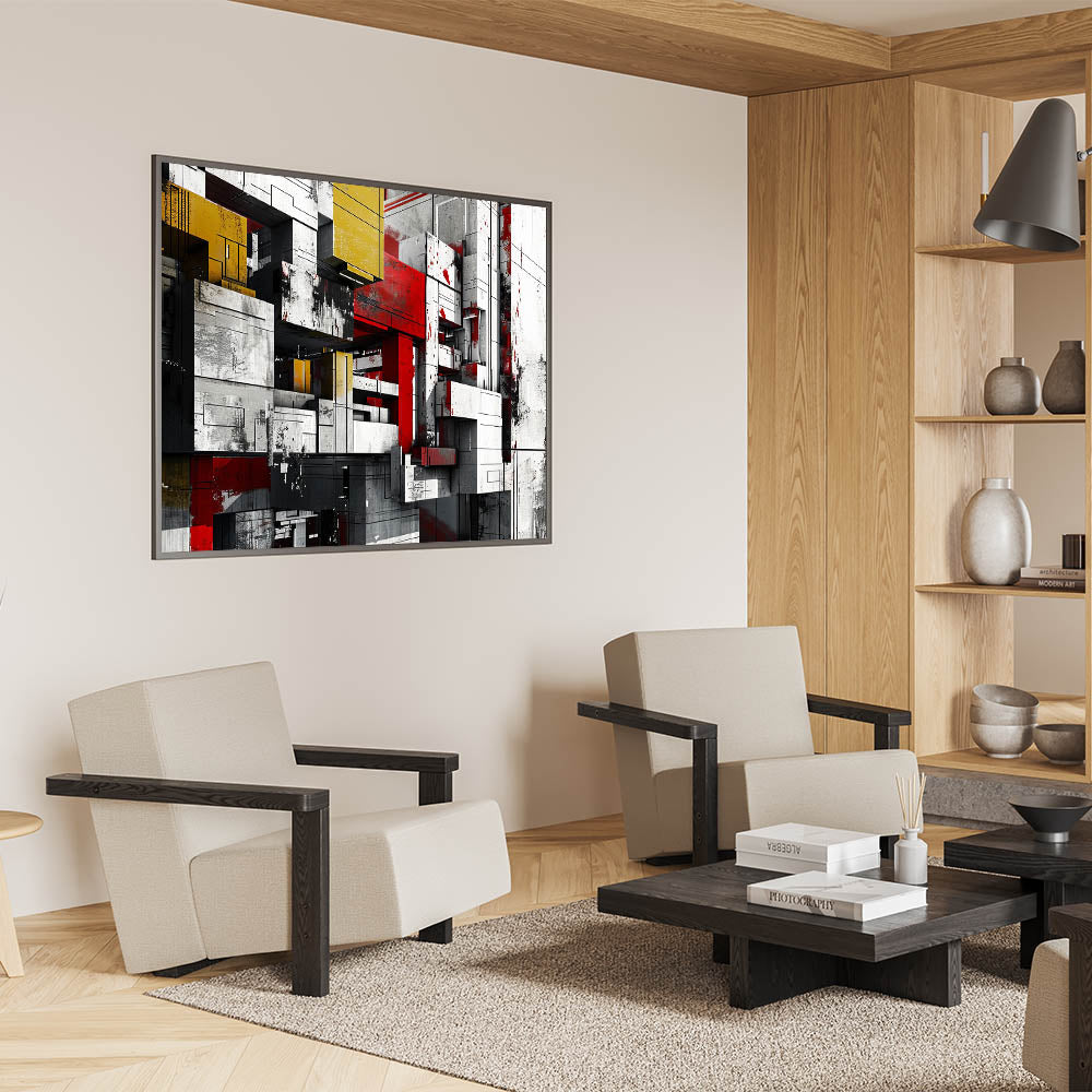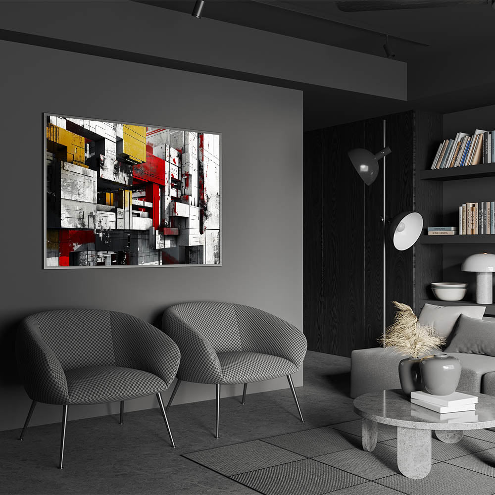 This design draws from architectural influences with its sharp lines and layered forms, creating a visual depth that captures the essence of modern brutalism art. The neutral grays paired with the dynamic red and yellow elements offer a versatile color palette that can complement various interiors.