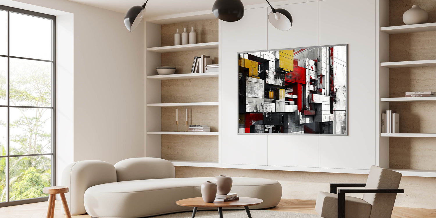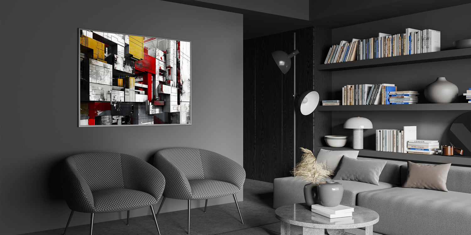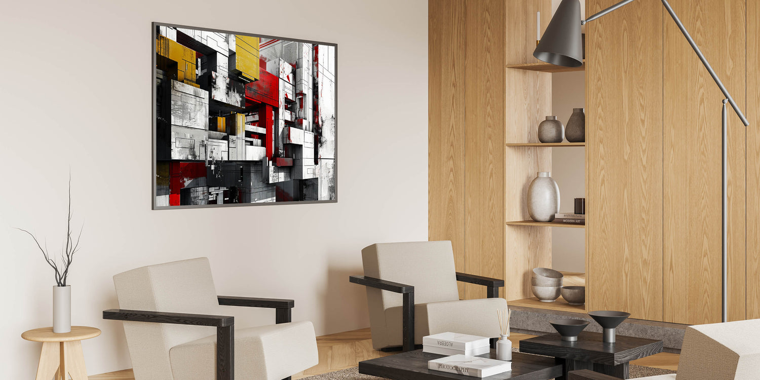 This design draws from architectural influences with its sharp lines and layered forms, creating a visual depth that captures the essence of modern brutalism art. The neutral grays paired with the dynamic red and yellow elements offer a versatile color palette that can complement various interiors.