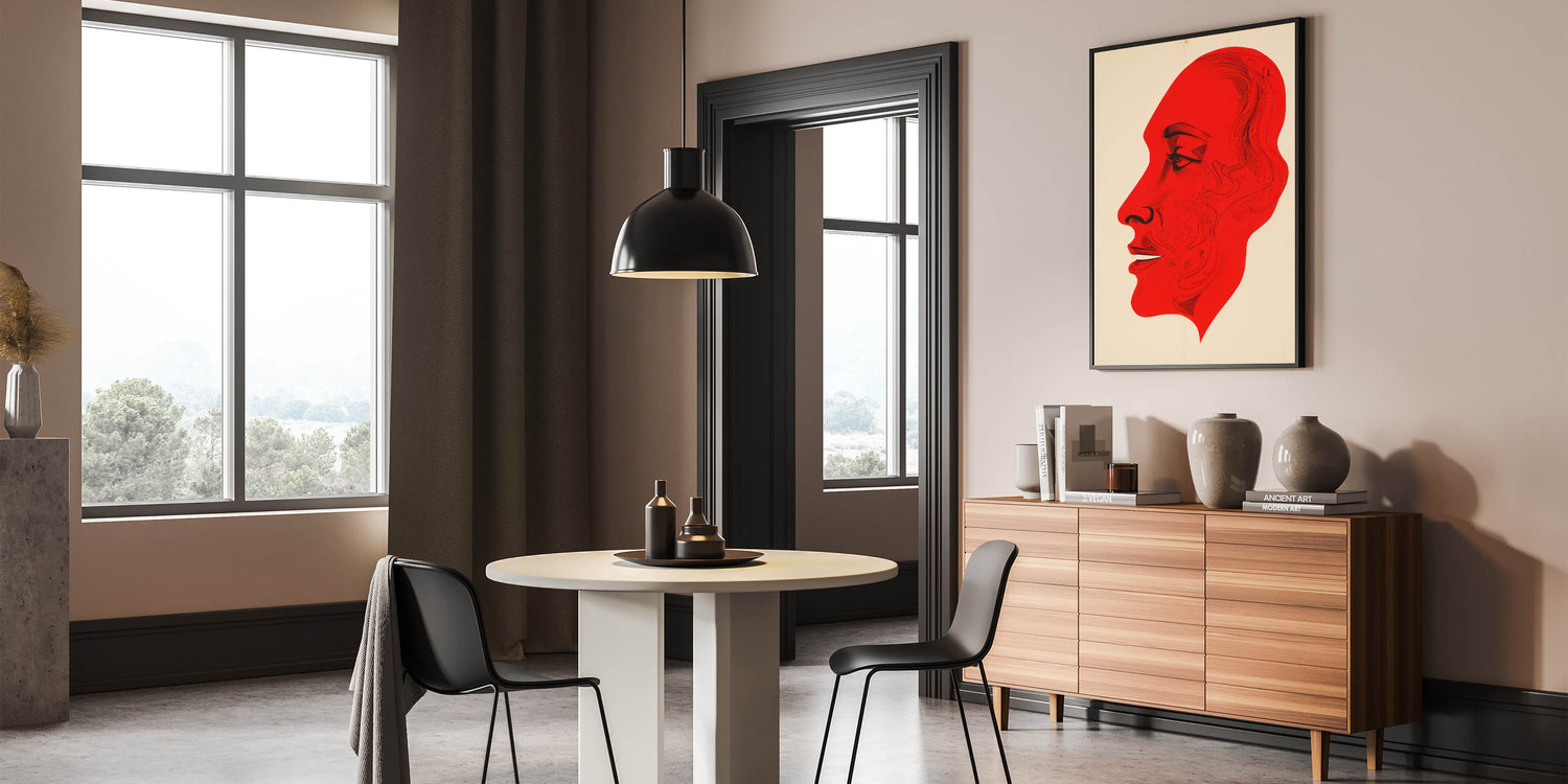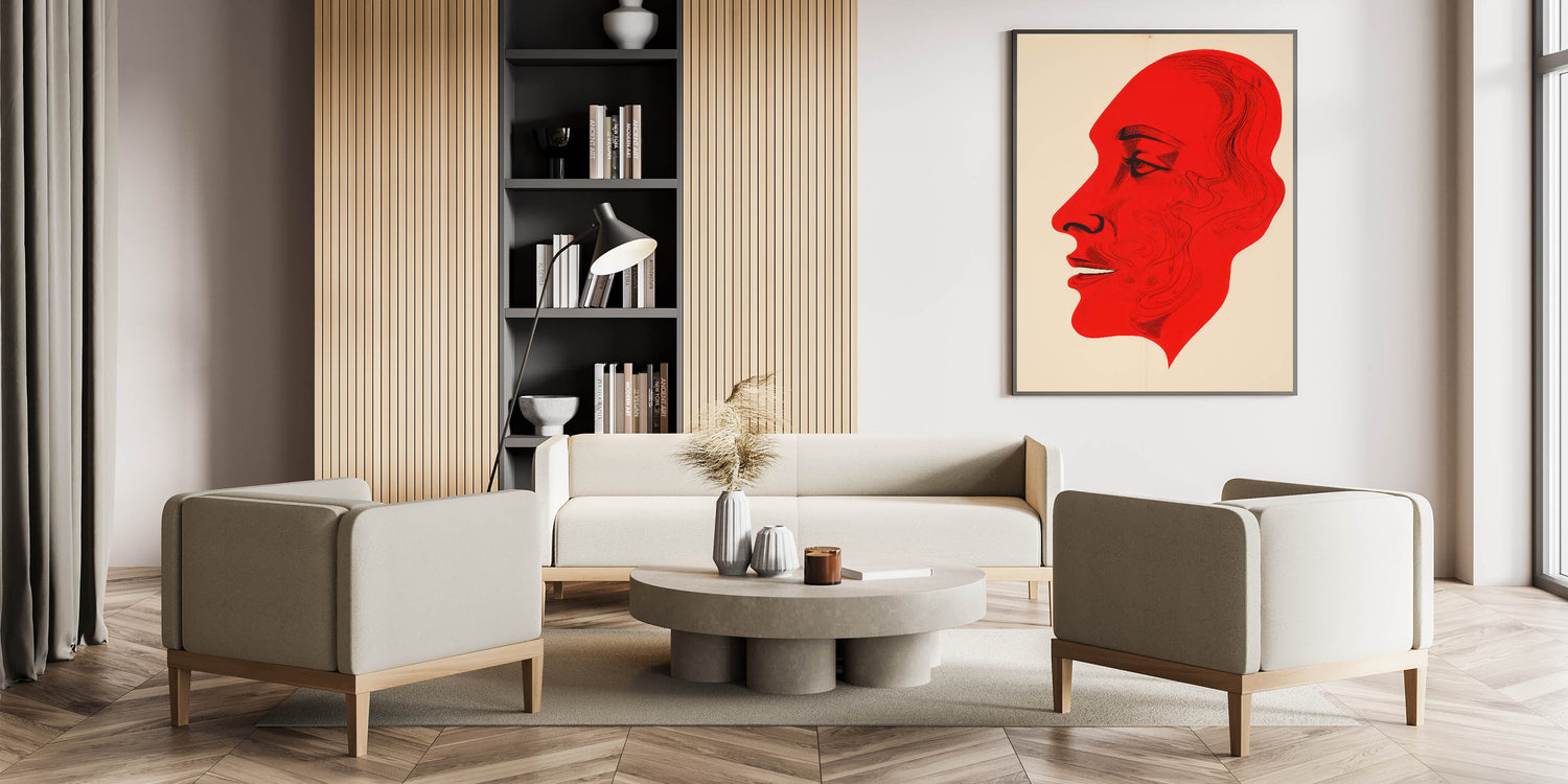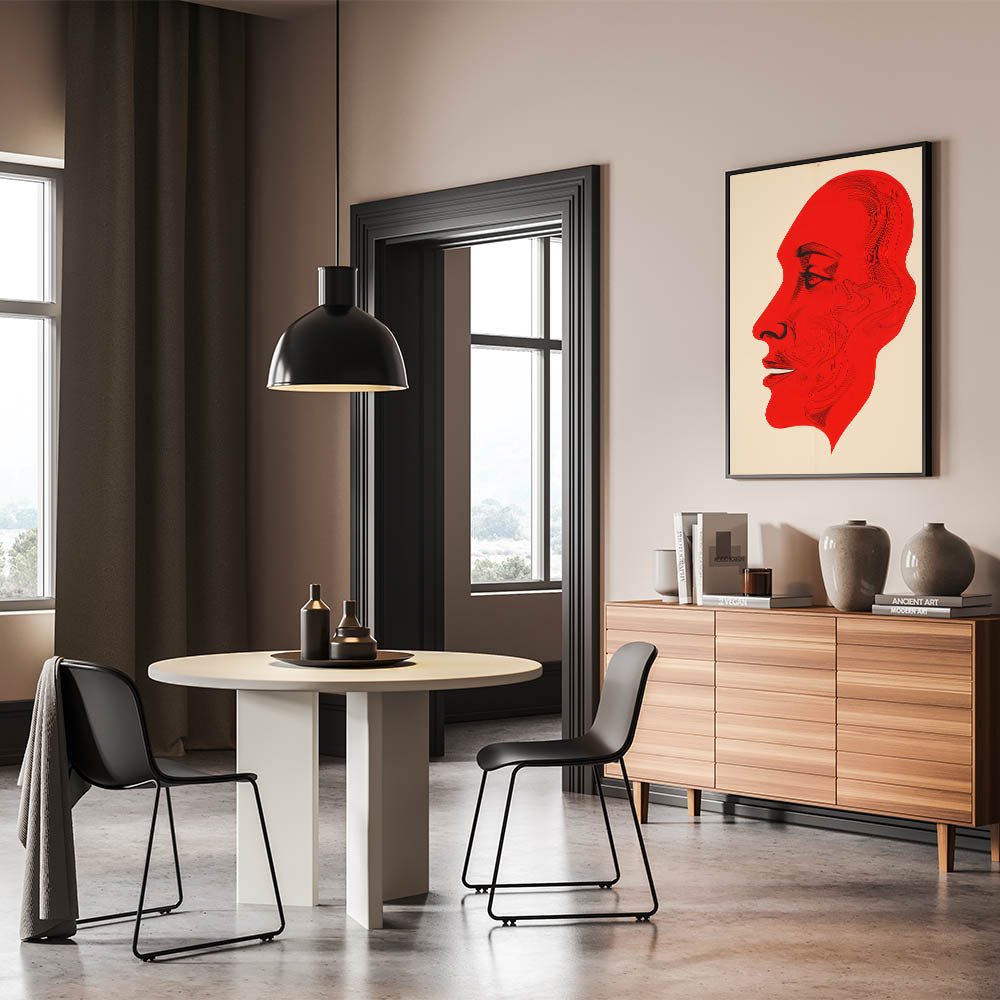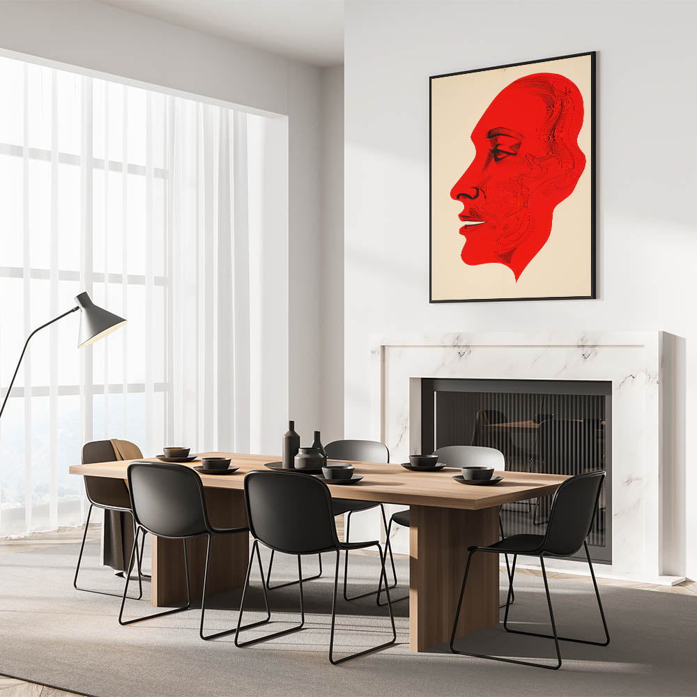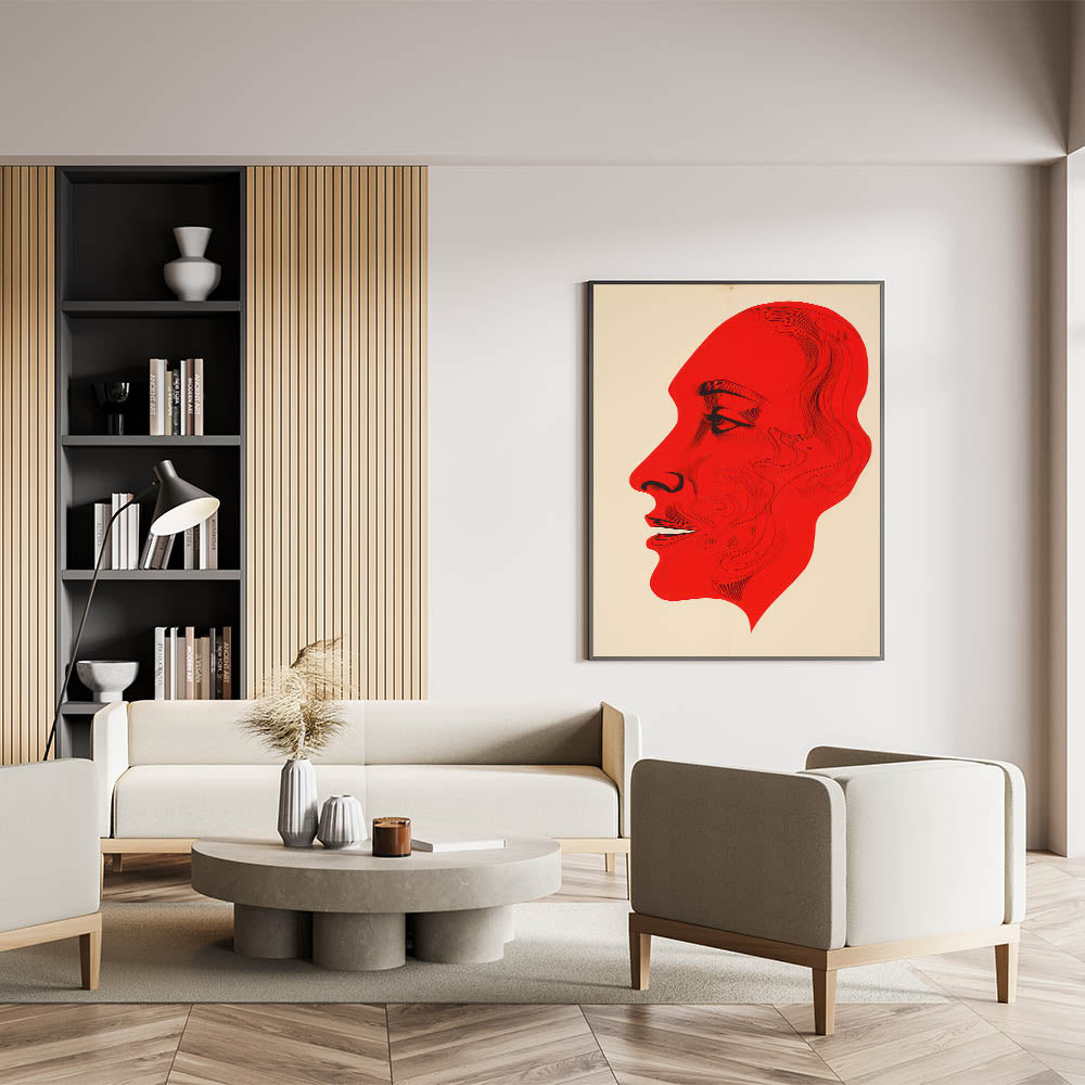 This bold electric red portrait art presents a striking abstract profile, with intricate line details that bring depth and expression to the figure. The vibrant red hue contrasts sharply against the neutral background, creating a powerful and captivating visual effect. This piece is perfect for modern and eclectic interiors, adding a dramatic flair that commands attention and sparks conversation.
