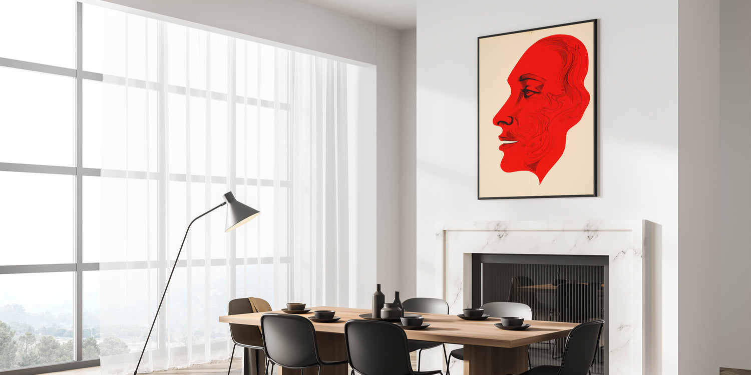 Enhance your decor with this electric red portrait art that exudes confidence and modernity. Its striking composition and vibrant palette make it a standout addition to any space, transforming interiors with a contemporary and expressive touch.