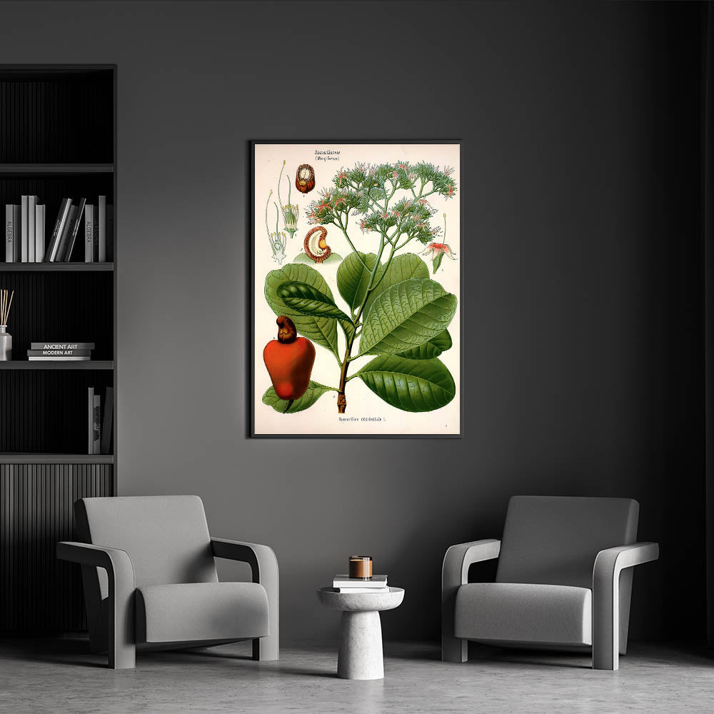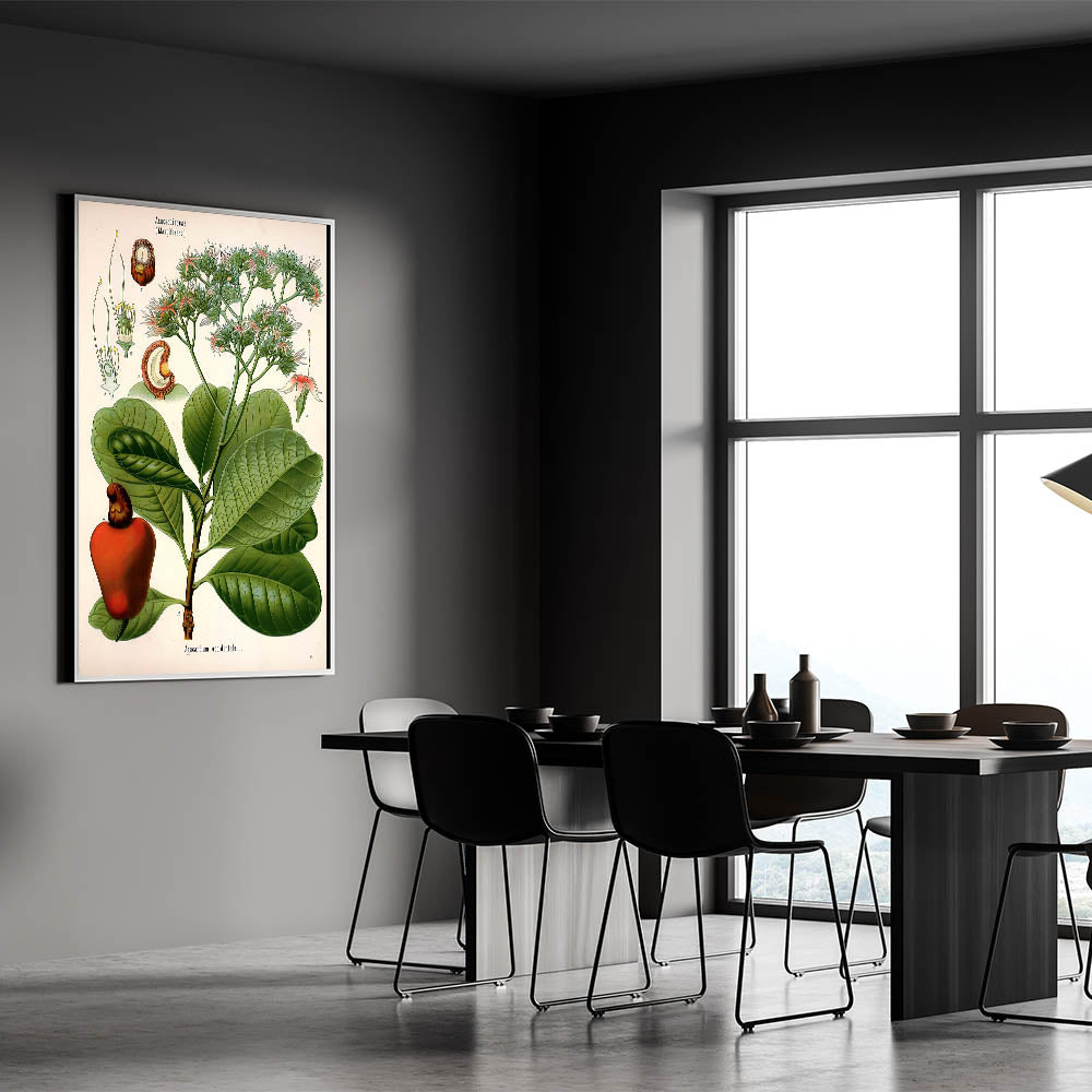 Bring a burst of natural beauty into your home with this exquisite botanical art print featuring Anacardium occidentale (Cashew Tree). This vintage botanical illustration captures the rich details of the plant, showcasing its broad leaves and unique fruit, making it the perfect piece for nature lovers and art enthusiasts alike.