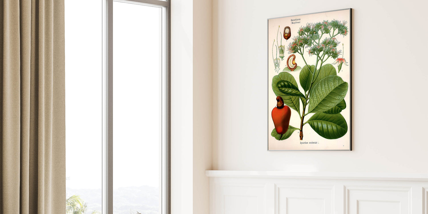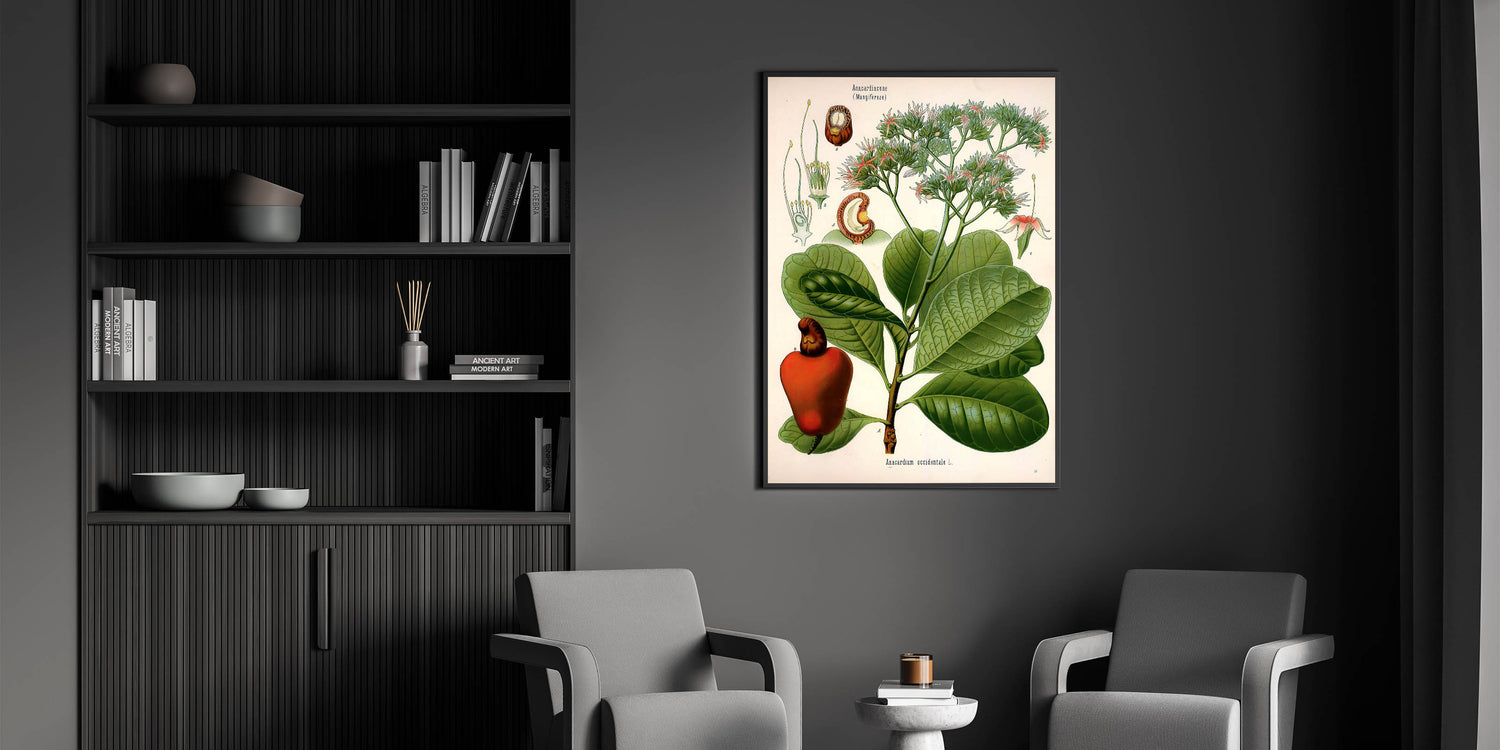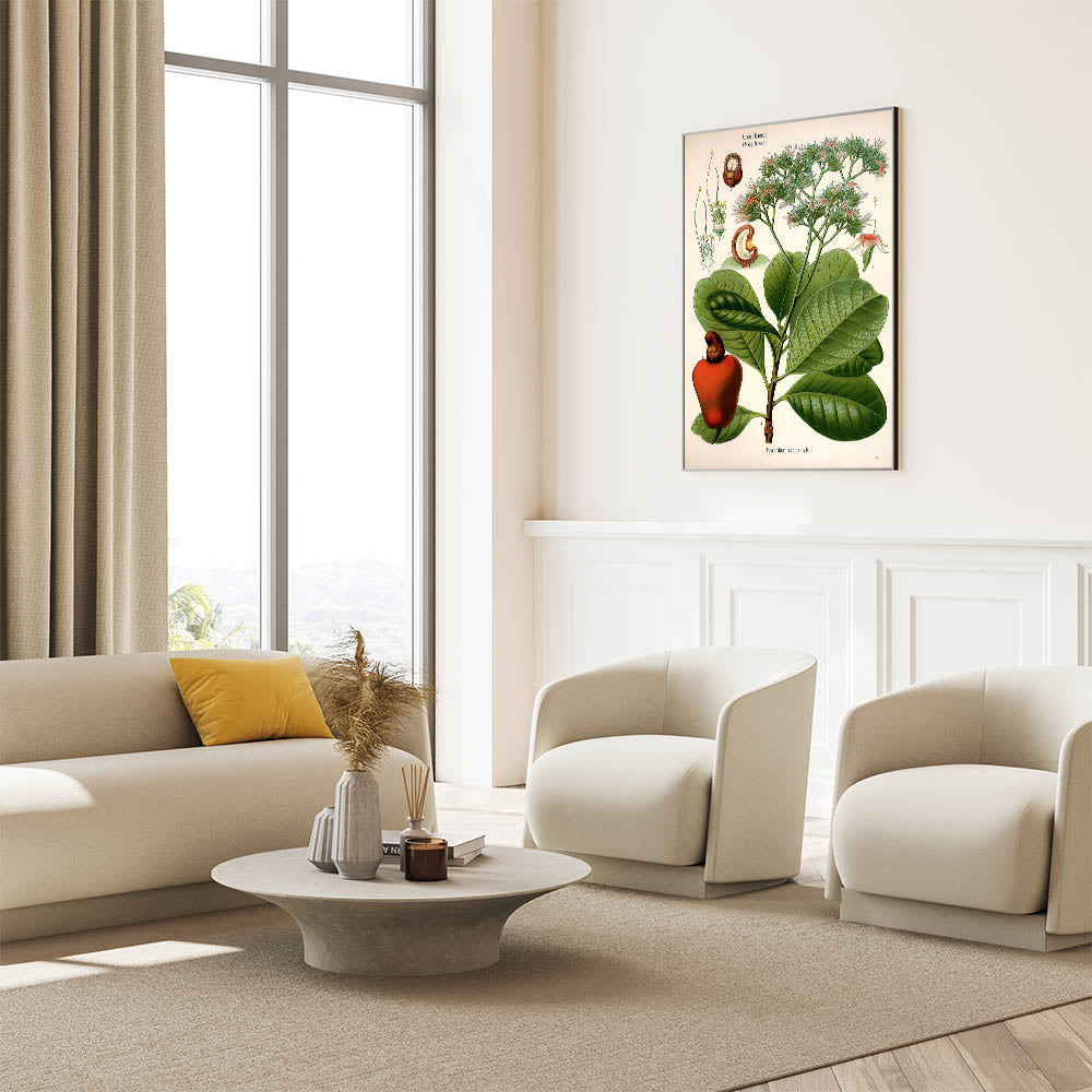 The delicate flowers and vibrant cashew fruit add a refreshing touch to any room, making this botanical wall art ideal for those looking to enhance their space with nature-inspired decor. Whether you’re drawn to the vintage art style or the botanical design, this piece will add a timeless charm to your home.