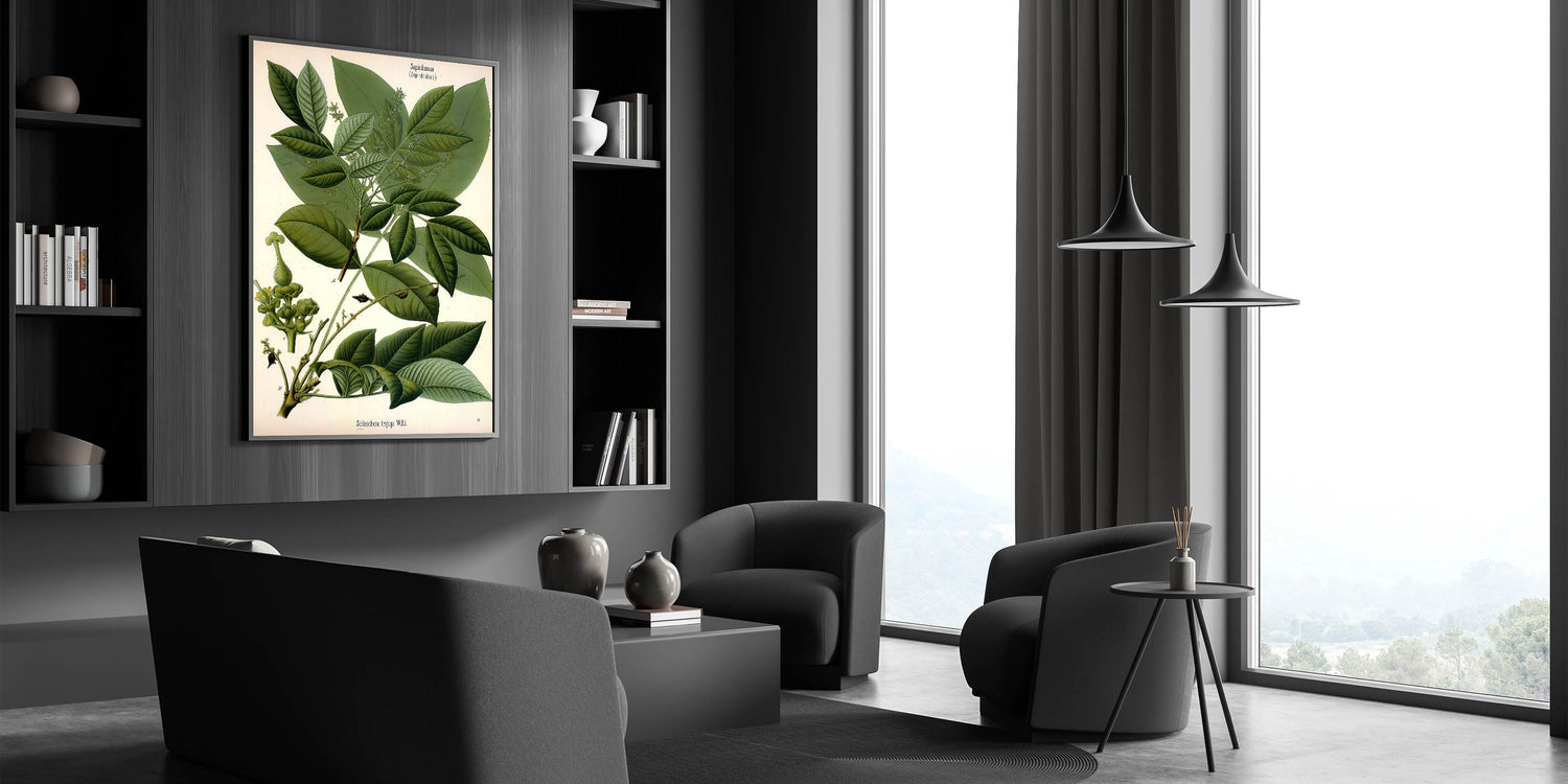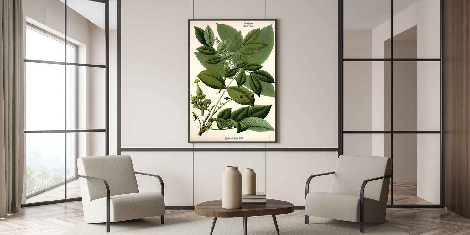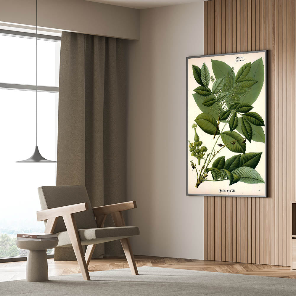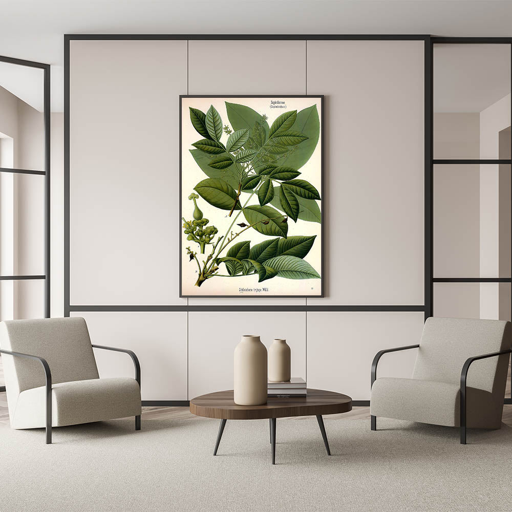 The detailed artwork showcases the intricate botanical elements of the plant, from the smooth leaves to the flowering clusters. Whether you're a nature lover or an art enthusiast, this botanical wall art is ideal for those who appreciate the beauty of vintage botanical illustrations and nature-inspired decor.