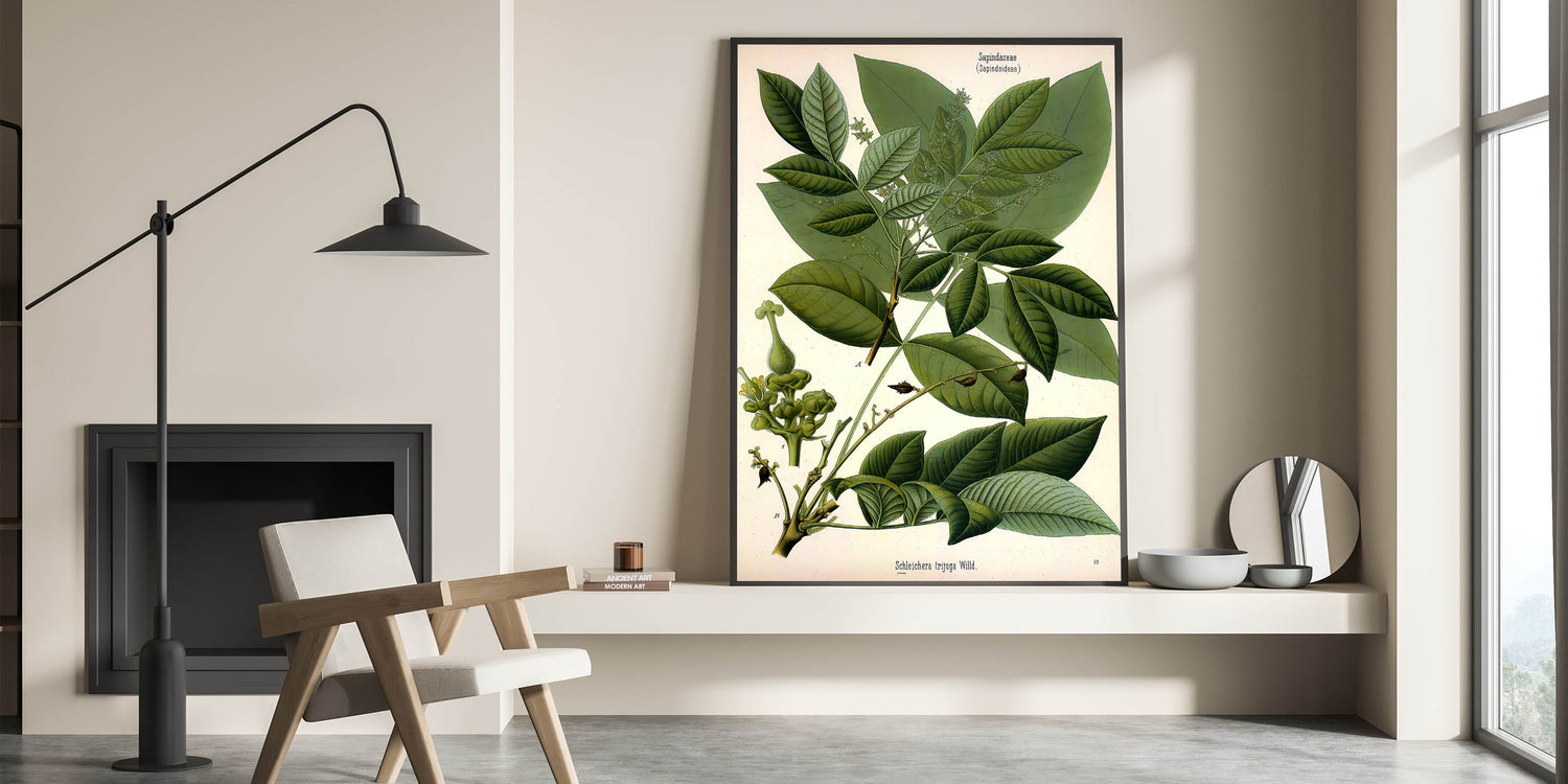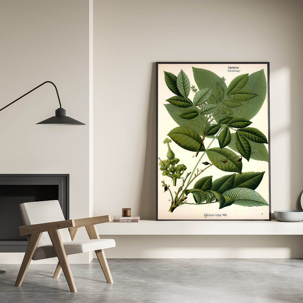 Bring nature’s elegance into your home with this stunning botanical art print featuring Schleicheria trijuga, a member of the Sapindaceae family. This vintage botanical illustration beautifully captures the plant’s lush green leaves and delicate flowers, perfect for adding a serene, nature-inspired touch to any space.