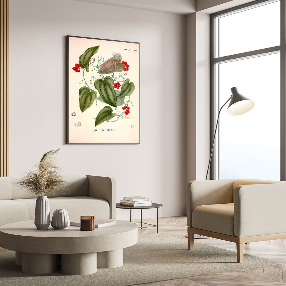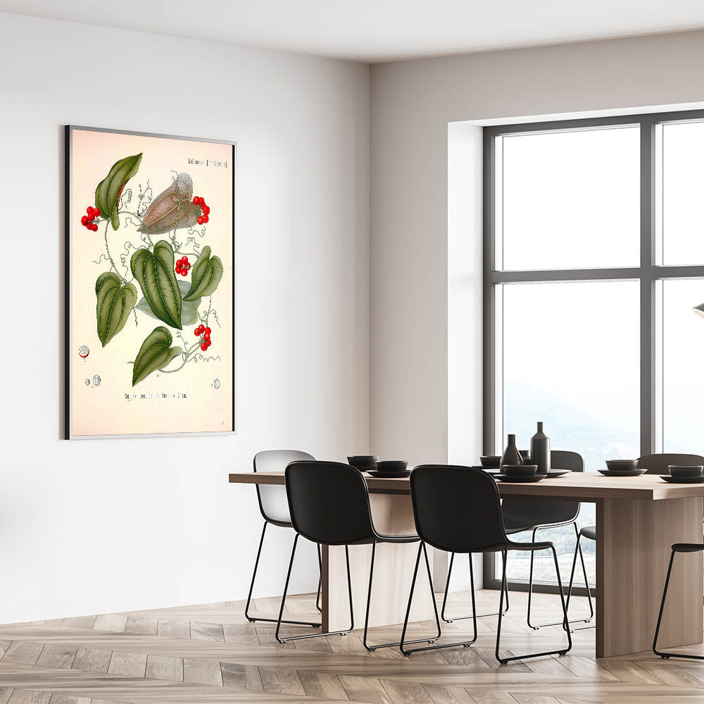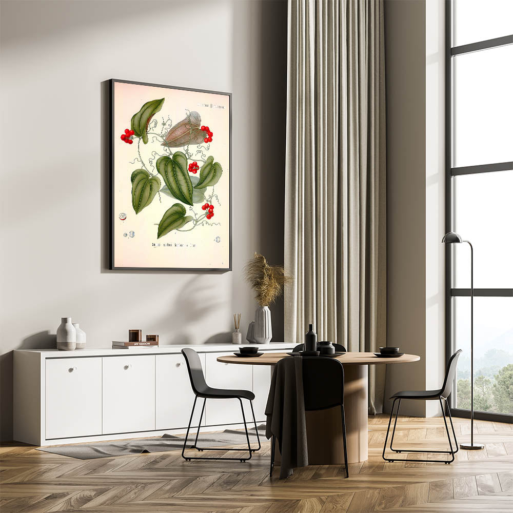 This captivating vintage botanical illustration of Smilax Medica (Greenbriar or Sarsaparilla) highlights the plant's intricate vines, glossy green leaves, and vibrant red berries. The detailed design makes it a perfect piece for nature lovers and herbal art enthusiasts. Whether you display it in your living room, office, or study, this botanical print will add a touch of natural elegance to your space.