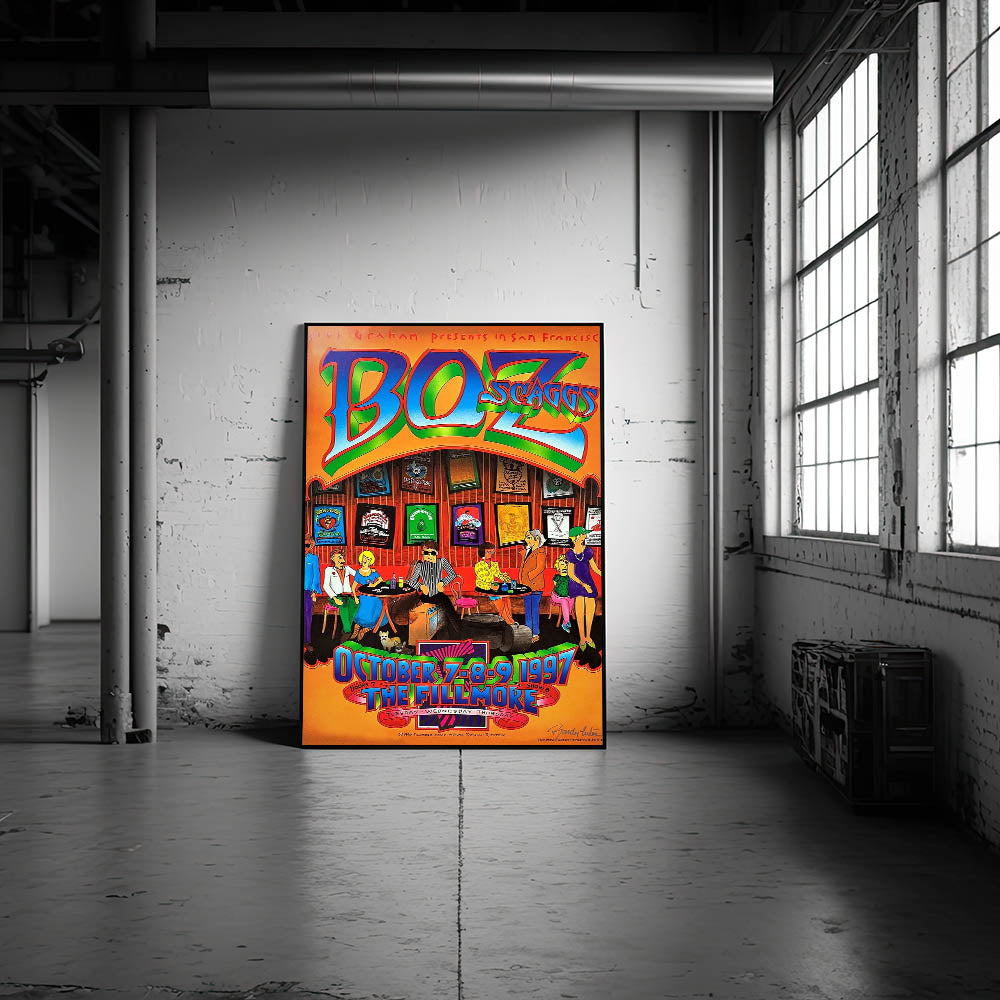 Step into the vibrant world of Boz Scaggs with this 1997 Fillmore Poster. Featuring bold, psychedelic colors and an animated style, this retro music wall art captures the lively atmosphere of his performance at the iconic Fillmore. With its vivid oranges, greens, and blues, this poster perfectly represents the classic retro style and nostalgic art prints of the late '90s. The playful, cartoon-like design of the crowd and their setting brings an added dimension of fun to your vintage decor collection.