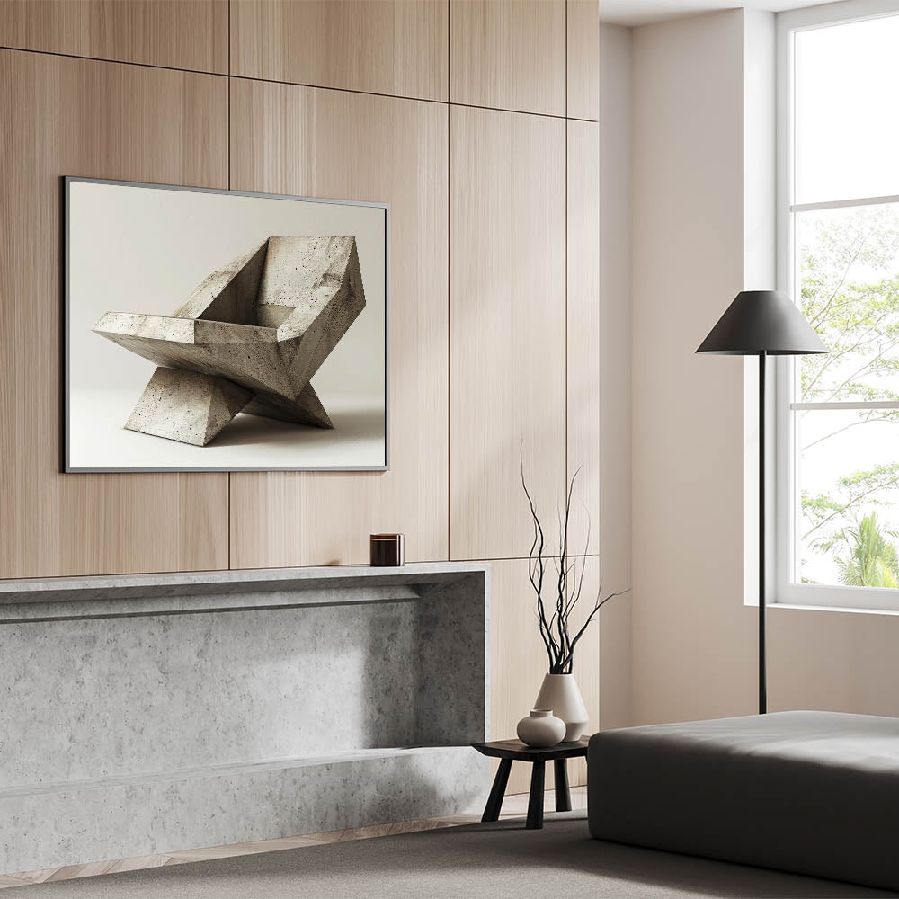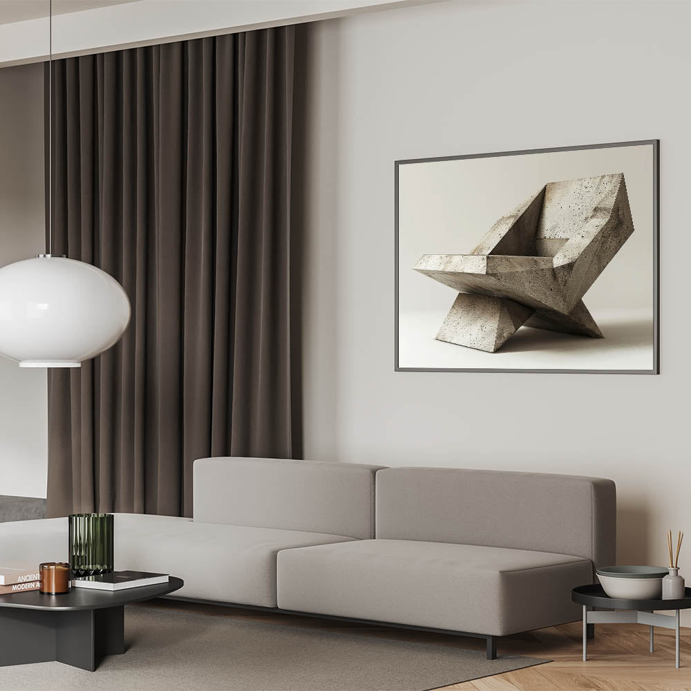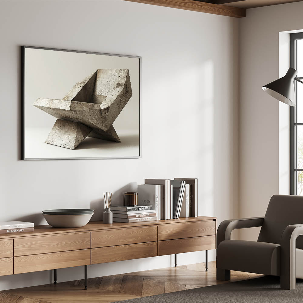 Introduce a bold architectural statement to your decor with this Brutalist Design Art featuring a striking geometric concrete sculpture. The angular, raw design reflects the Brutalist aesthetic, where raw concrete textures and sharp lines come together to create a modern masterpiece. Perfect for those who appreciate the minimalism of industrial design and mid-century modern influences, this print exudes strength and sophistication, making it a standout addition to any room.
