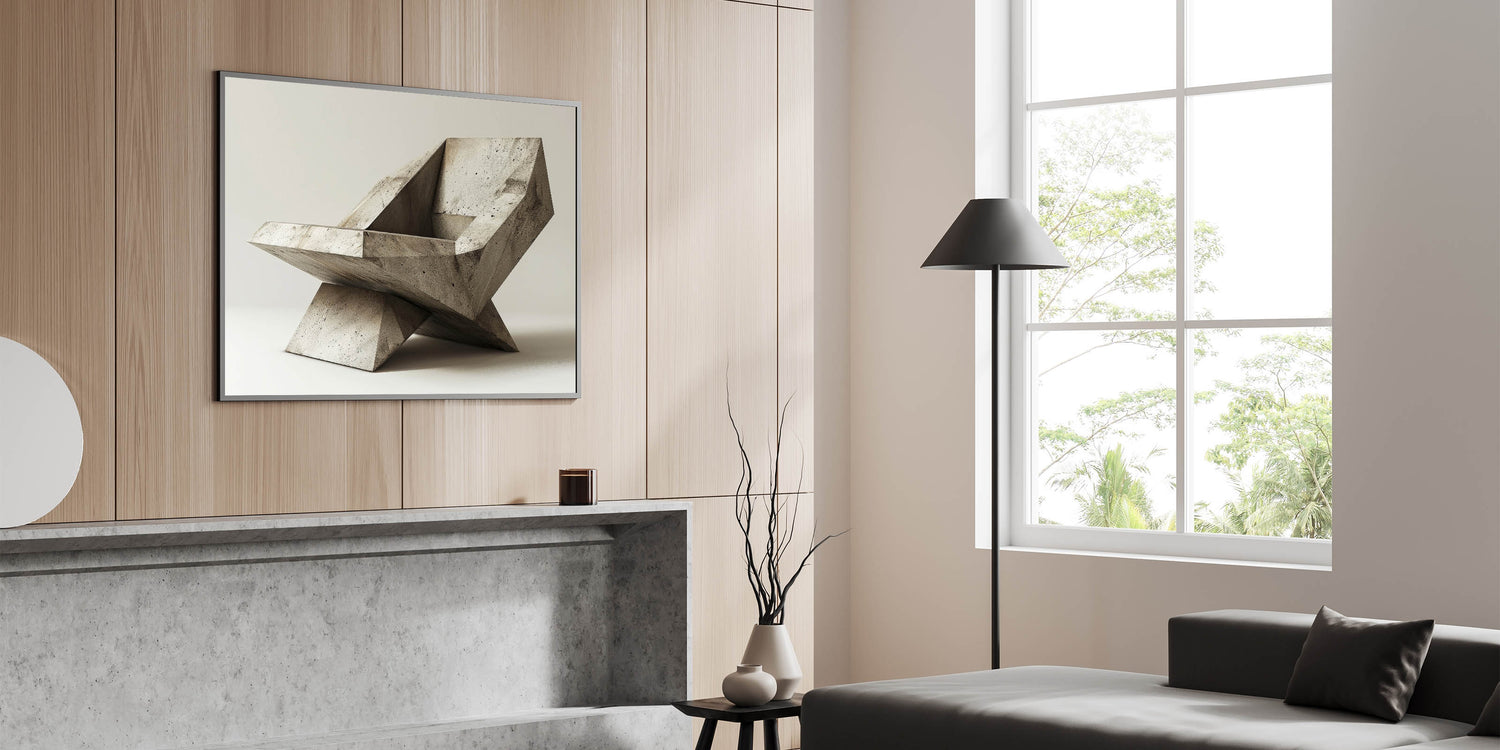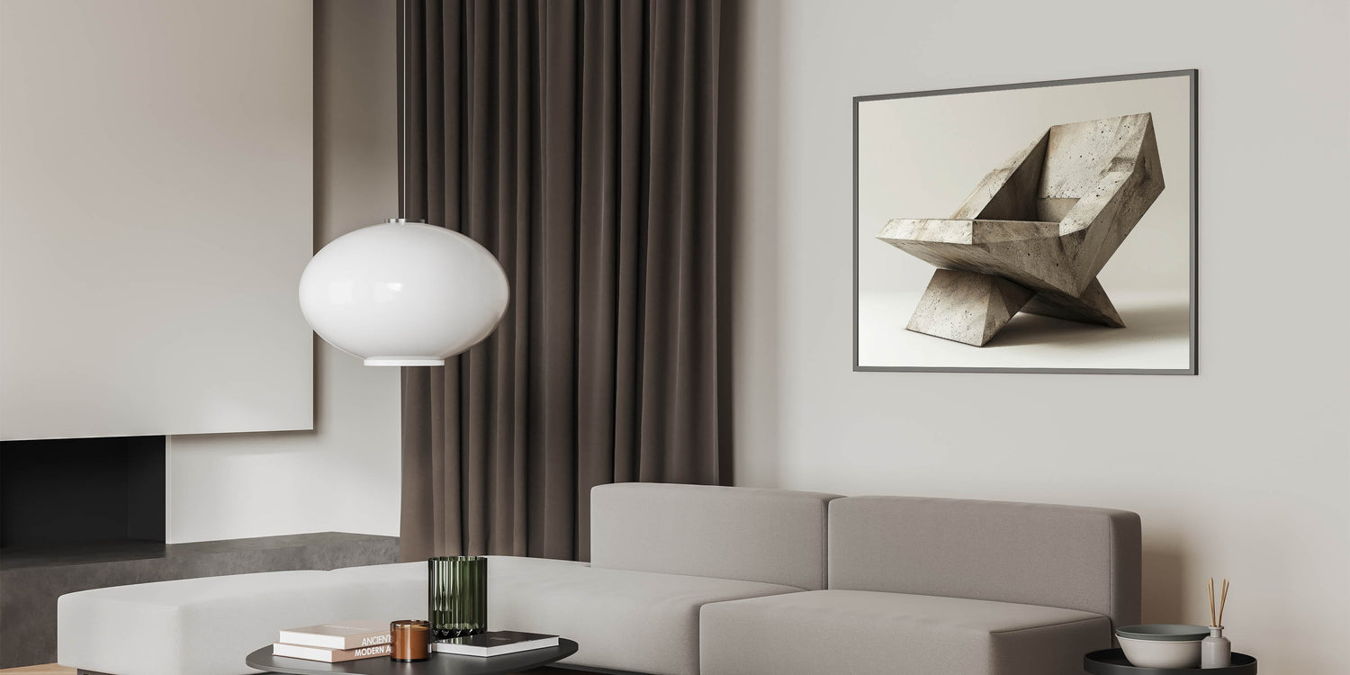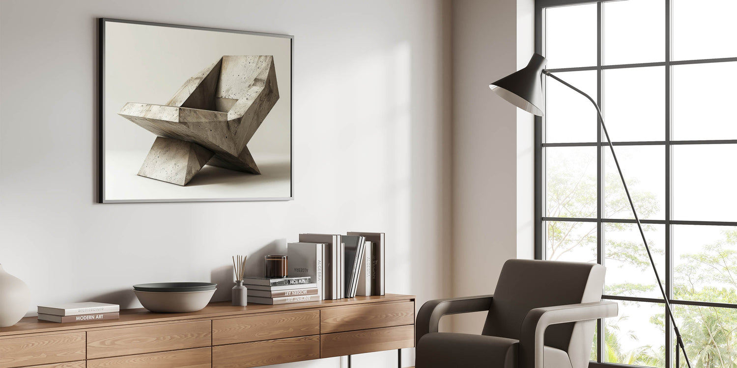 Introduce a bold architectural statement to your decor with this Brutalist Design Art featuring a striking geometric concrete sculpture. The angular, raw design reflects the Brutalist aesthetic, where raw concrete textures and sharp lines come together to create a modern masterpiece. Perfect for those who appreciate the minimalism of industrial design and mid-century modern influences, this print exudes strength and sophistication, making it a standout addition to any room.