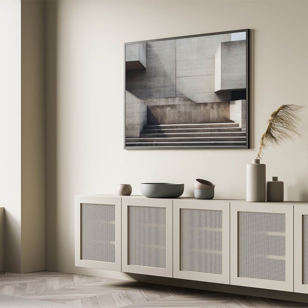 Enhance your interior with this Brutalist Wall Art, featuring clean lines and geometric forms that showcase the raw beauty of concrete textures. This architectural piece reflects the Brutalist aesthetic, with its sharp, minimalist design and mid-century modern influences. The play of light and shadow across the concrete surface adds depth, creating a visually compelling and powerful focal point for any space. This artwork is perfect for those who appreciate industrial design canvas and minimalist decor.