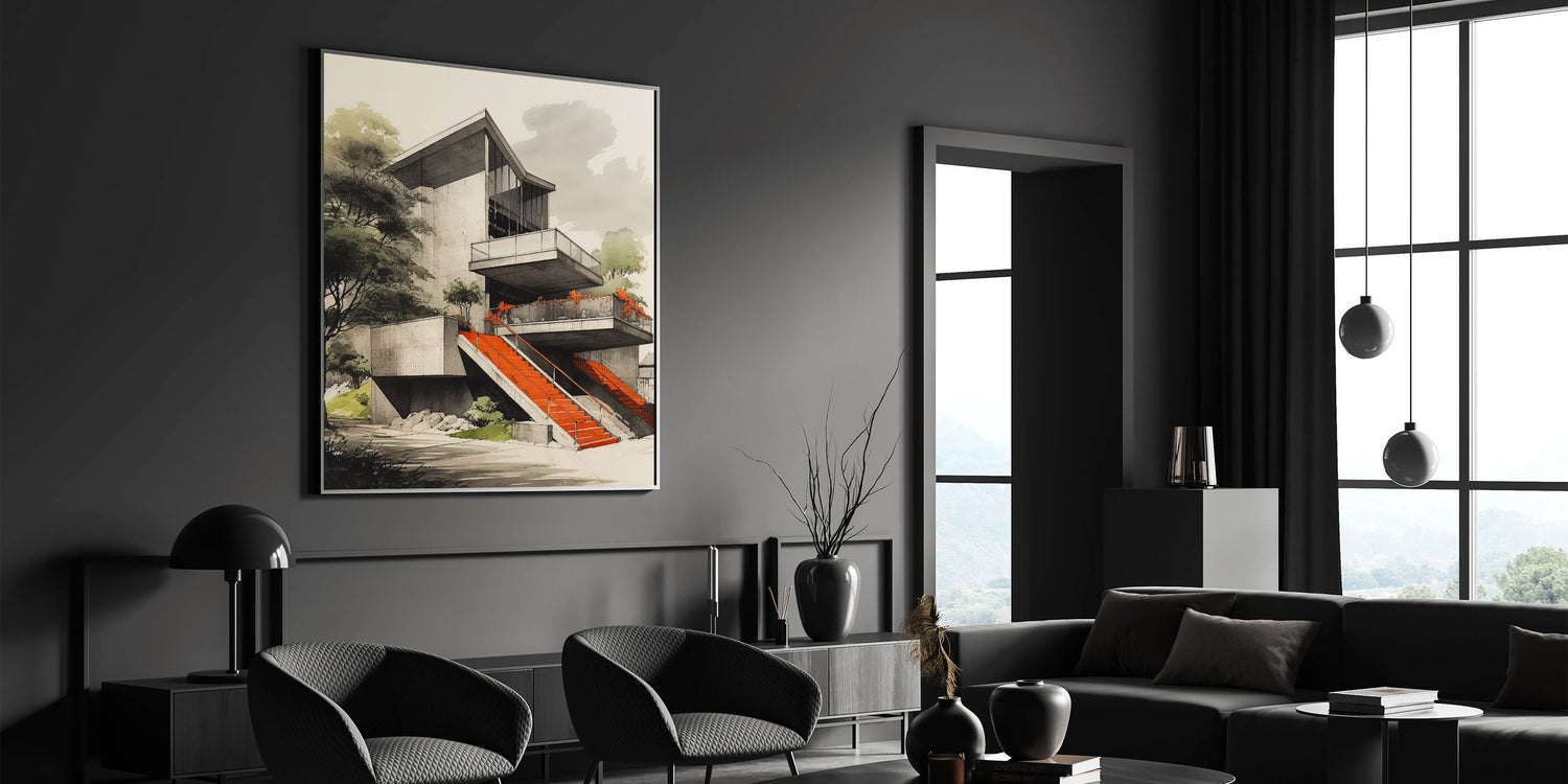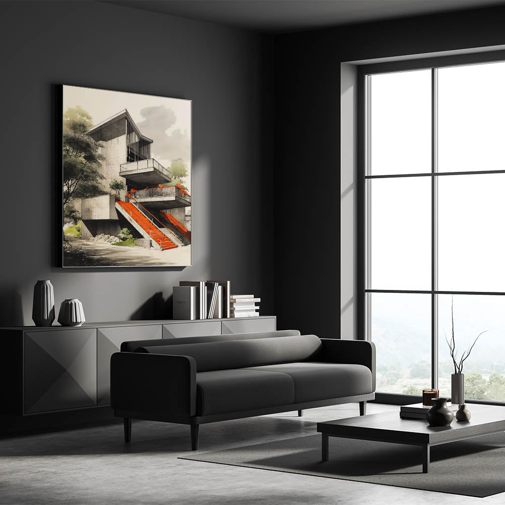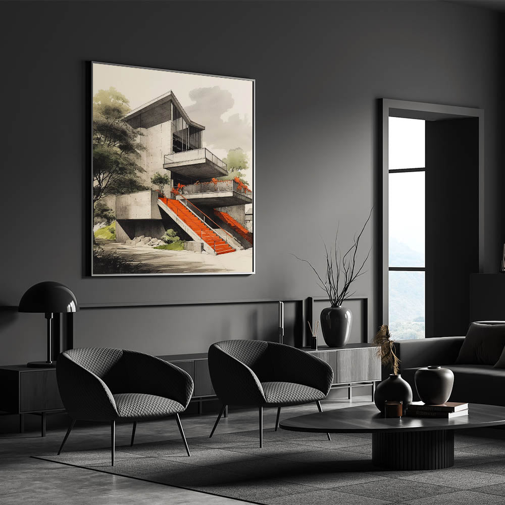Enhance your living space with this stunning piece of Brutalist wall art, featuring a bold, geometric structure with raw concrete textures and vivid orange accents. This design captures the essence of modern Brutalism, blending industrial architecture with minimalist decor for a striking visual impact. The strong architectural influences and mid-century modern aesthetic make this artwork perfect for those who appreciate clean lines and urban style.