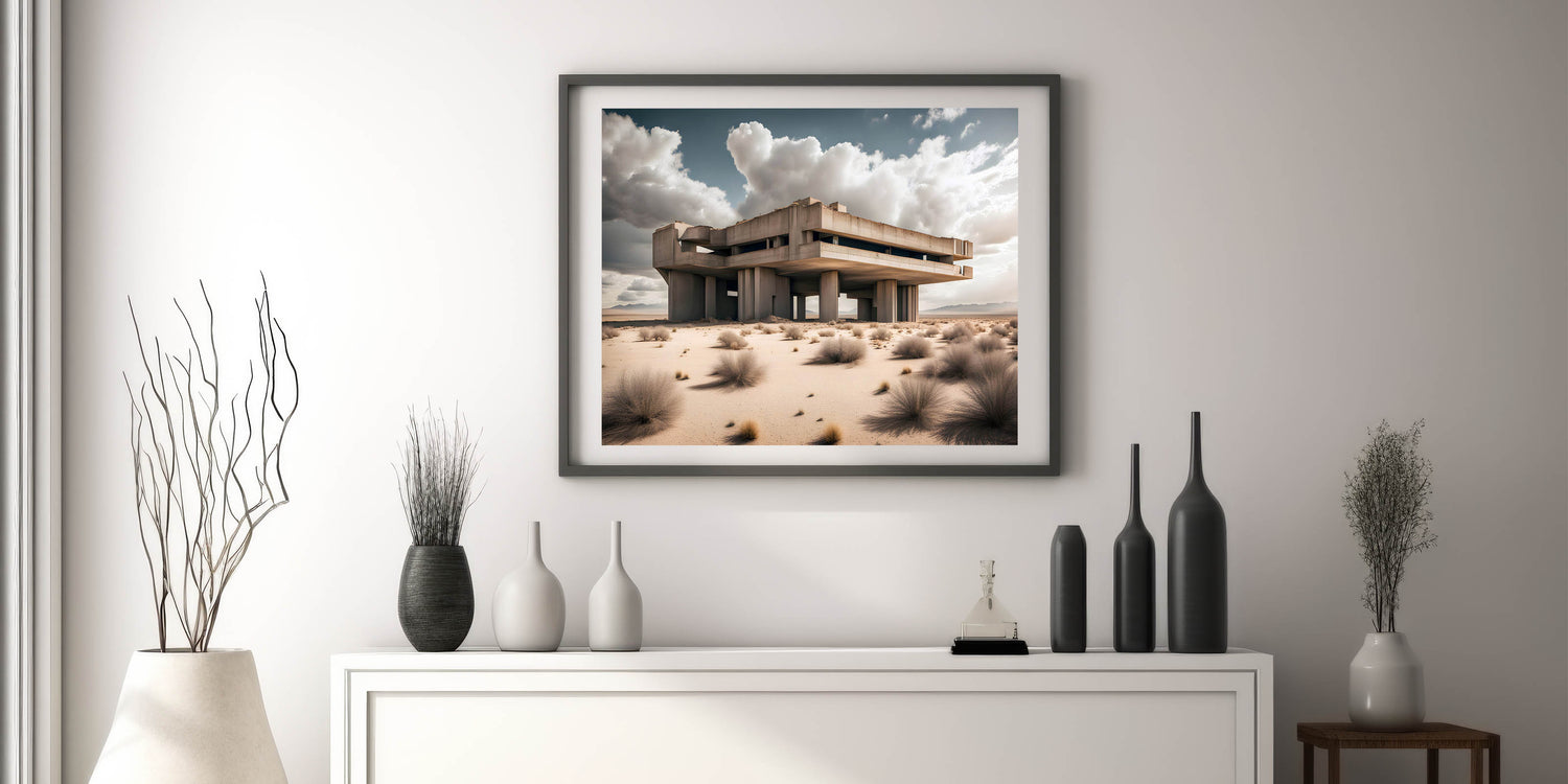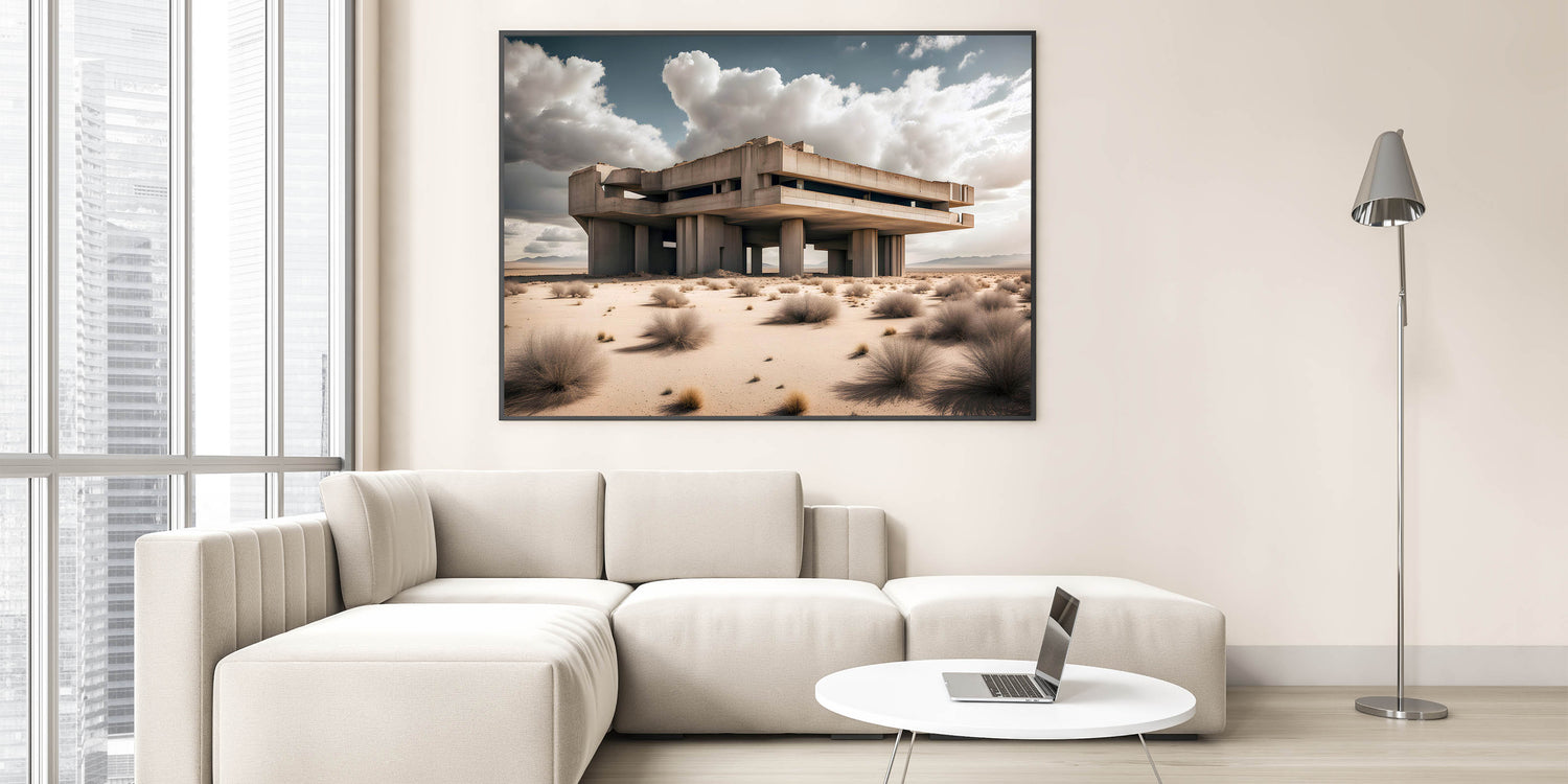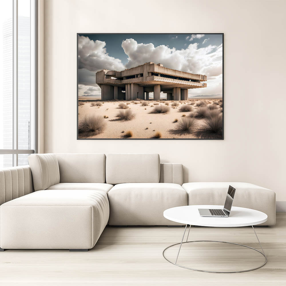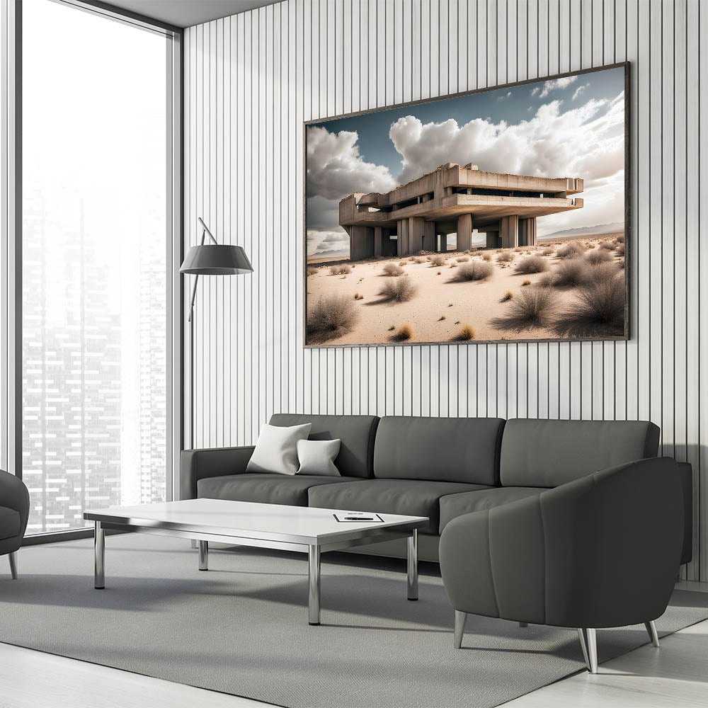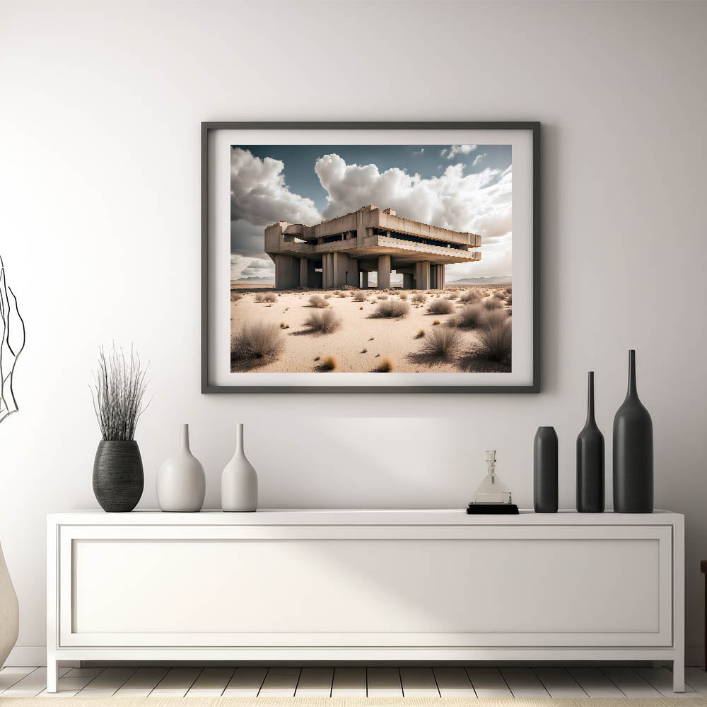 Explore the raw beauty of Brutalist architecture with this unique Brutalist Wall Art set in a vast desert landscape. The powerful geometric structure, made from concrete textures, rises from the barren surroundings, reflecting the iconic Brutalist aesthetic. This artwork is perfect for those who admire the bold simplicity of modern industrial design and mid-century modern influences. The contrast between the harsh, angular concrete and the soft desert setting creates a stunning visual statement, perfect for minimalist and industrial interiors.