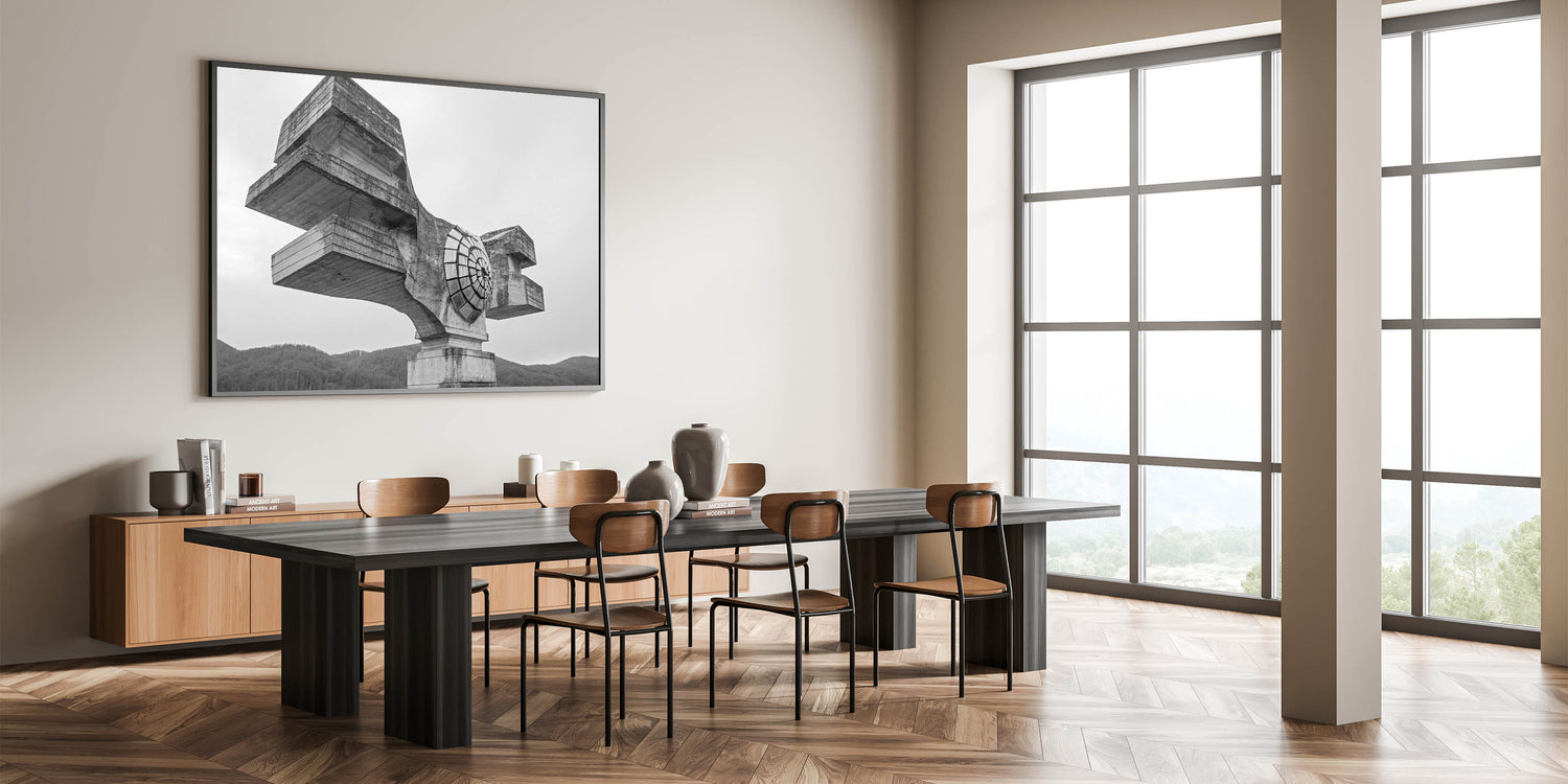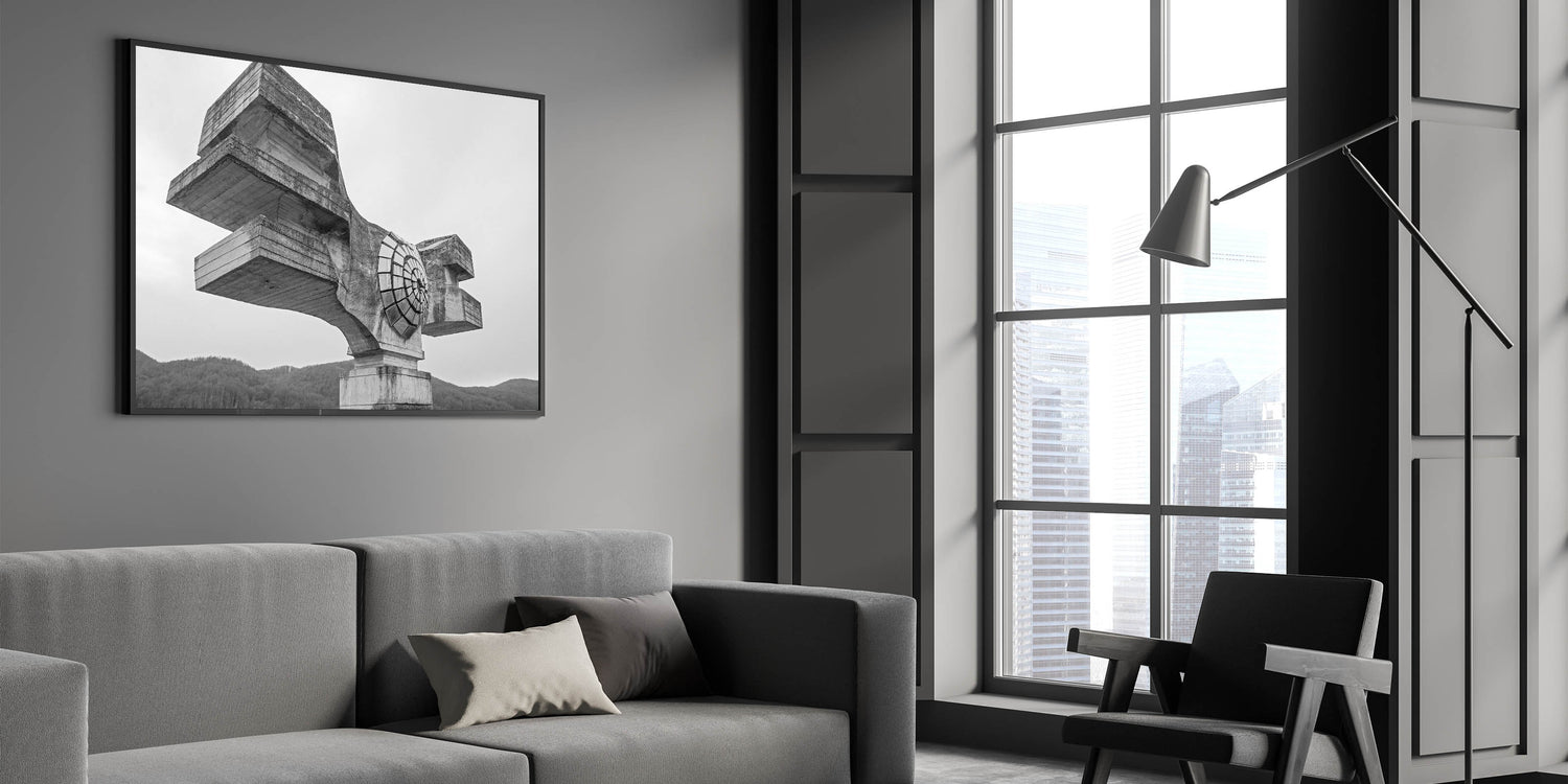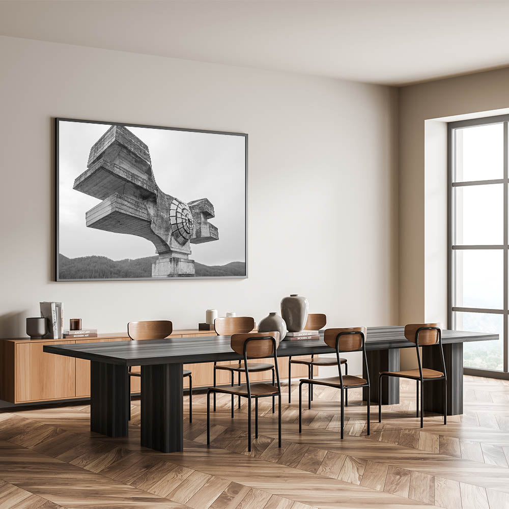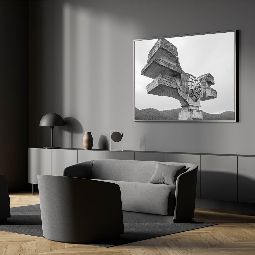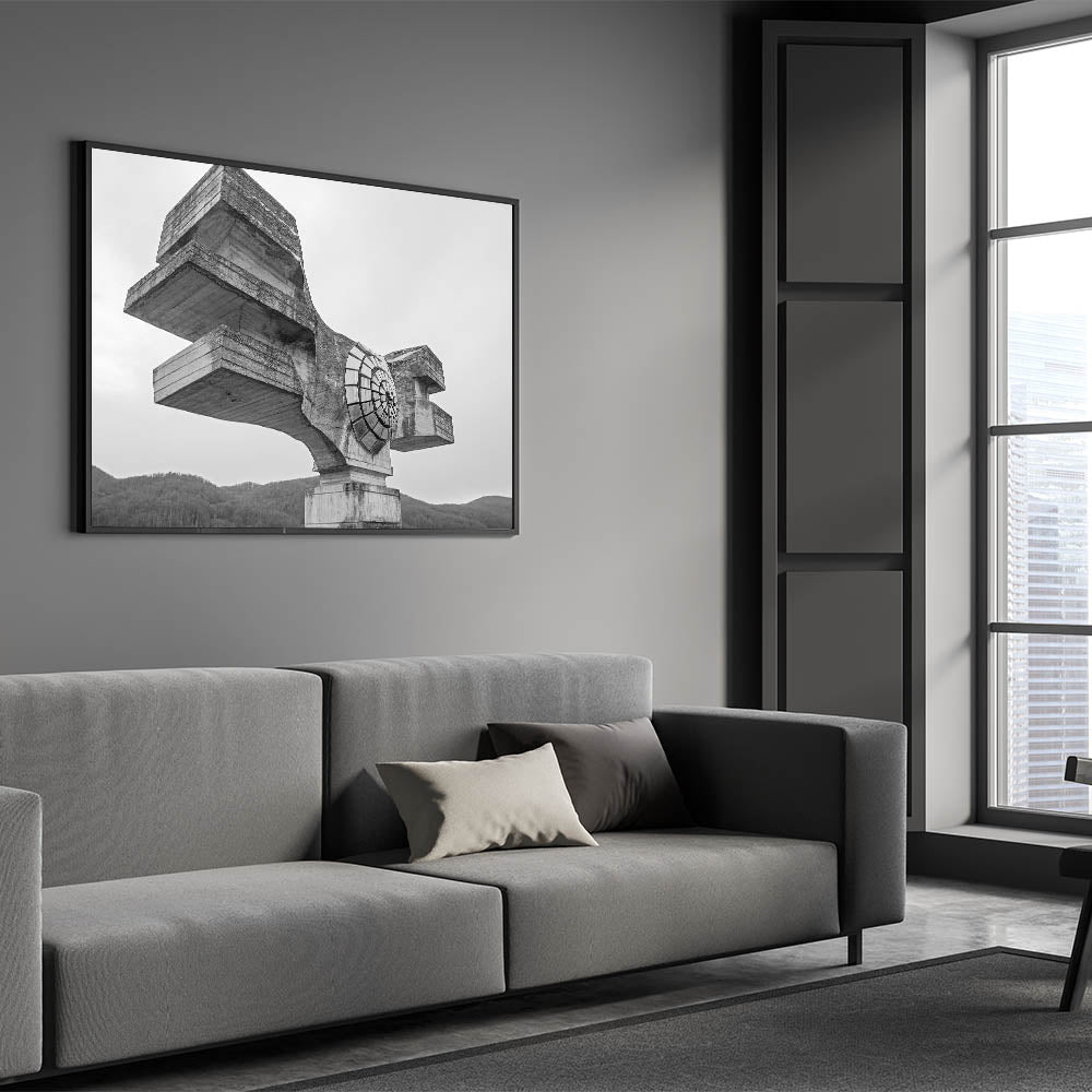 Add a bold architectural statement to your decor with this Brutalist Wall Art, showcasing a striking geometric concrete structure. The design draws inspiration from the Brutalist aesthetic, featuring raw concrete textures and industrial influences that make it a standout piece in any modern interior. This imposing structure, with its mid-century modern appeal, evokes a sense of strength and minimalism, perfect for those looking to enhance their space with industrial design canvas.