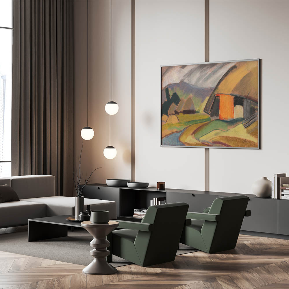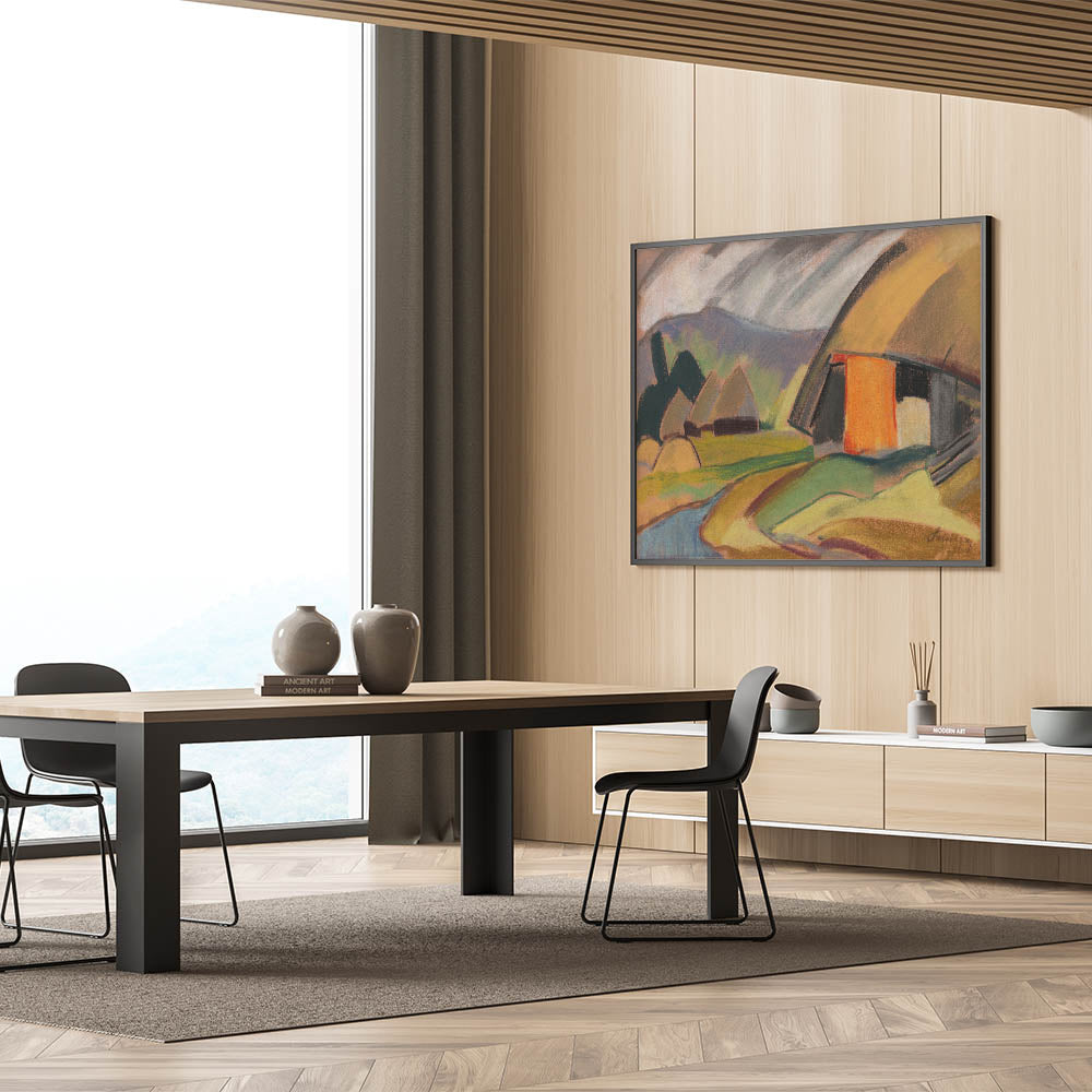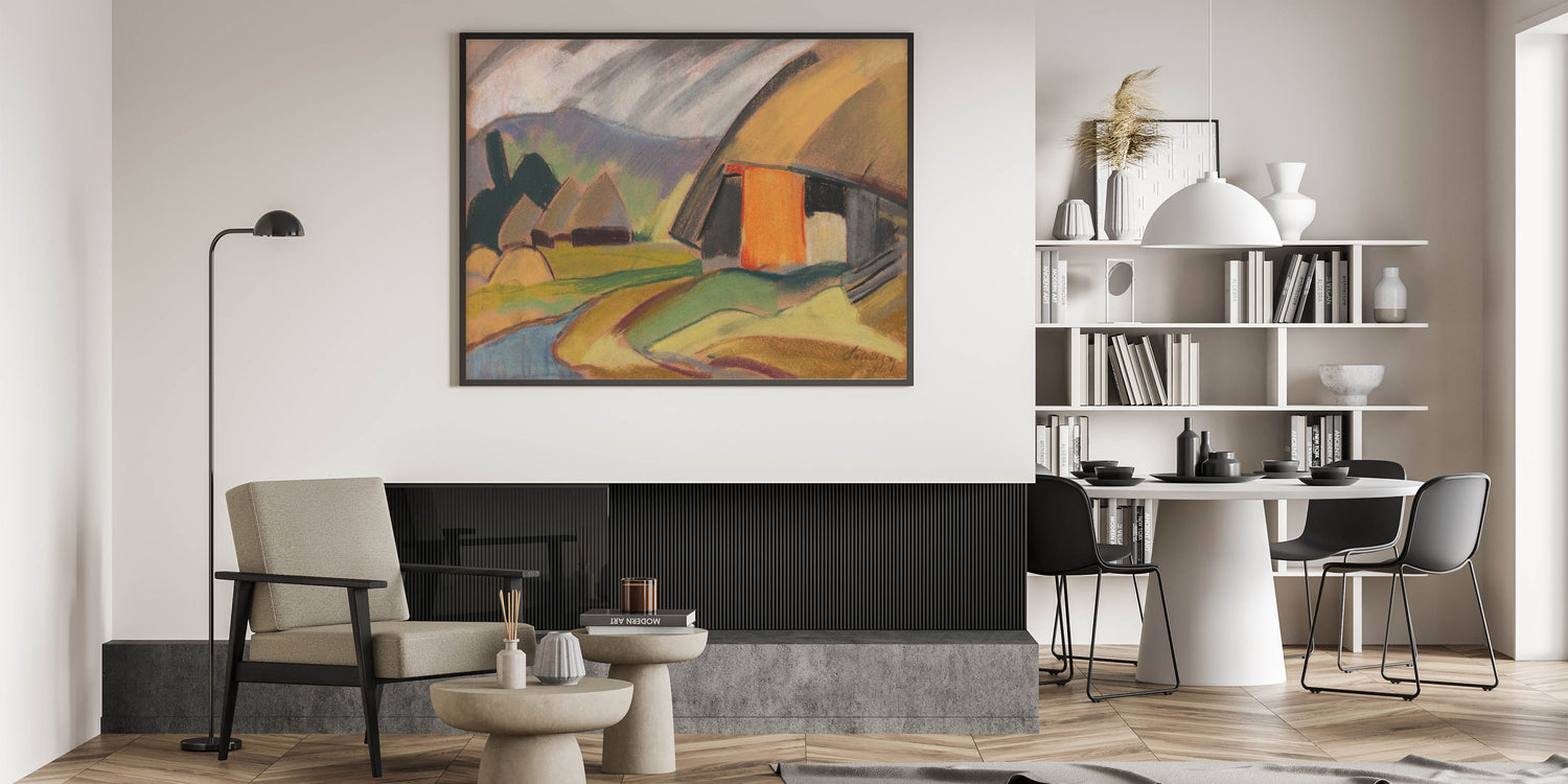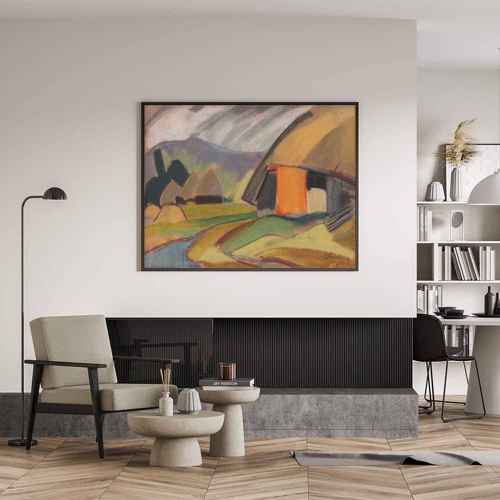 Introduce a touch of rural serenity to your space with "By the Village," an exquisite piece of abstract modern art. This contemporary artwork blends soft, earthy tones with bold strokes of orange and green, capturing a peaceful countryside scene. Perfect for trendy home decor, it evokes a sense of calm while adding a modern design element to your walls.