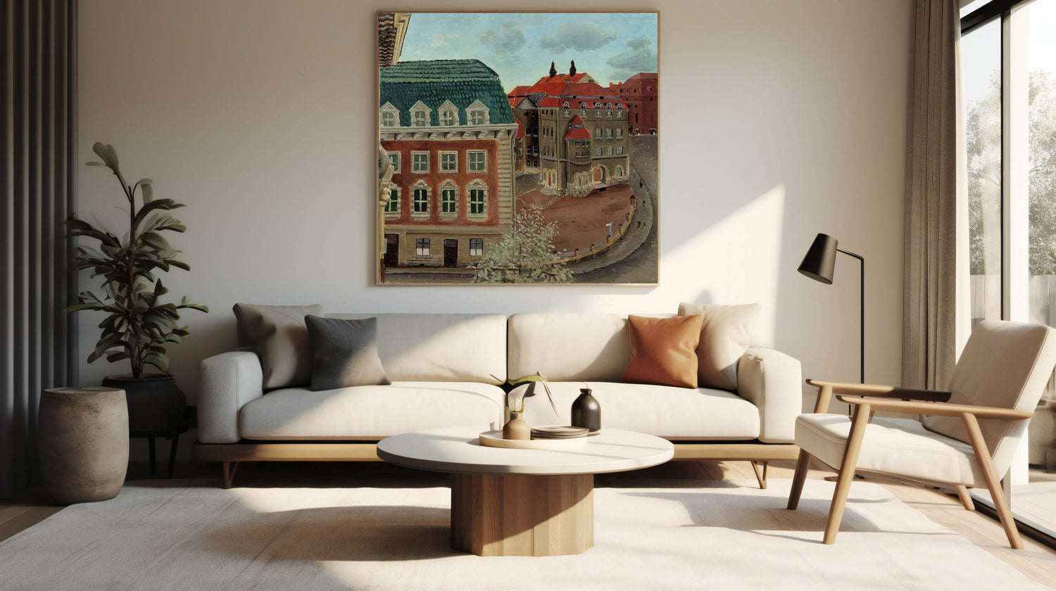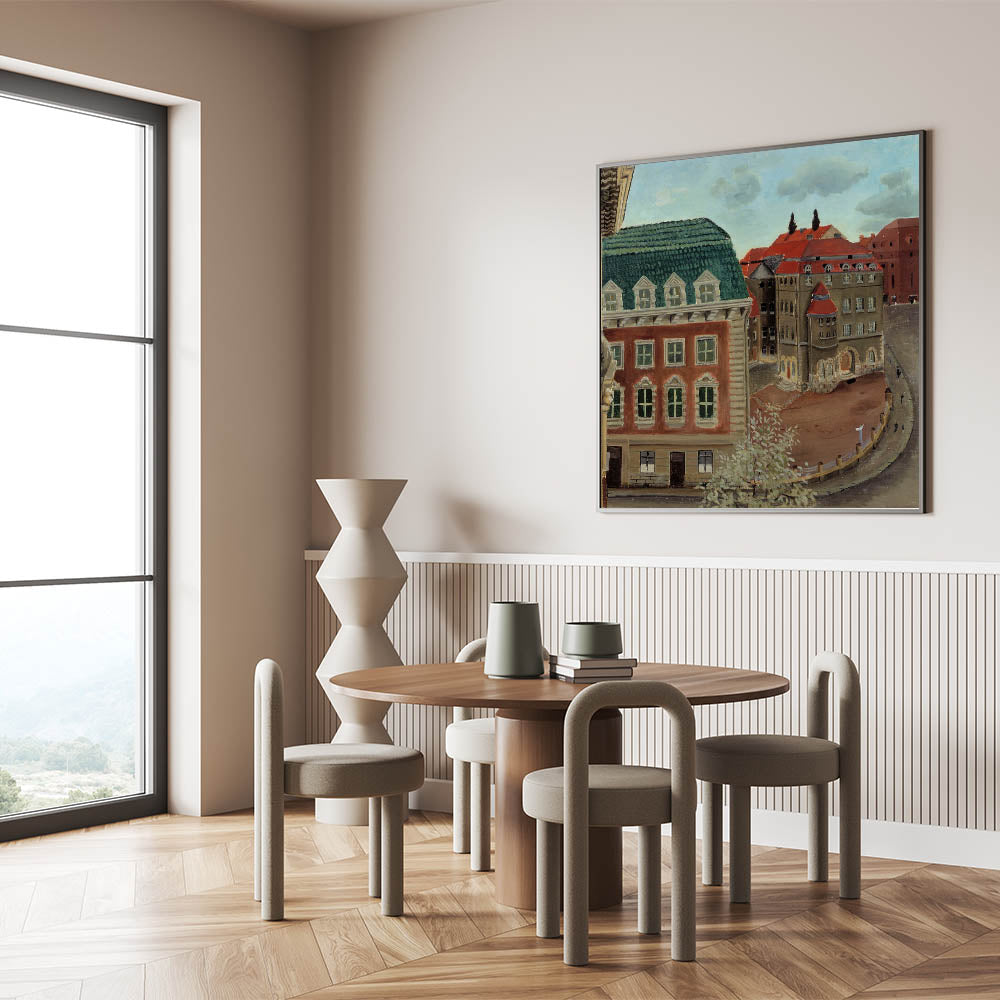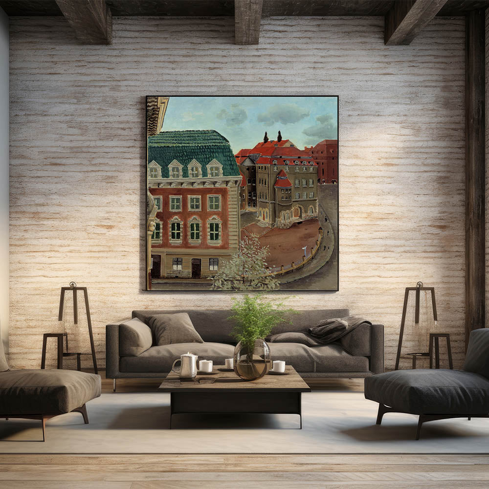 Enhance your space with this charming cityscape artwork that captures the architectural beauty of classic buildings and rooftops. The piece features rich, earthy tones with accents of green and red, illustrating a peaceful street view that combines historical elegance with modern artistic style. Perfect for those who appreciate unique modern art, this artwork brings a timeless quality to any interior decor.