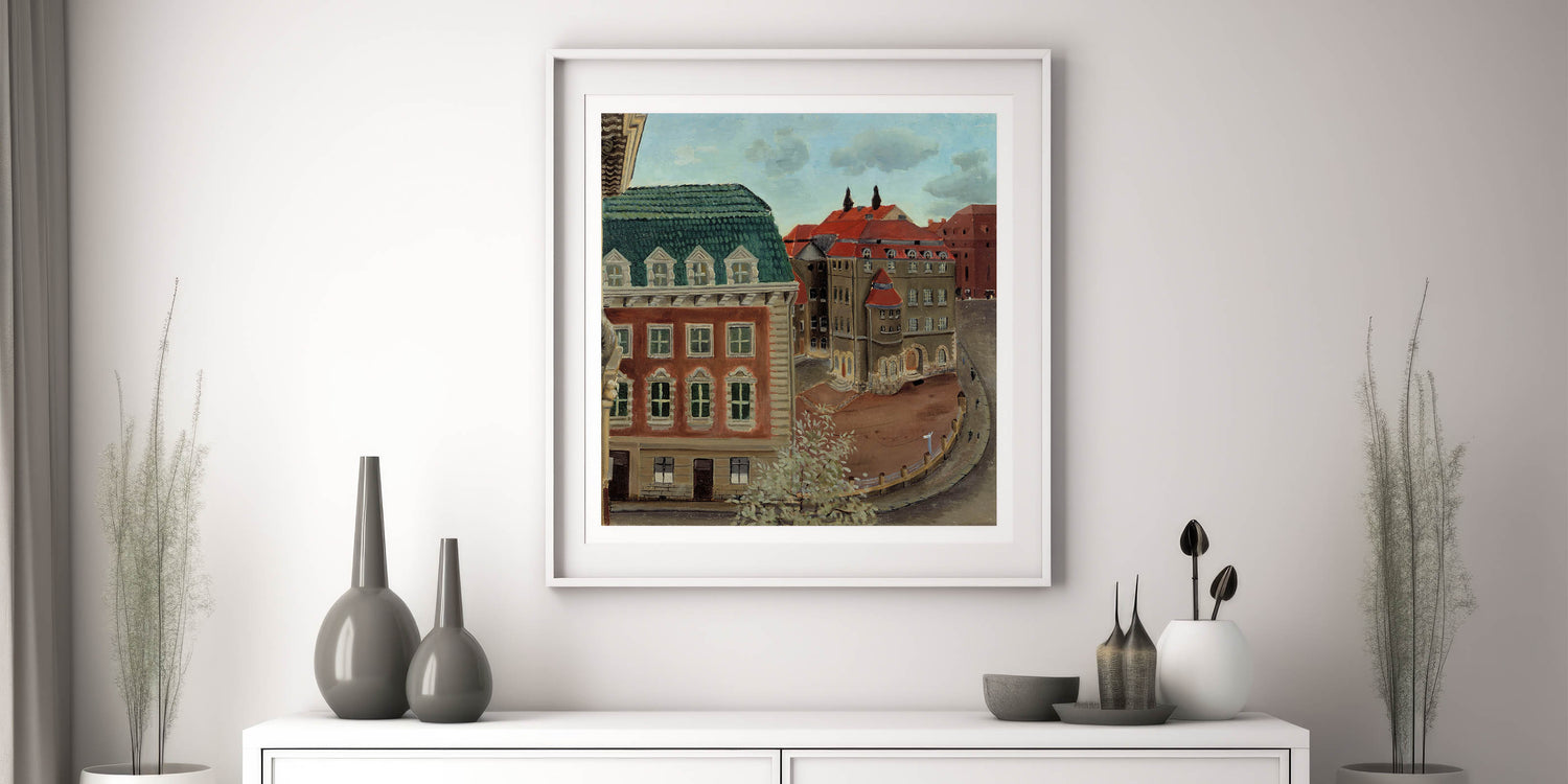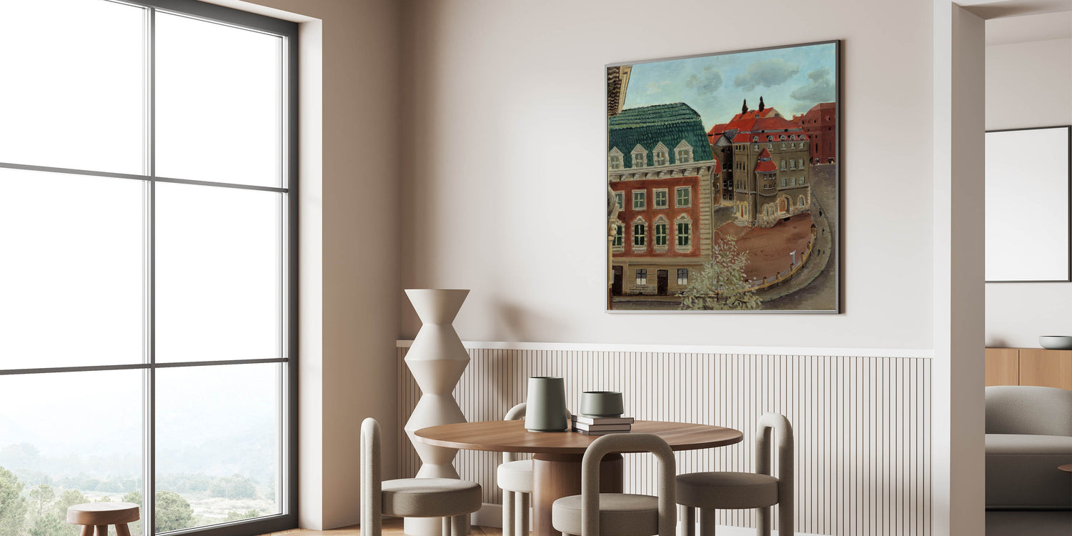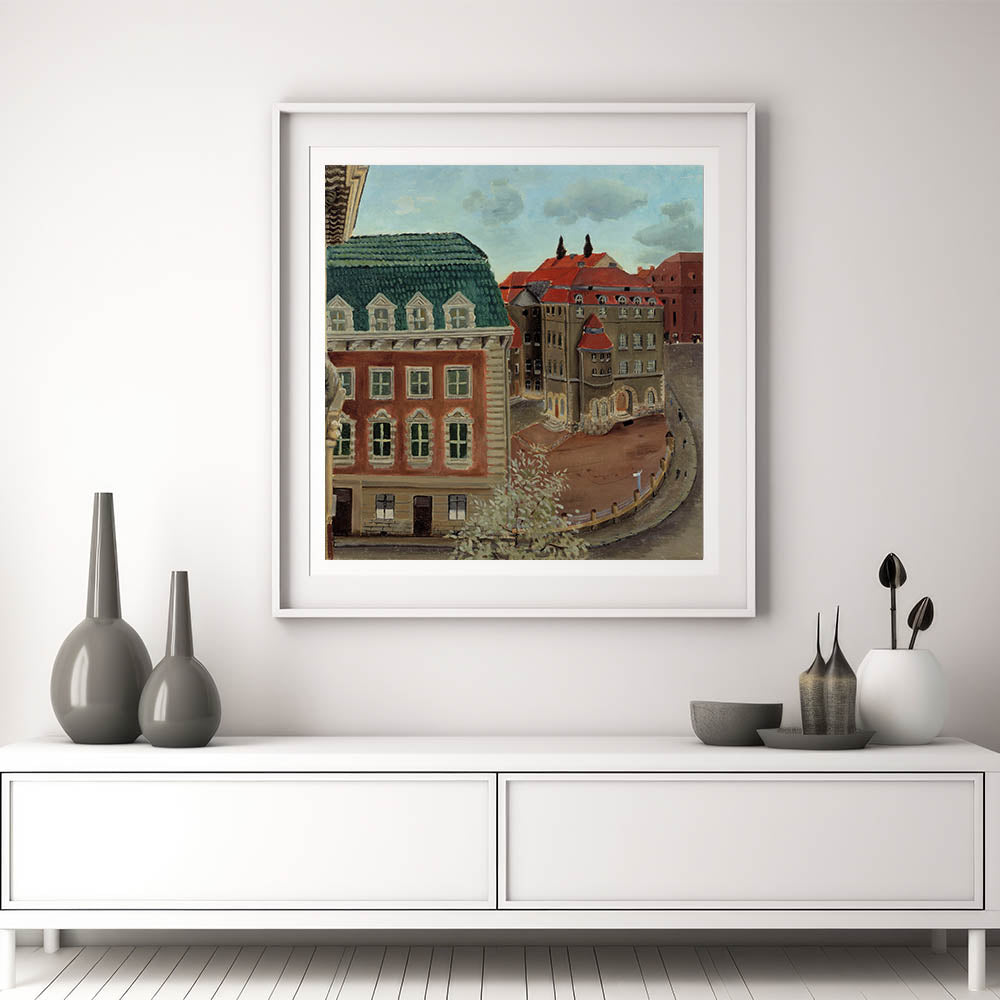 Enhance your space with this charming cityscape artwork that captures the architectural beauty of classic buildings and rooftops. The piece features rich, earthy tones with accents of green and red, illustrating a peaceful street view that combines historical elegance with modern artistic style. Perfect for those who appreciate unique modern art, this artwork brings a timeless quality to any interior decor.