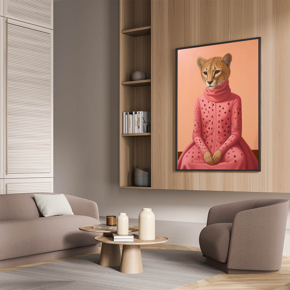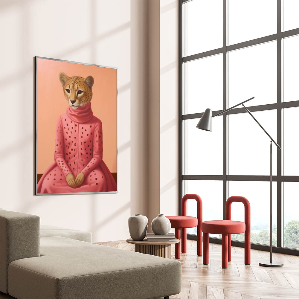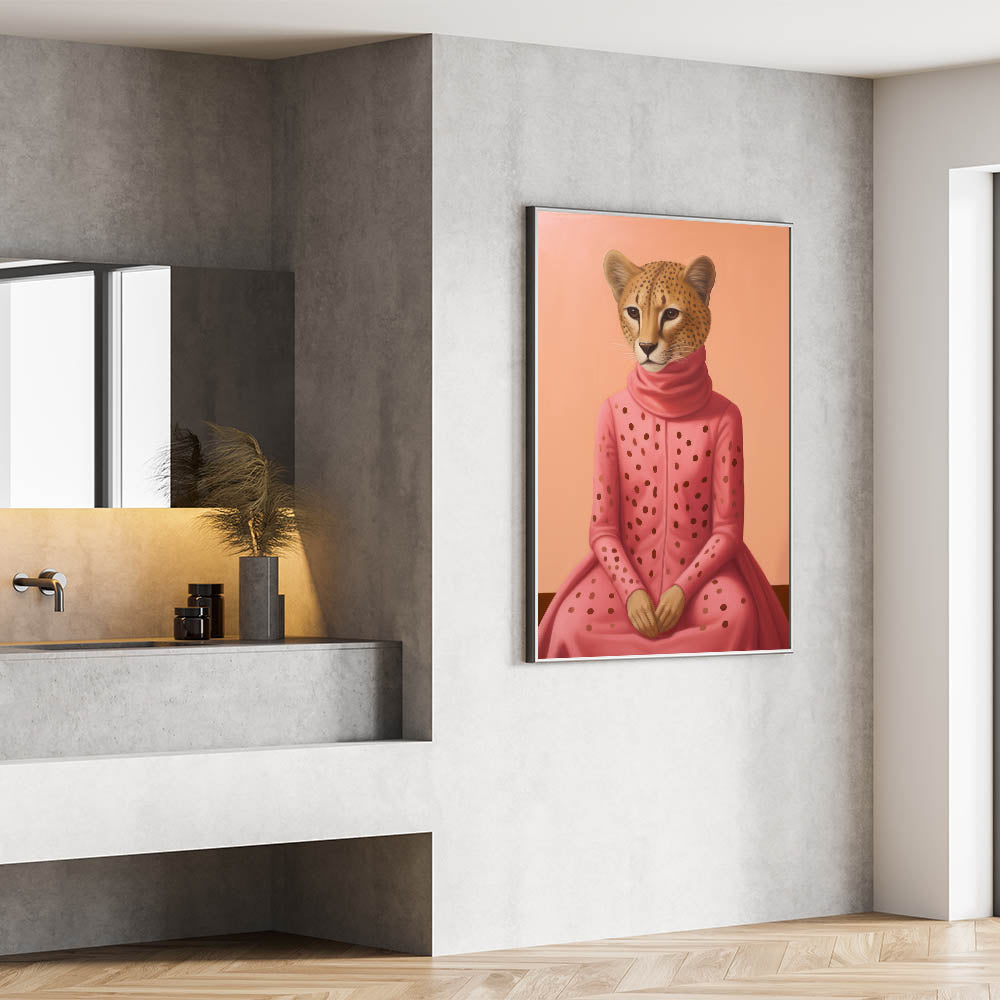 Explore the fusion of fashion and wildlife with our Chic Electric Cheetah Portrait Art. This striking piece features a cheetah elegantly dressed in a pink polka-dotted outfit, set against a soft peach background. The unique blend of animal and human elements, combined with vibrant colors, creates a captivating and modern visual experience, perfect for those seeking electric-themed decor that stands out. Ideal for living rooms, offices, or creative spaces, this artwork adds a touch of playful elegance and sophistication.
