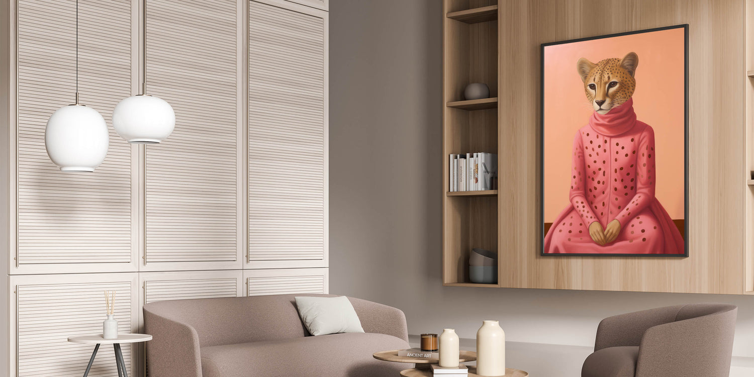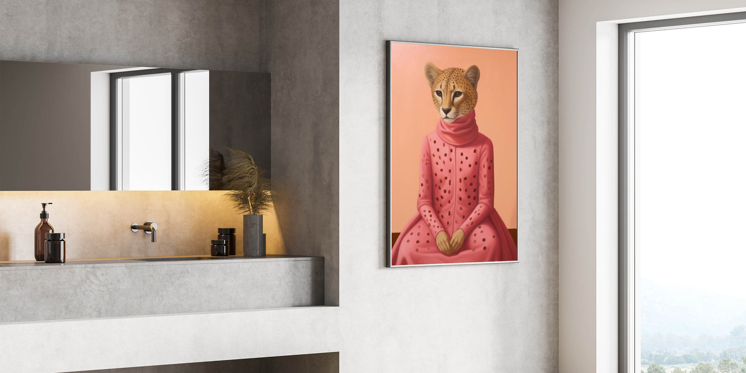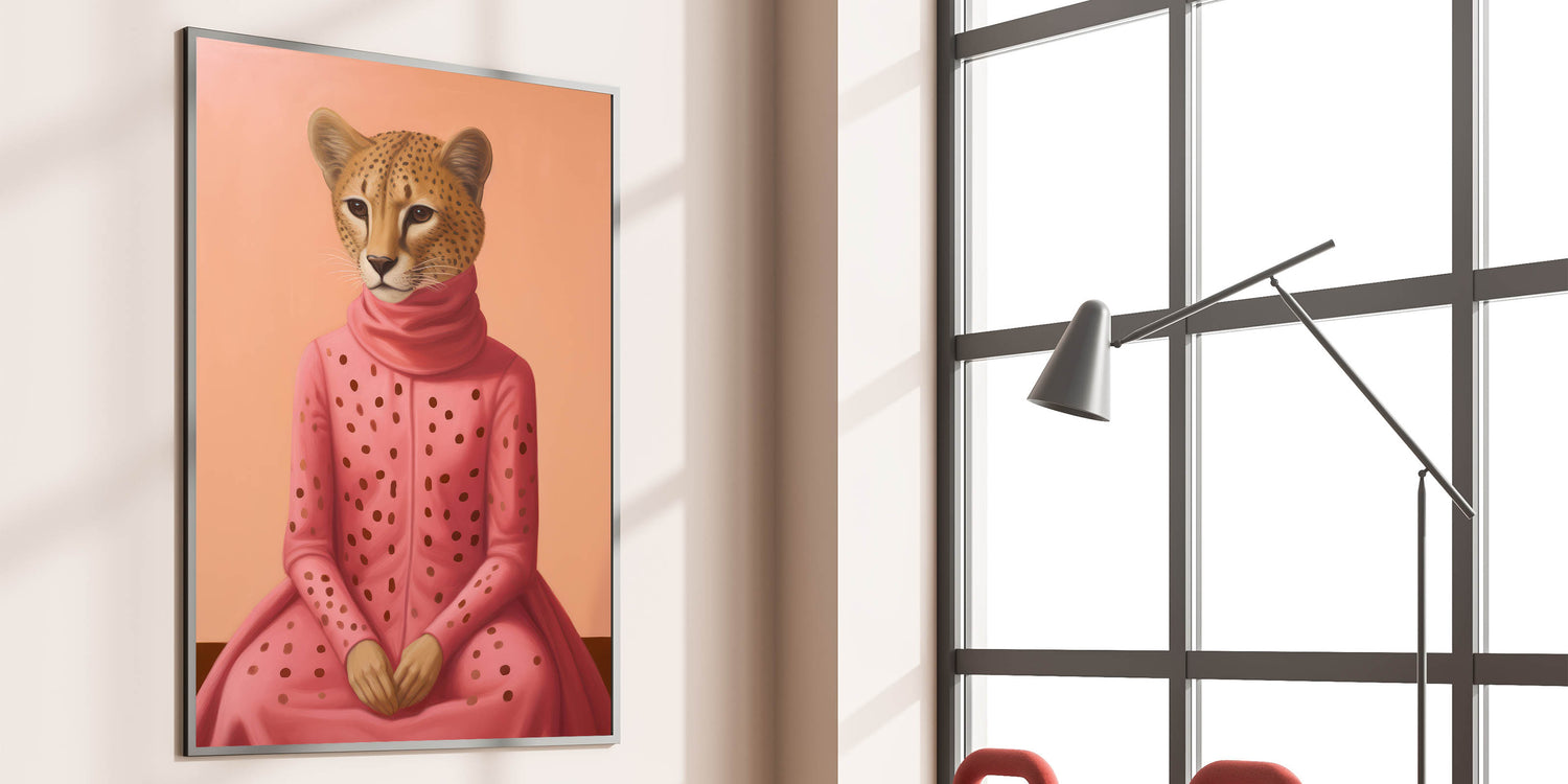 Explore the fusion of fashion and wildlife with our Chic Electric Cheetah Portrait Art. This striking piece features a cheetah elegantly dressed in a pink polka-dotted outfit, set against a soft peach background. The unique blend of animal and human elements, combined with vibrant colors, creates a captivating and modern visual experience, perfect for those seeking electric-themed decor that stands out. Ideal for living rooms, offices, or creative spaces, this artwork adds a touch of playful elegance and sophistication.