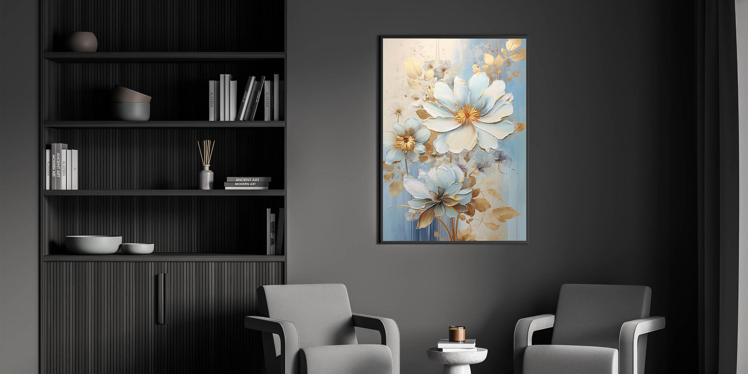 Enhance your home with the timeless beauty of this chic floral glam wall art. Featuring delicate light blue blooms with gold accents, this luxurious artwork adds an elegant touch to any modern glam-inspired interior. The intricate detailing and soft color palette create a serene yet sophisticated ambiance, perfect for creating a tranquil focal point in your living space.