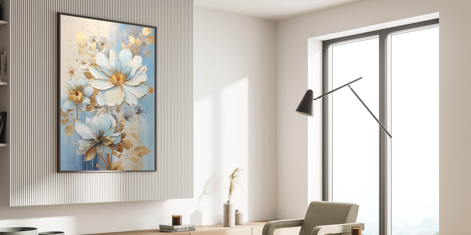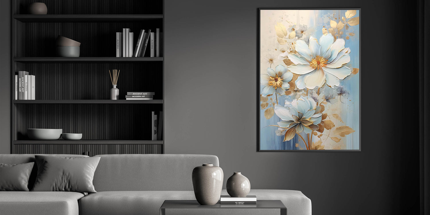 This glamorous floral artwork is part of our exclusive glam wall art collection, designed to bring a refined elegance to your home decor. Whether you're enhancing a bedroom or living space, this piece will add a touch of serenity and luxury to your home, effortlessly blending beauty and sophistication.