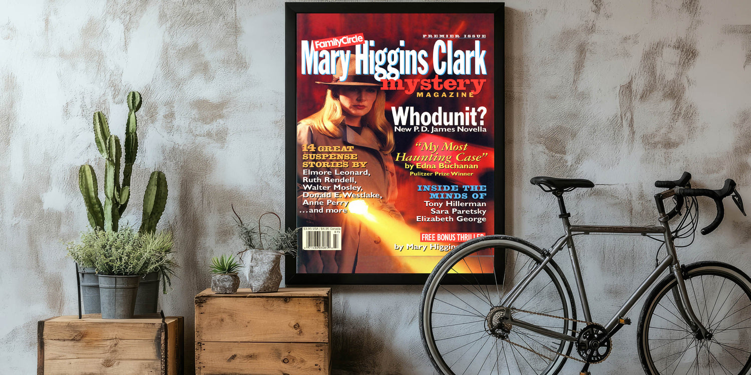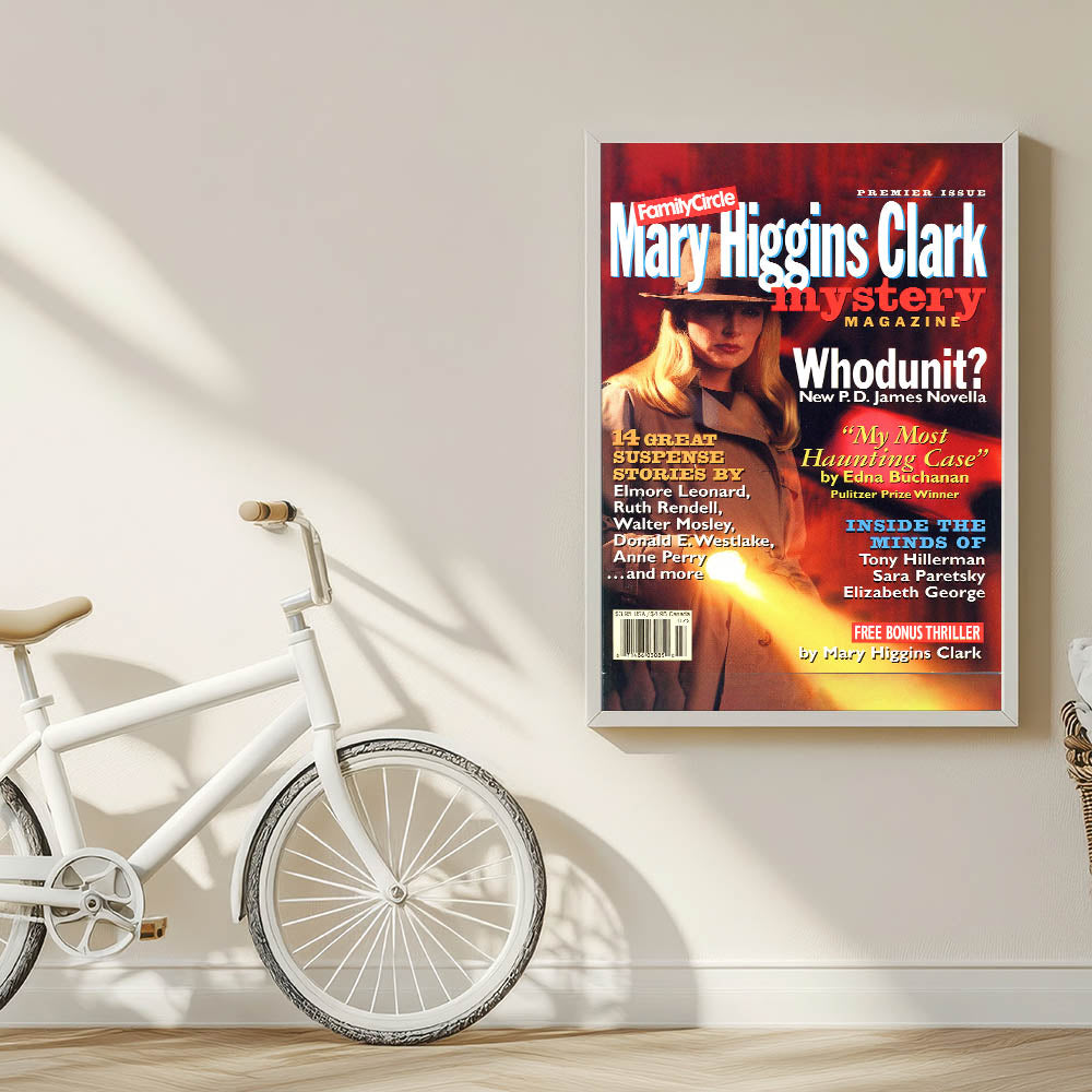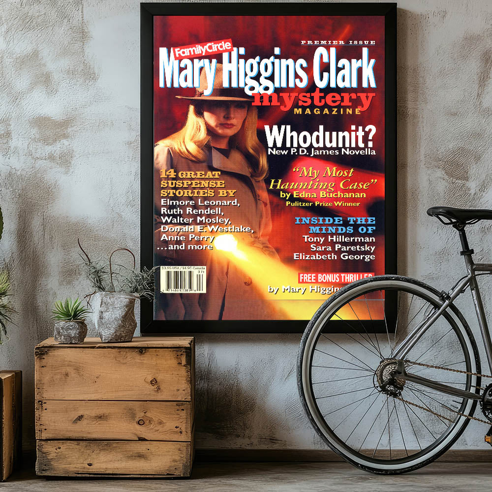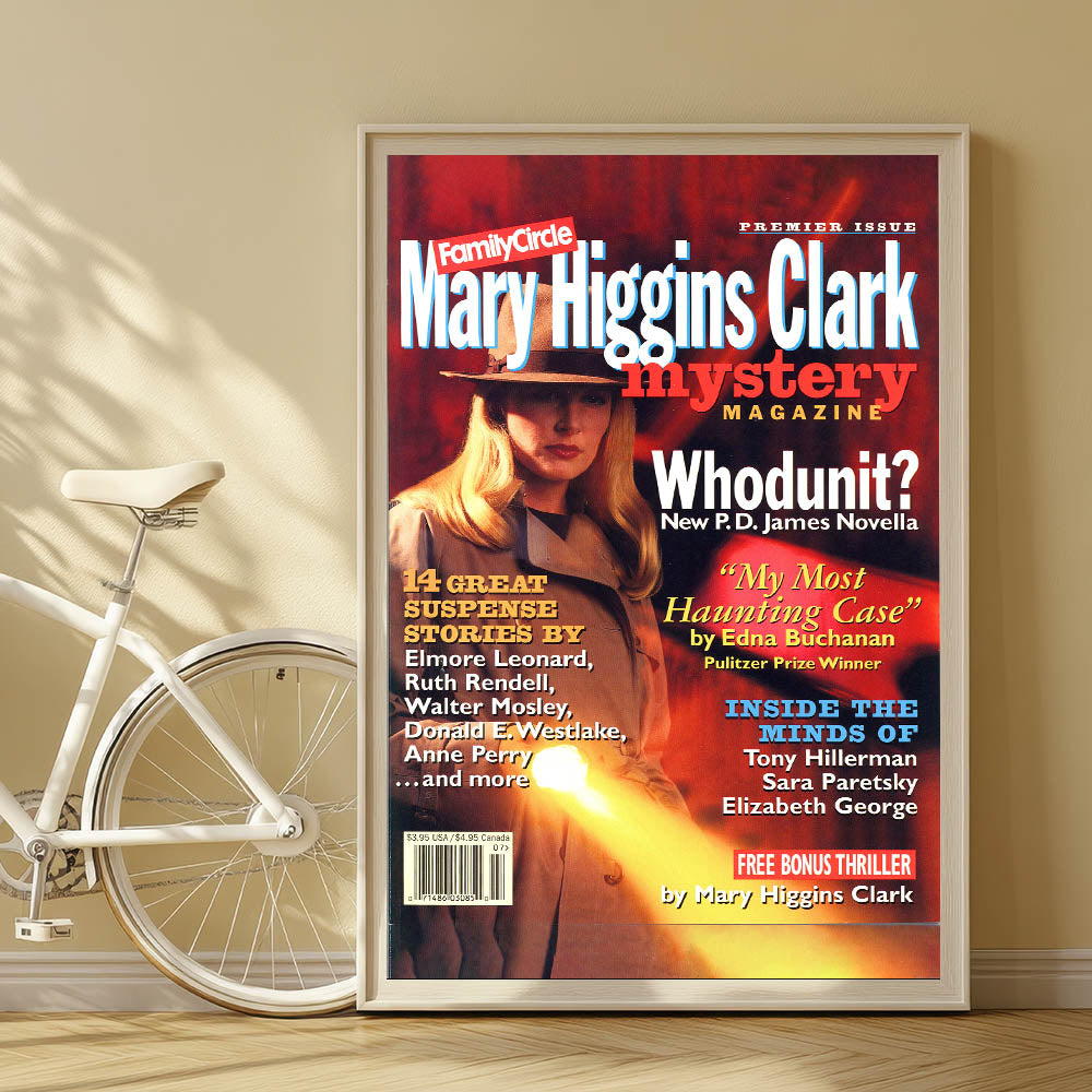 Bring a nostalgic touch to your home decor with this vintage Mary Higgins Clark Mystery Magazine Cover art. Featuring the premier issue with bold typography and a striking illustration, this retro magazine cover print is perfect for collectors and those looking to add classic magazine wall decor to their space. Its timeless appeal and iconic design will transport you back to the golden era of mystery literature.