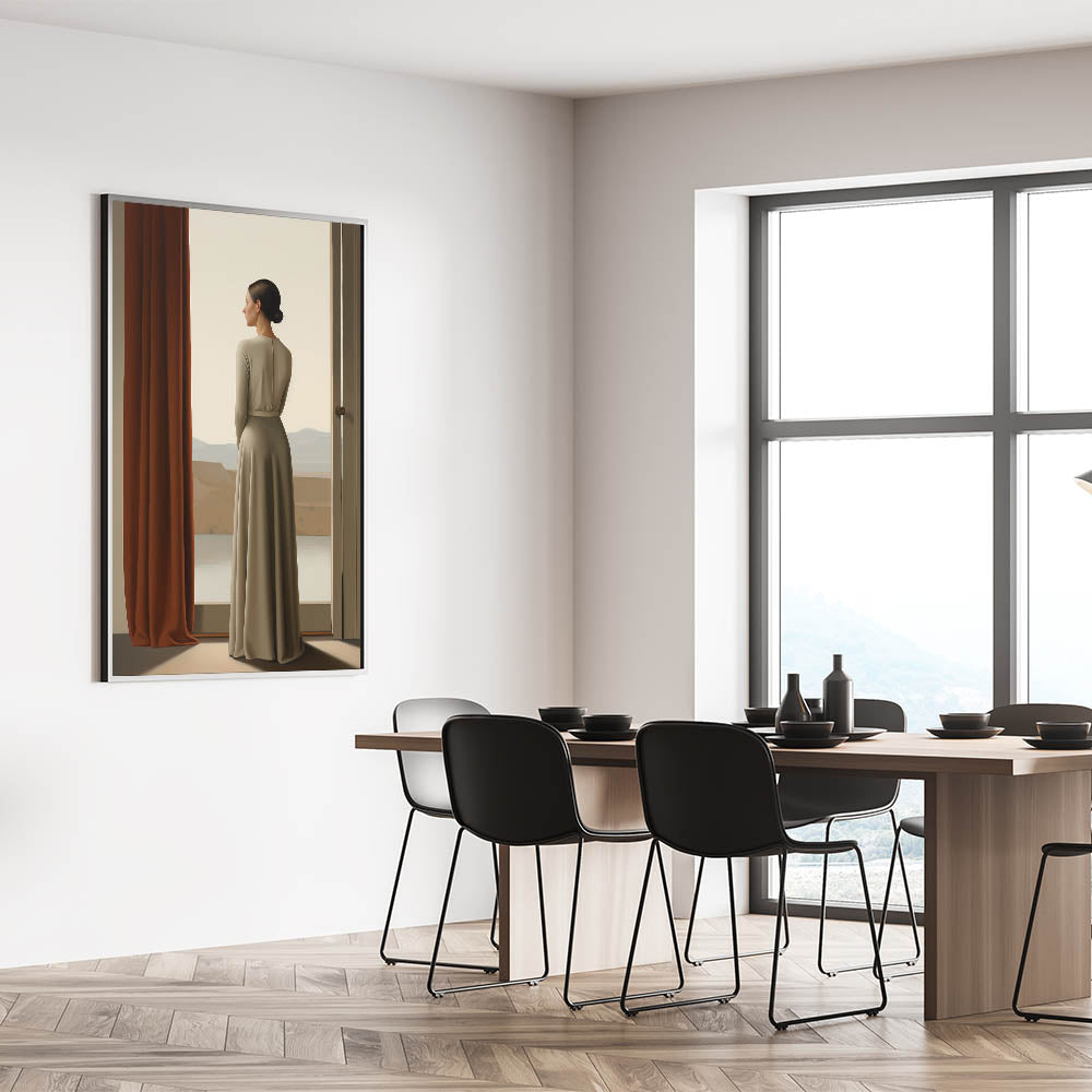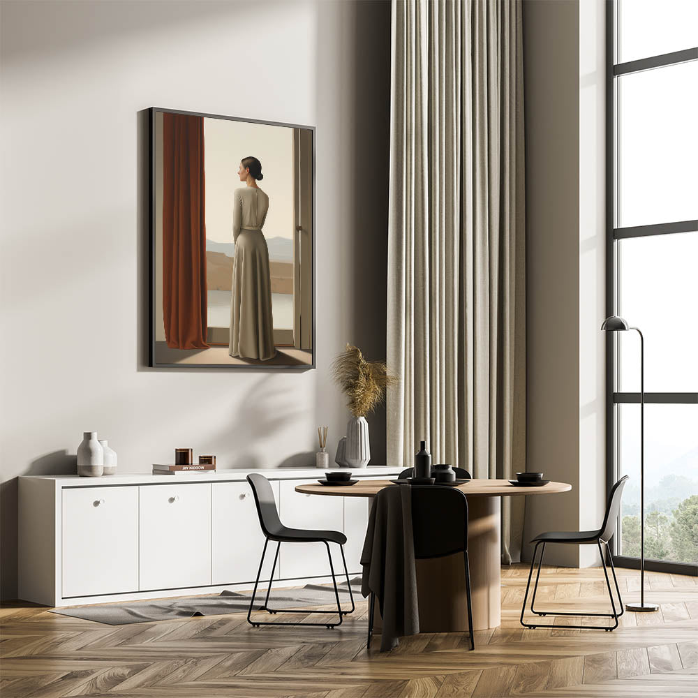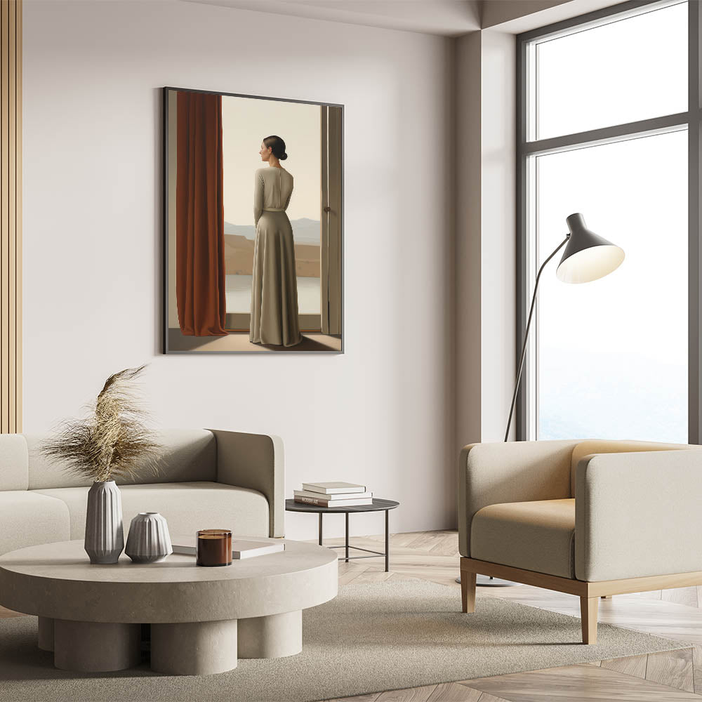 This nostalgic portrait art captures a moment of quiet reflection, depicting a woman gazing out of a sunlit window. The soft, neutral tones and delicate light create an atmosphere of serenity, making this timeless portrait print an ideal addition to any refined interior. The simplicity of the composition enhances its historic portrait decor appeal, perfect for those who appreciate understated elegance.
