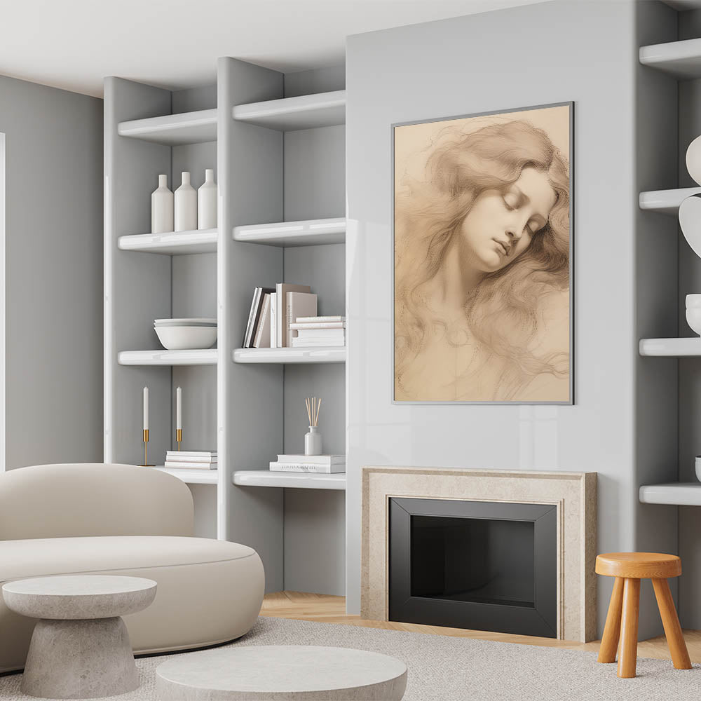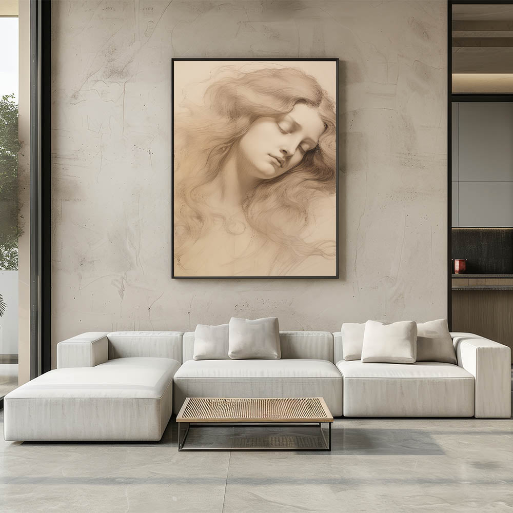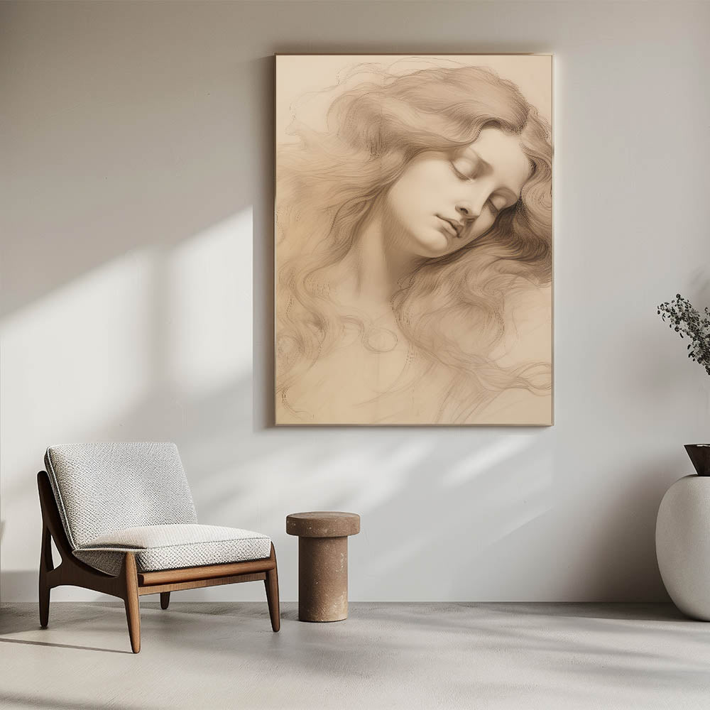This timeless portrait print captures the serene beauty of a woman with flowing hair, rendered in soft, delicate pencil strokes. The dreamy, ethereal quality of the artwork evokes a sense of nostalgic portrait art, making it a stunning choice for historic portrait decor lovers. The fine details and graceful composition add an element of old-world portrait decor, perfect for elegant and artistic interiors.