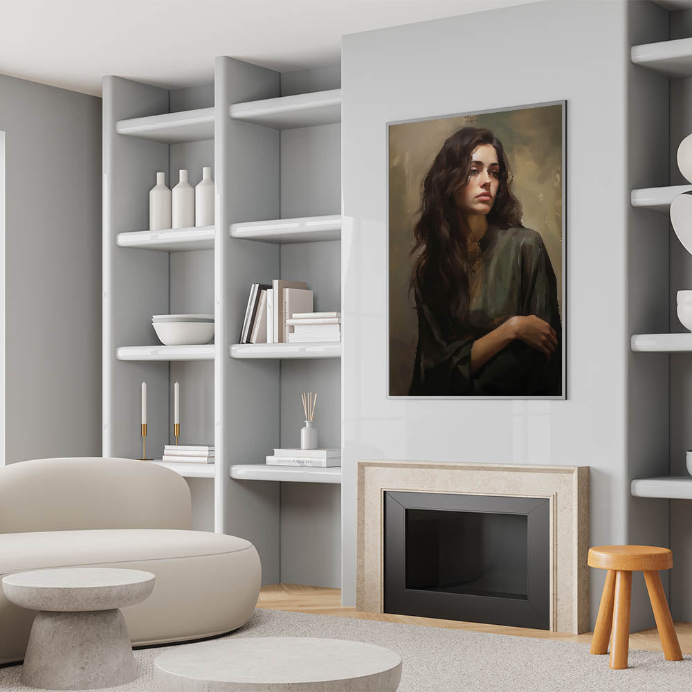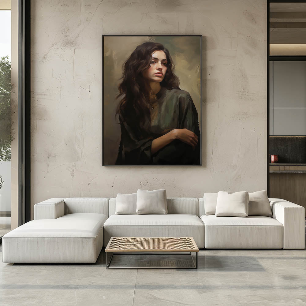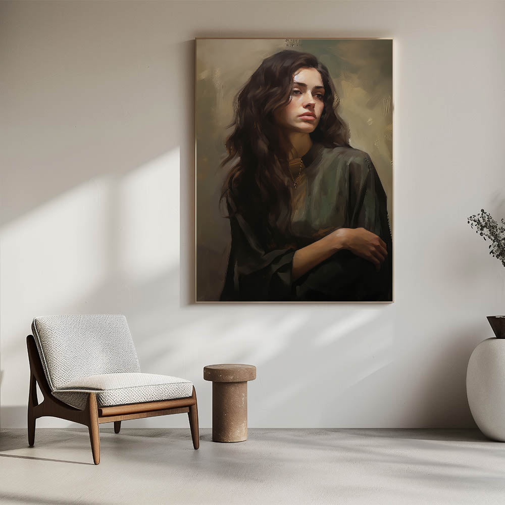 This nostalgic portrait art embodies depth and elegance, featuring a contemplative woman captured in rich, painterly textures. The warm earth tones and soft lighting create a timeless portrait print that radiates sophistication. Ideal for those who appreciate historic portrait decor, this artwork evokes emotion and classical beauty.