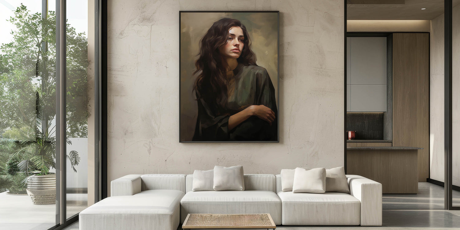 This elegant vintage portrait is a timeless blend of realism and artistic expression. Whether displayed as a statement piece or part of a curated historic portrait decor collection, this artwork enhances any space with its rich hues and introspective presence.
