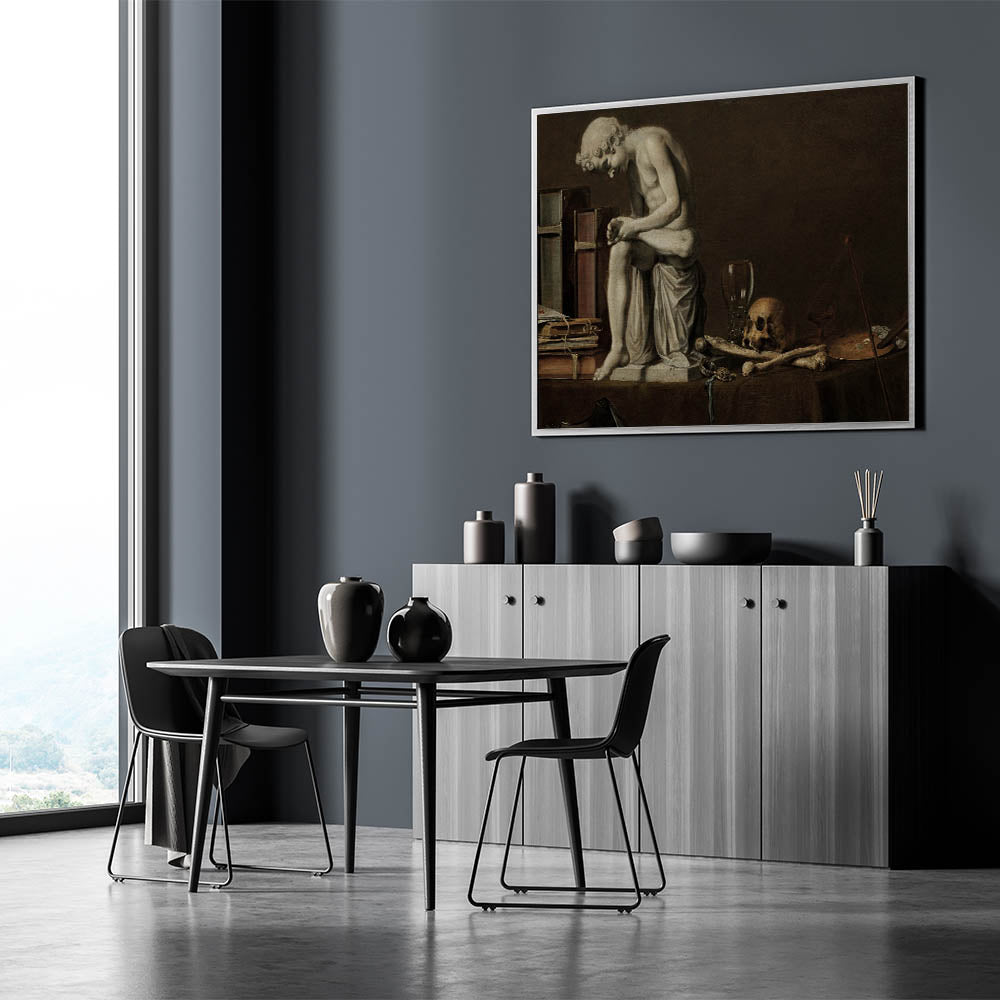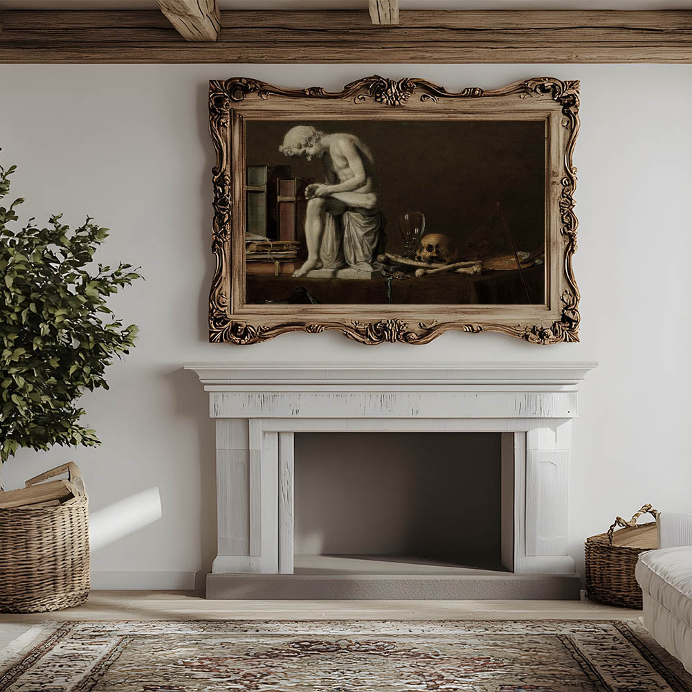 Embrace the intellectual elegance of Dark Academia Wall Art with this captivating piece. Featuring a classical statue in quiet contemplation, surrounded by books, a skull, and symbolic items like rings and an hourglass, this artwork beautifully captures the essence of Vintage Academic Prints. The muted tones and meticulous details make it ideal for those looking to bring a moody, thoughtful atmosphere to their space. Perfect for creating a scholarly, introspective environment in a library, study, or reading nook.