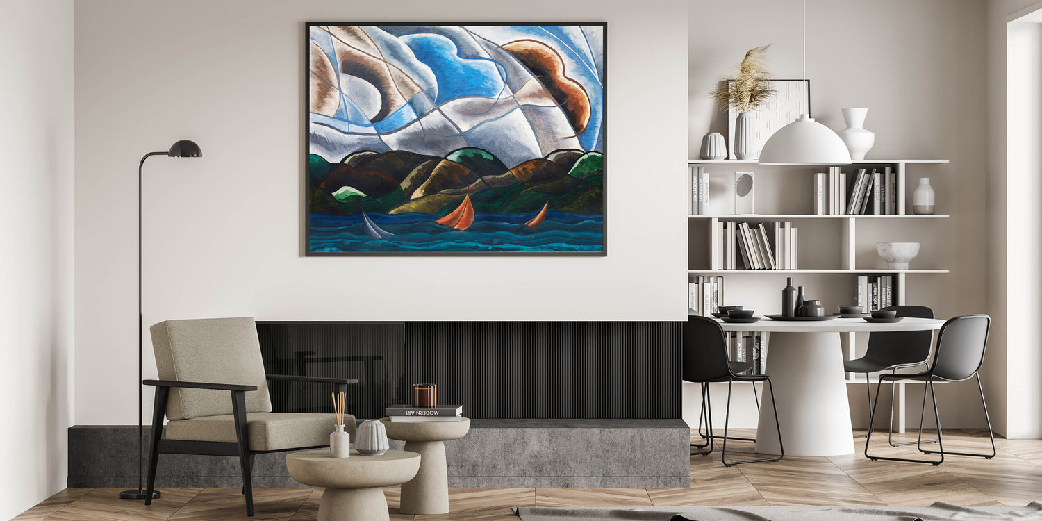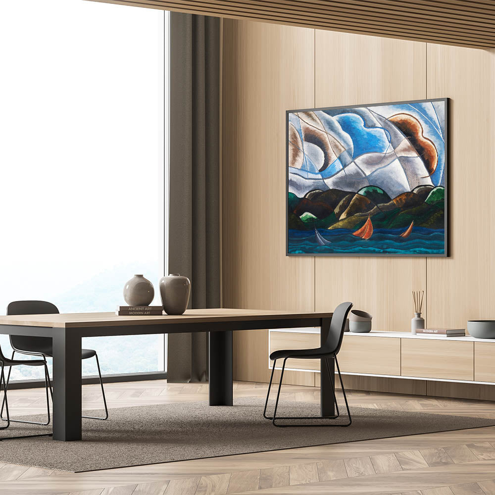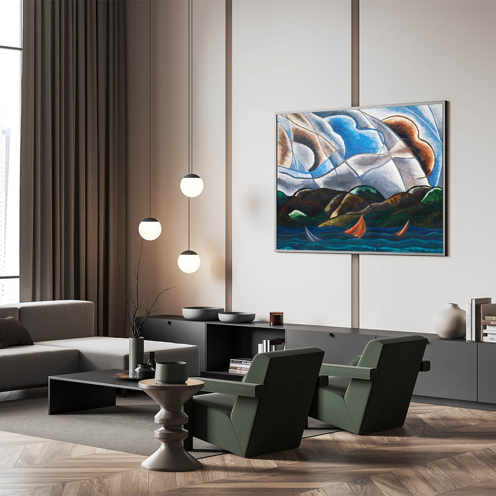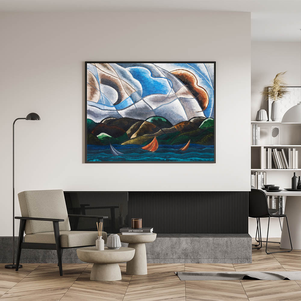 Experience the harmony of nature and abstraction with "Clouds and Water," a captivating piece of modern wall art by Arthur Dove. This contemporary artwork features dramatic swirling clouds, rolling hills, and vibrant waters, accented by bold, flowing lines. Its dynamic composition and rich palette of blues, greens, and earthy tones make it a perfect centerpiece for trendy home decor.