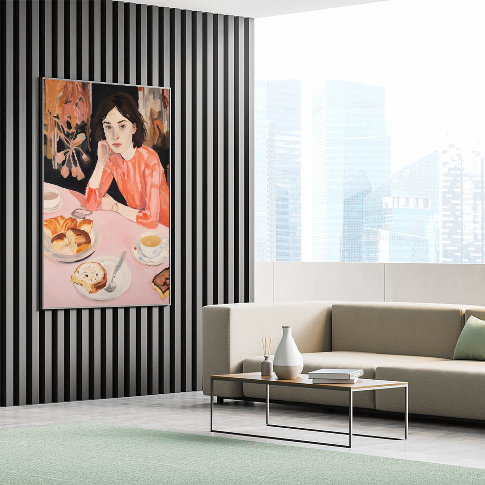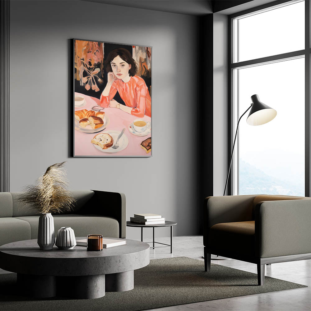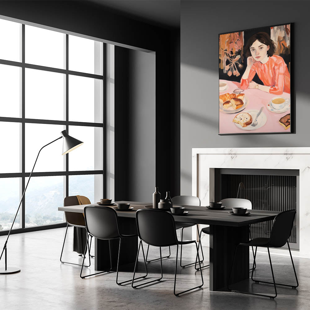 This electric wall art piece captures a moment of quiet contemplation, featuring a woman sitting at a table adorned with delicious pastries and a cup of tea. The warm and soft hues of coral, peach, and earthy tones blend together, creating an intimate and inviting atmosphere. The vibrant yet serene composition is perfect for modern spaces that seek to balance energy and calm. Whether placed in a dining area, kitchen, or cozy reading nook, this artwork enhances the space with its thoughtful and reflective mood, making it ideal for art lovers who appreciate scenes of everyday life.