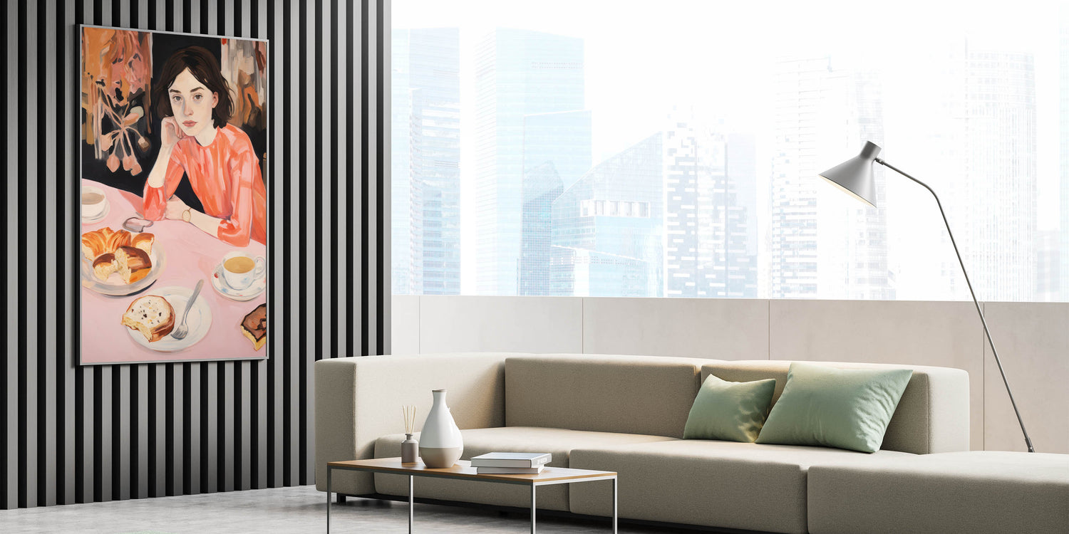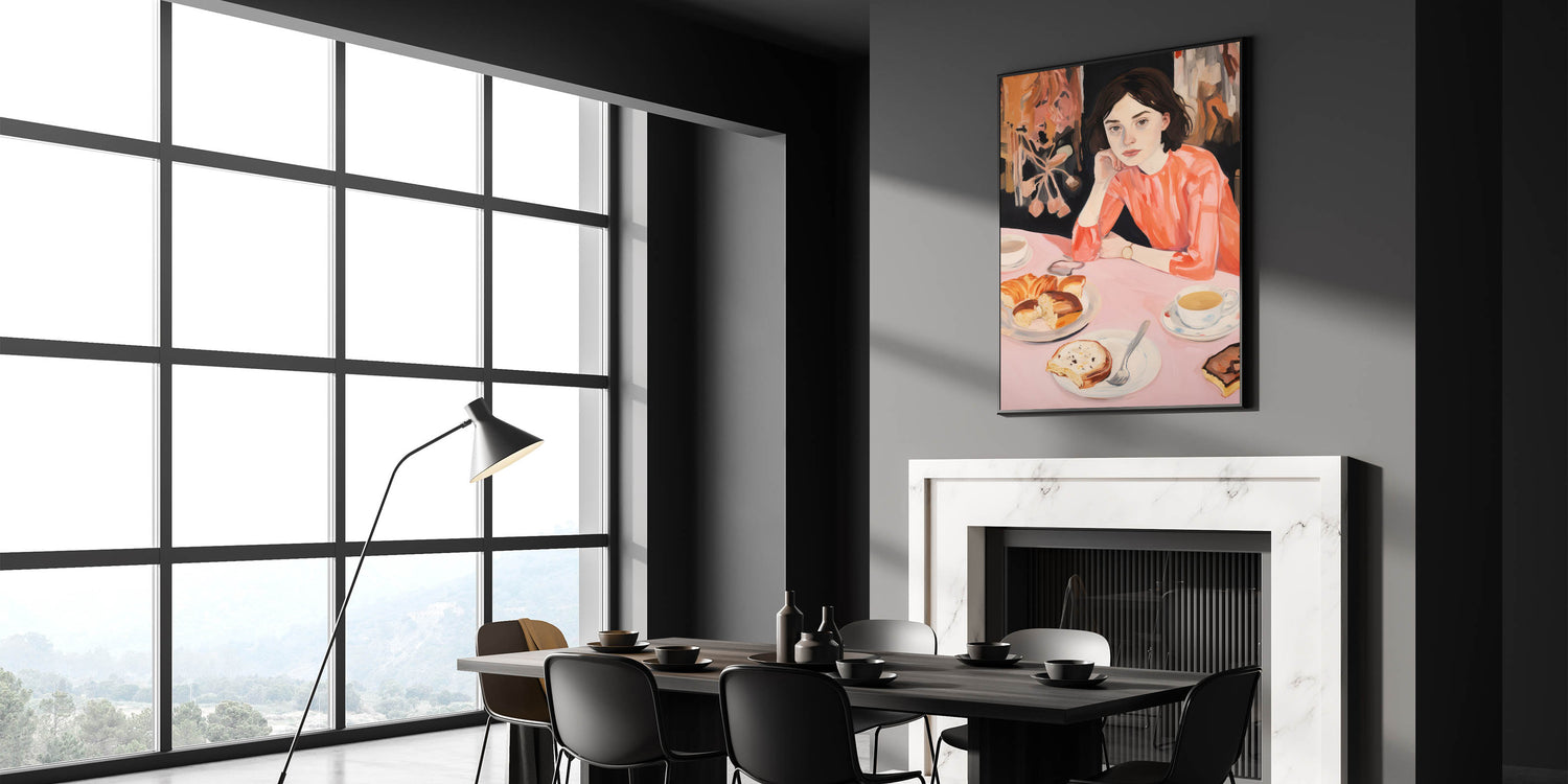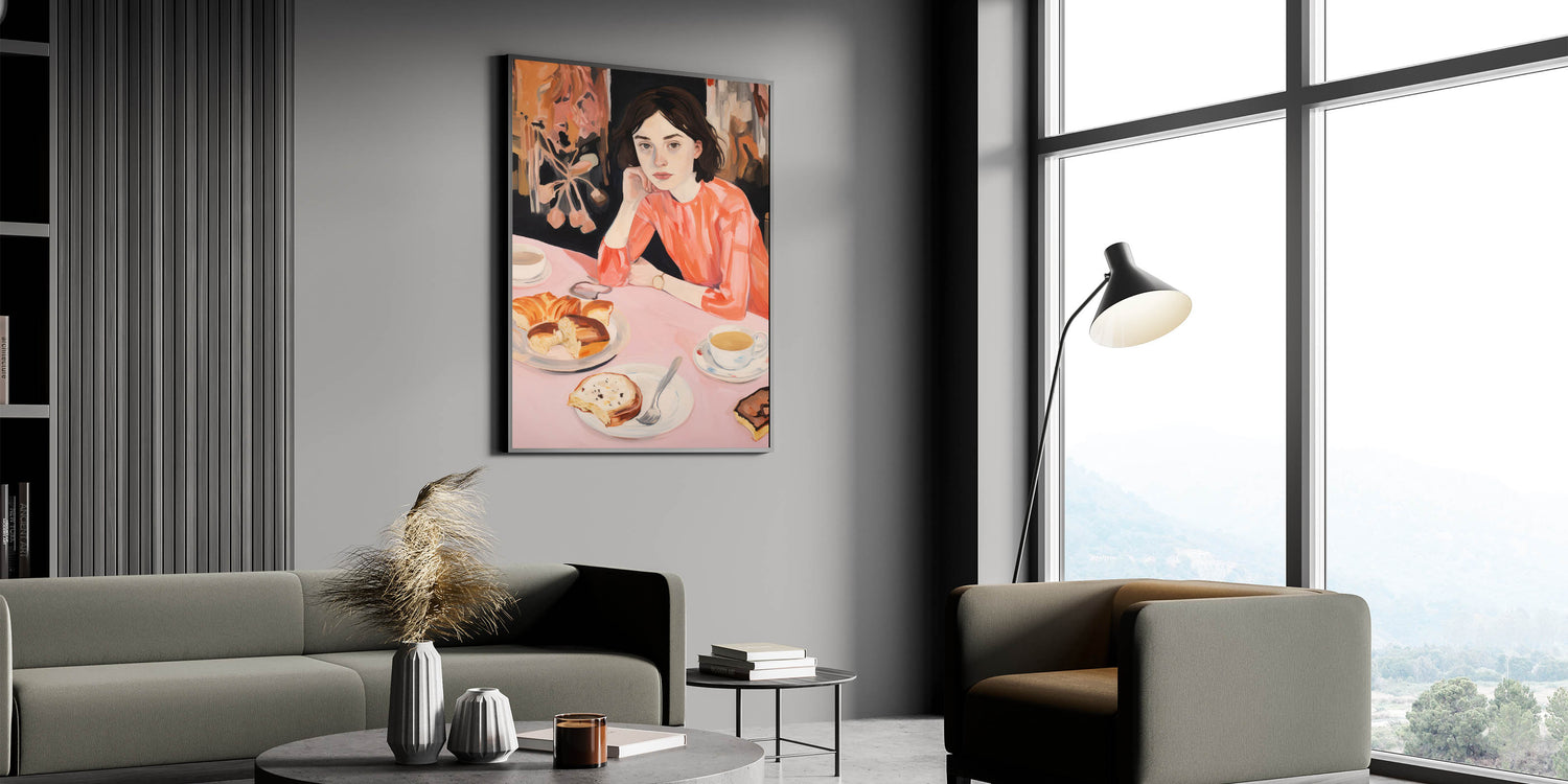 This electric wall art piece captures a moment of quiet contemplation, featuring a woman sitting at a table adorned with delicious pastries and a cup of tea. The warm and soft hues of coral, peach, and earthy tones blend together, creating an intimate and inviting atmosphere. The vibrant yet serene composition is perfect for modern spaces that seek to balance energy and calm. Whether placed in a dining area, kitchen, or cozy reading nook, this artwork enhances the space with its thoughtful and reflective mood, making it ideal for art lovers who appreciate scenes of everyday life.