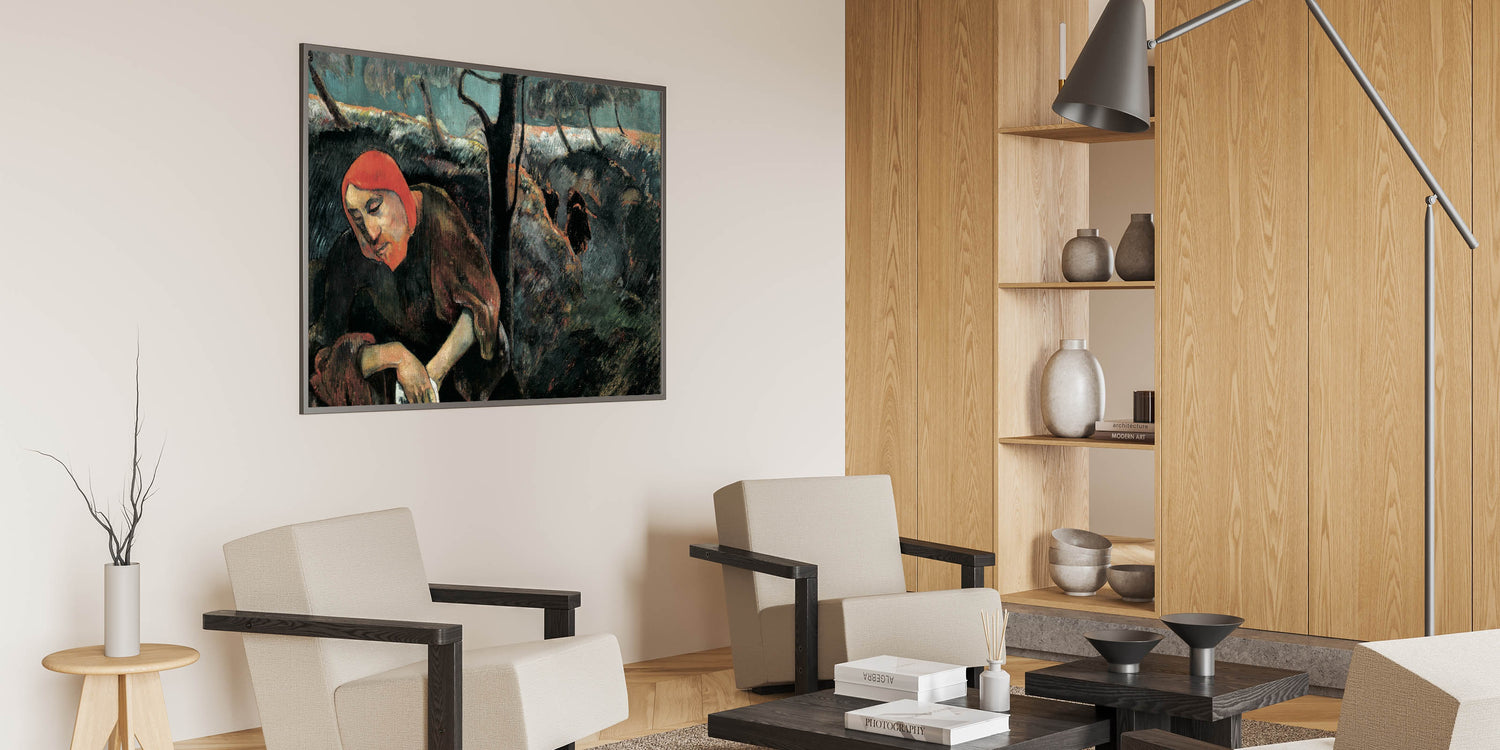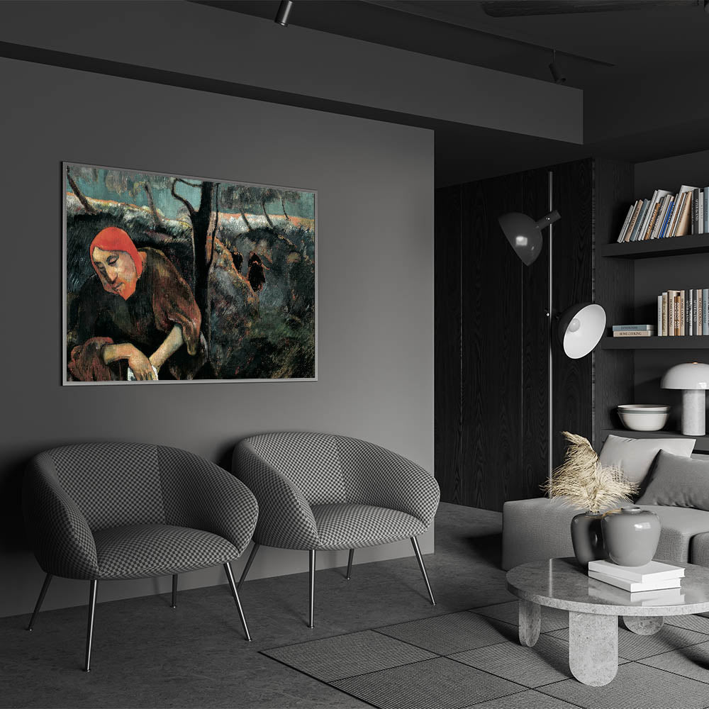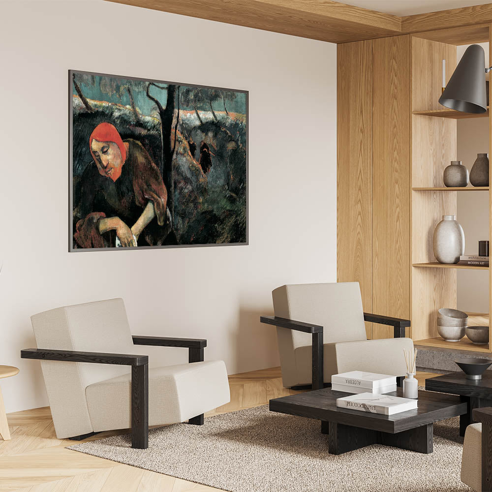 Immerse yourself in the depth of emotion with this contemplative figure wall art, set against a moody landscape that combines rich greens, earthy browns, and bold reds. This artwork is ideal for those who appreciate expressionist art with intense, evocative themes, perfect for creating a focal point in any modern space.
