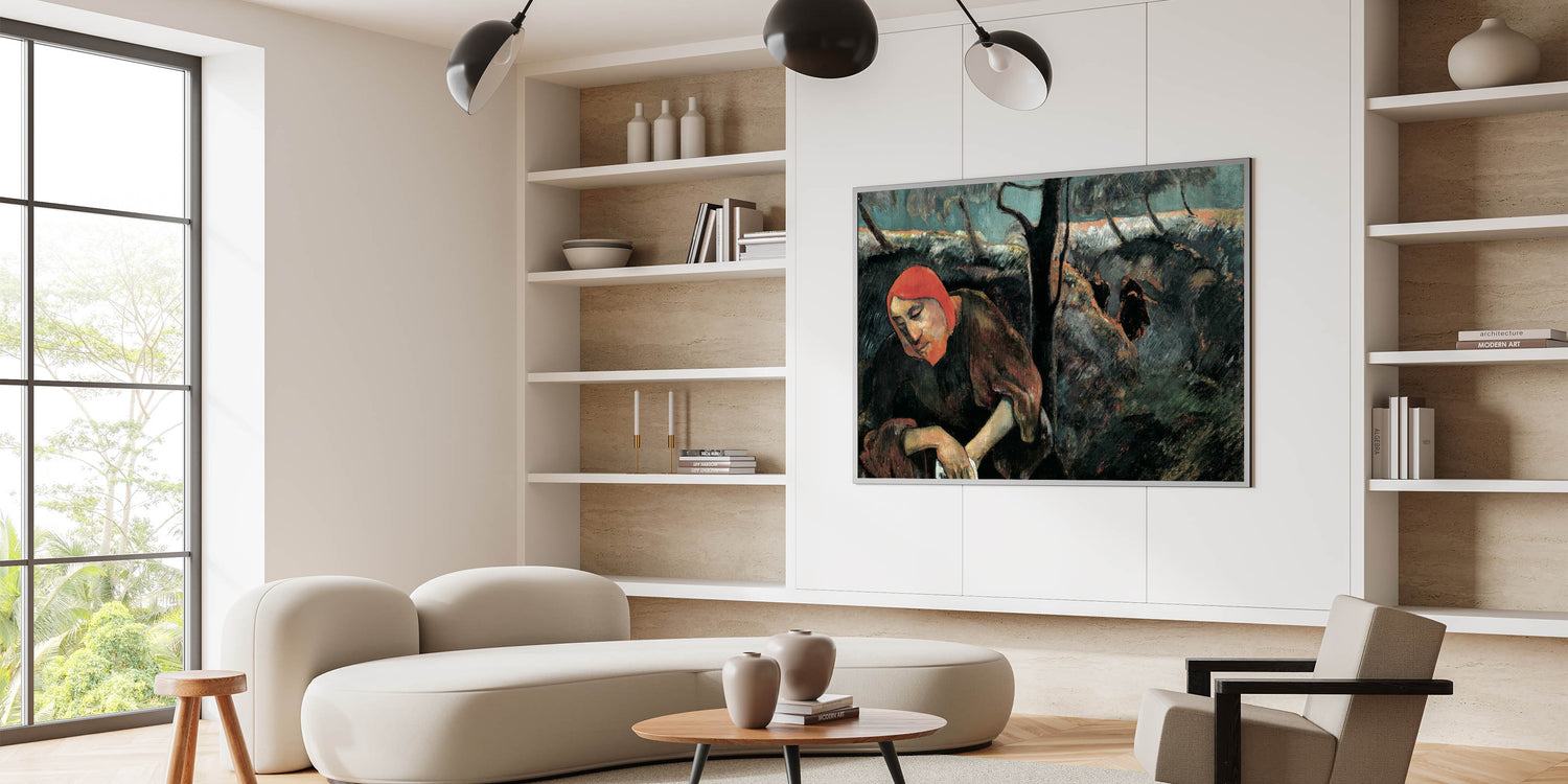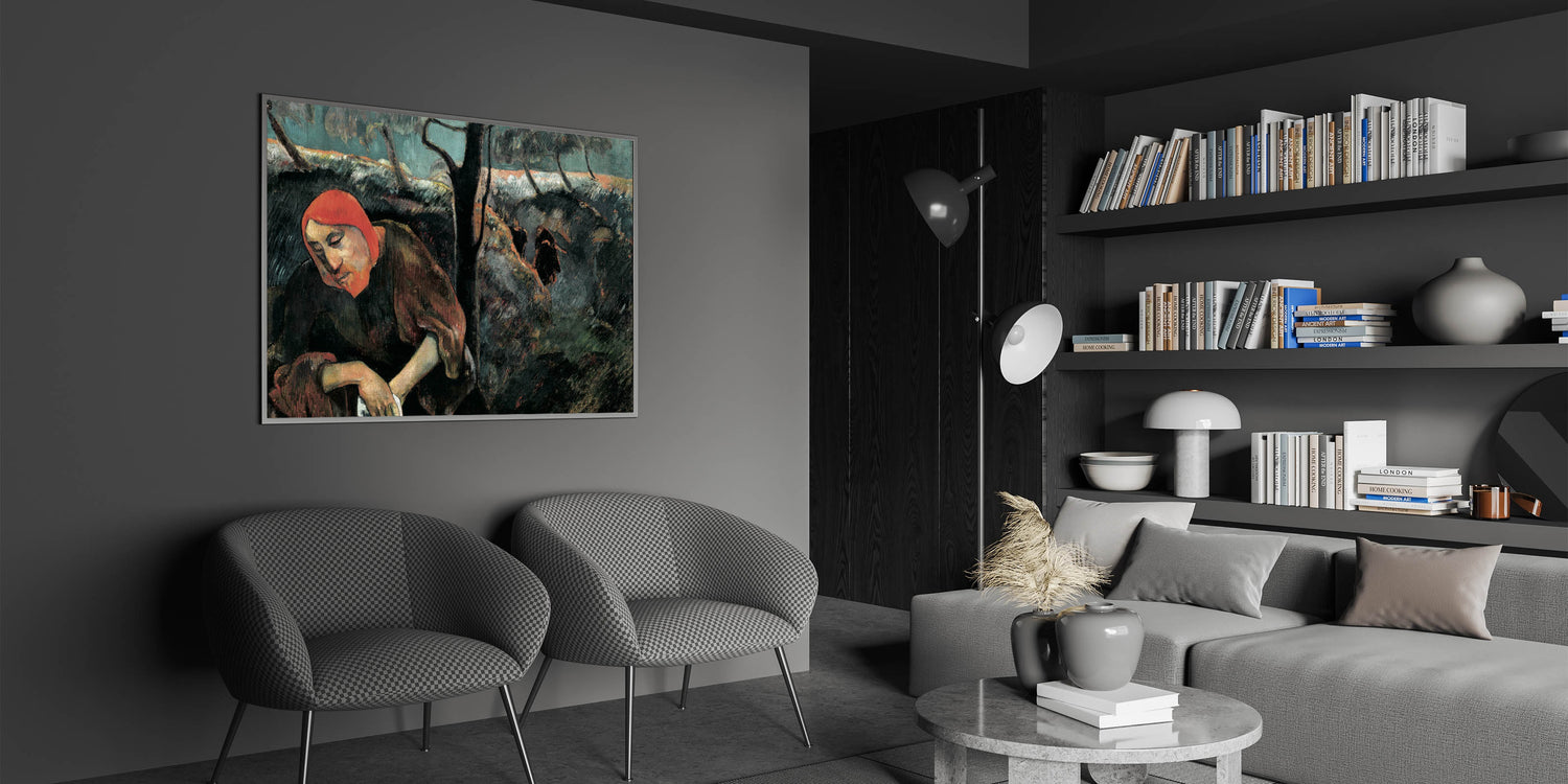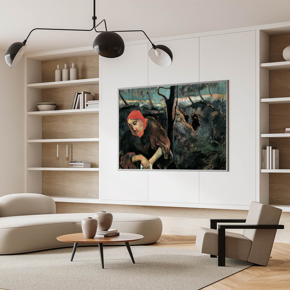 Immerse yourself in the depth of emotion with this contemplative figure wall art, set against a moody landscape that combines rich greens, earthy browns, and bold reds. This artwork is ideal for those who appreciate expressionist art with intense, evocative themes, perfect for creating a focal point in any modern space.