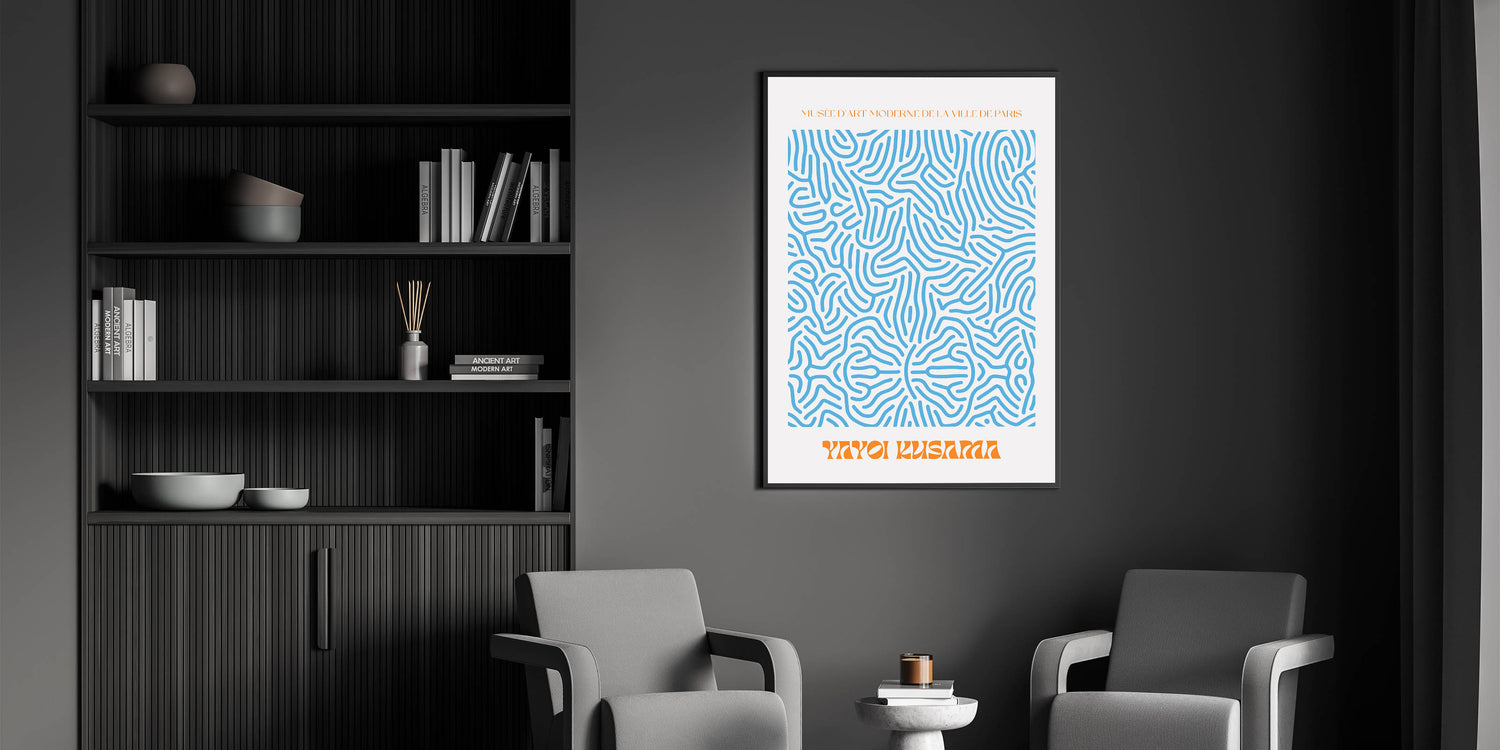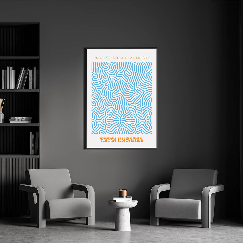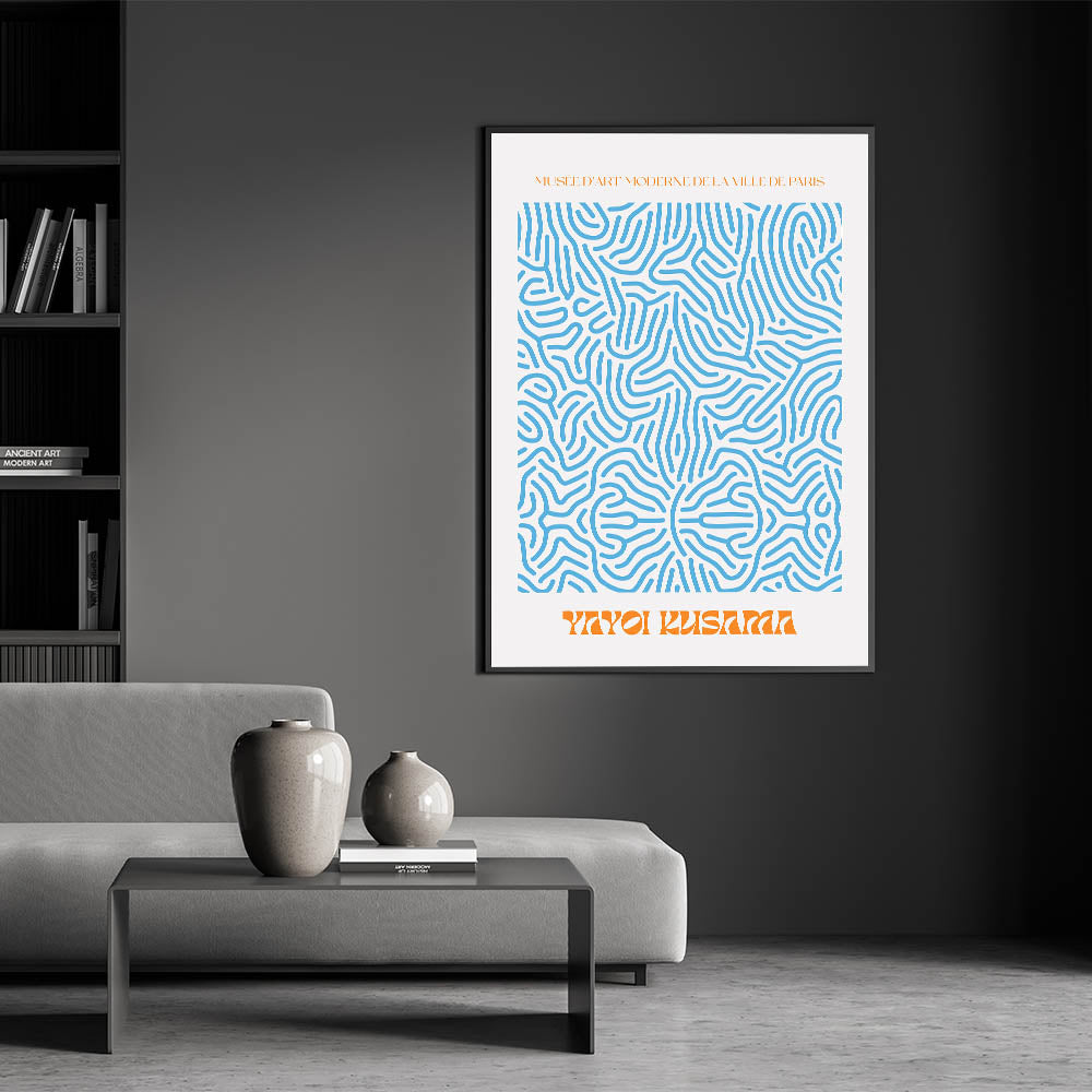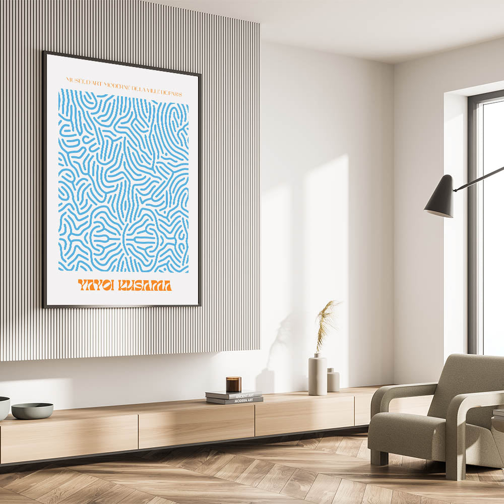 Add a touch of modern sophistication to your space with this contemporary canvas art inspired by Yayoi Kusama's iconic abstract patterns. The artwork features an intricate blue line design set against a neutral beige background, creating a striking visual effect. The flowing lines form a captivating abstract pattern that draws the eye and adds a dynamic element to any room. This piece is perfect for those who appreciate modern art with a bold yet minimalist style.