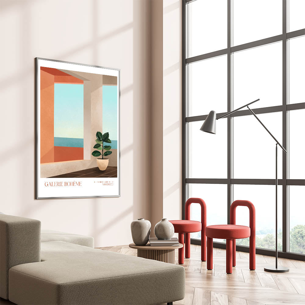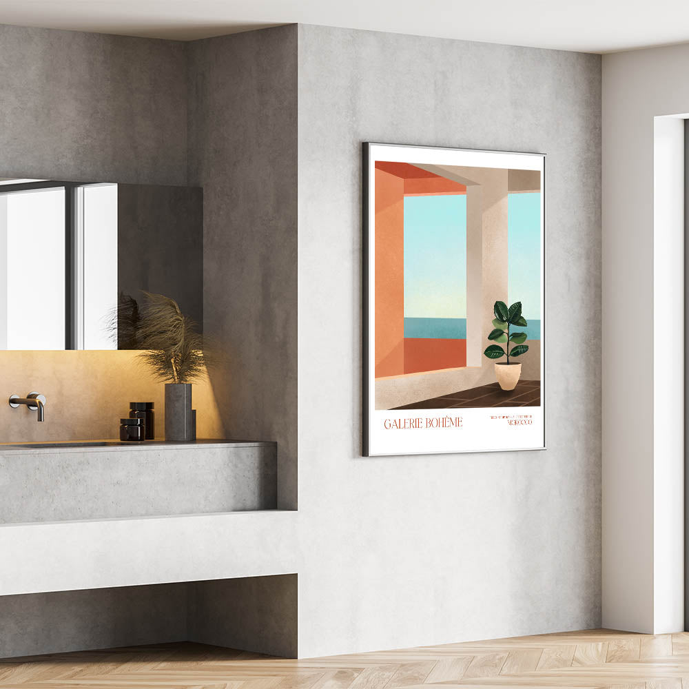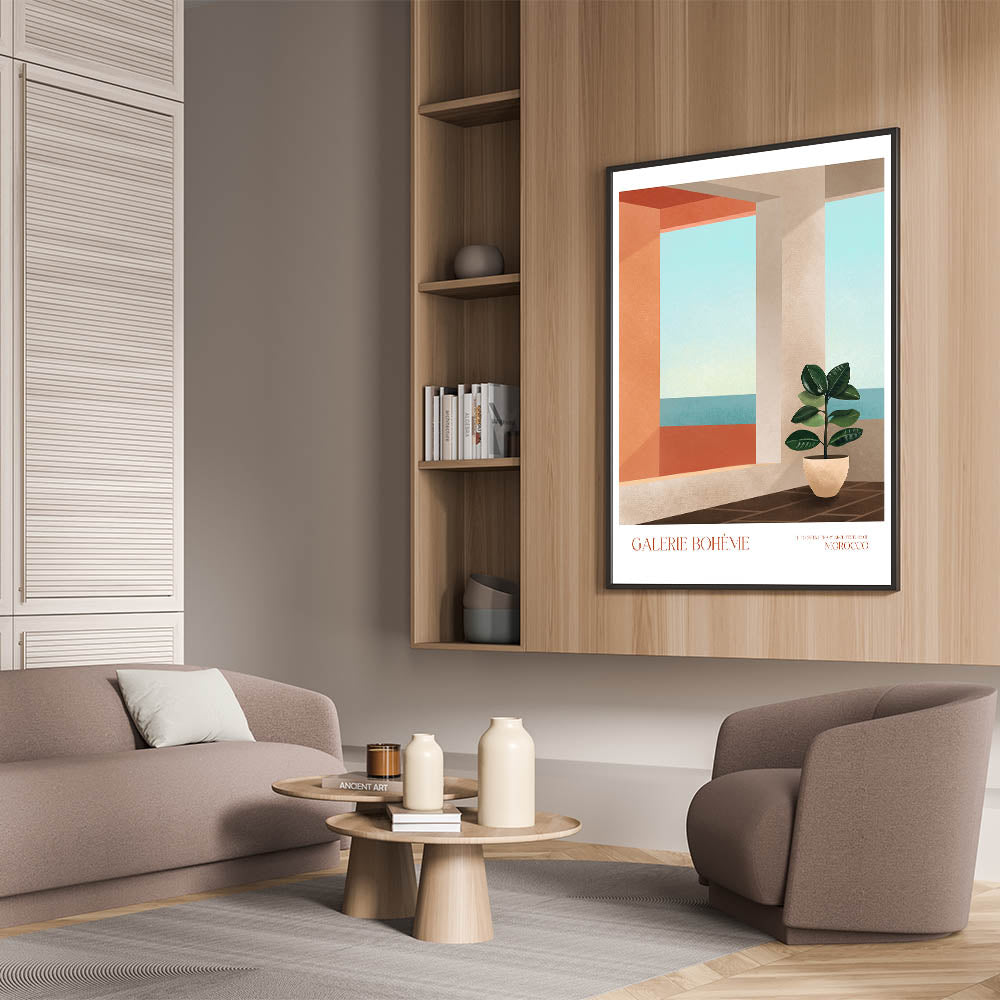 Add a touch of elegance to your space with this contemporary canvas art, showcasing a modern interior inspired by Moroccan architecture. The composition features abstract elements such as a minimalist potted plant and a geometric view of the ocean, seamlessly blending with any decor style. Perfect for modern art enthusiasts, this piece brings warmth and tranquility to your living space.