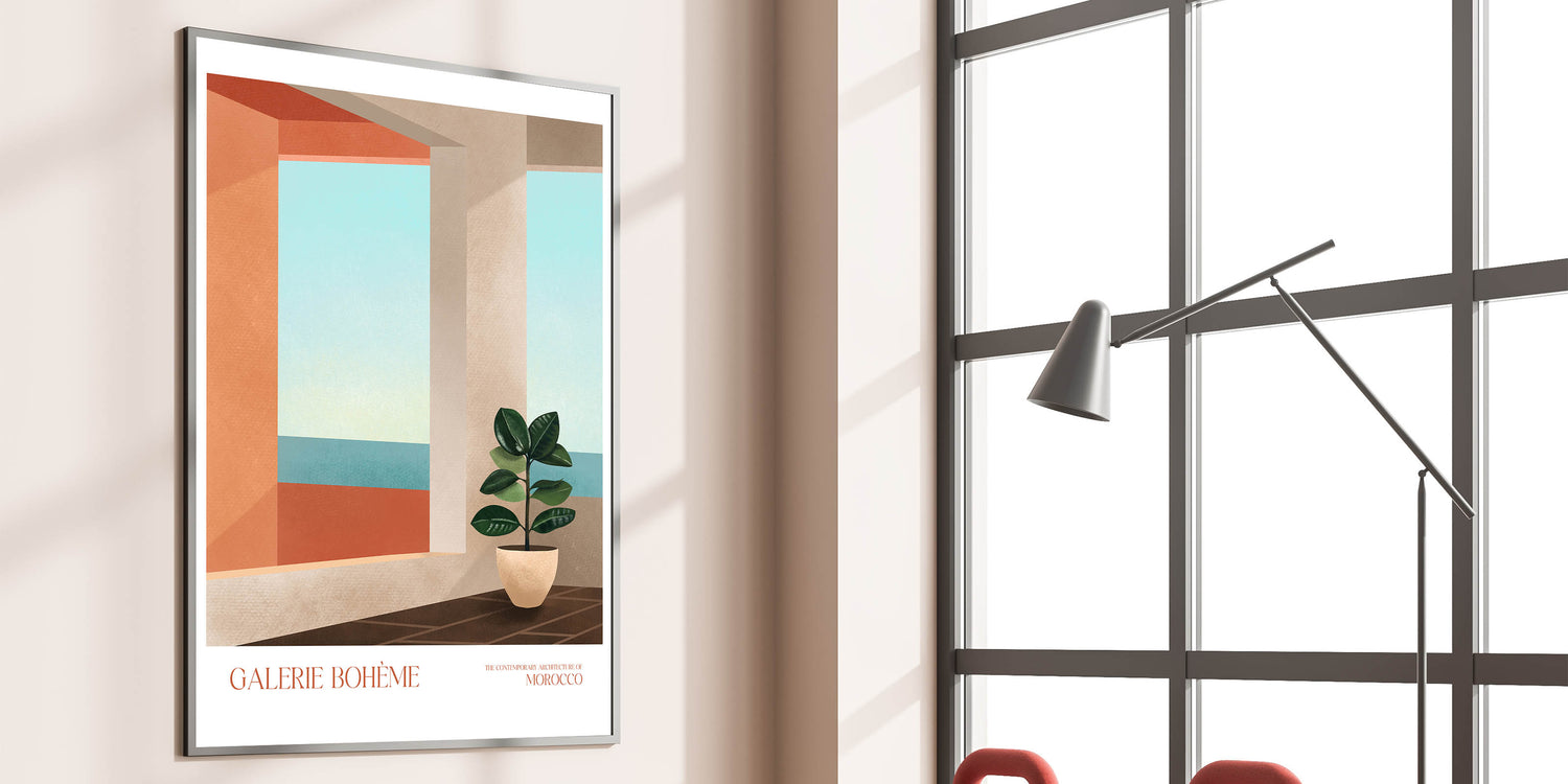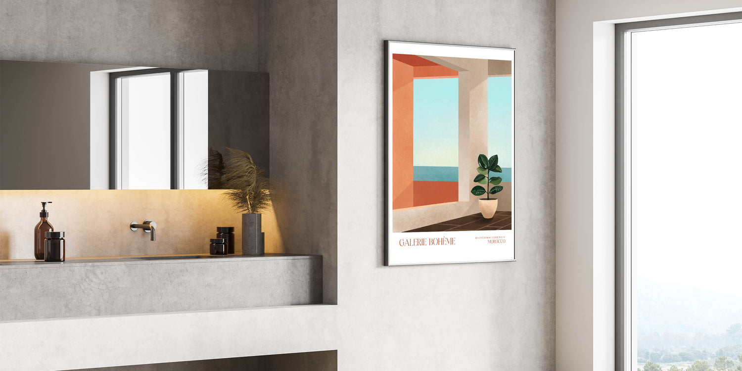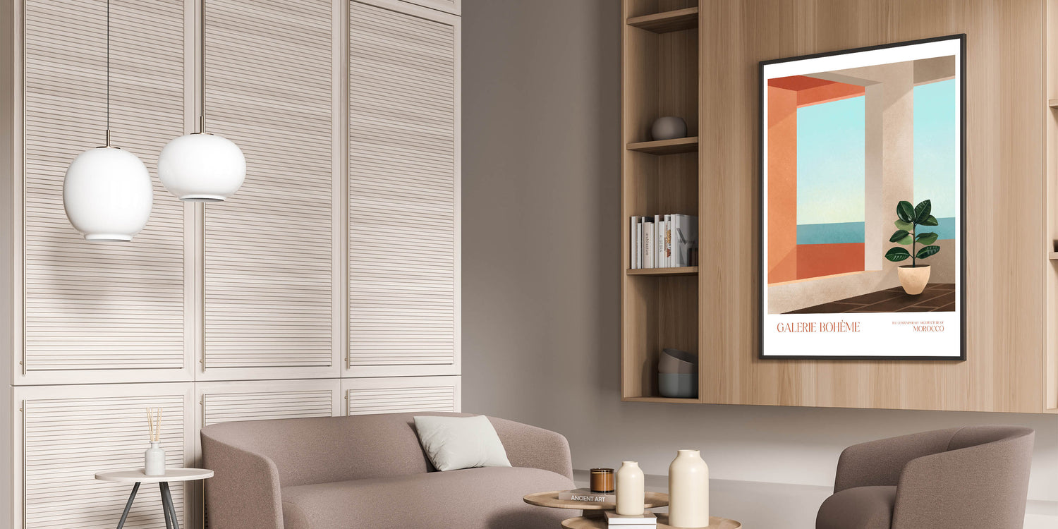 Add a touch of elegance to your space with this contemporary canvas art, showcasing a modern interior inspired by Moroccan architecture. The composition features abstract elements such as a minimalist potted plant and a geometric view of the ocean, seamlessly blending with any decor style. Perfect for modern art enthusiasts, this piece brings warmth and tranquility to your living space.