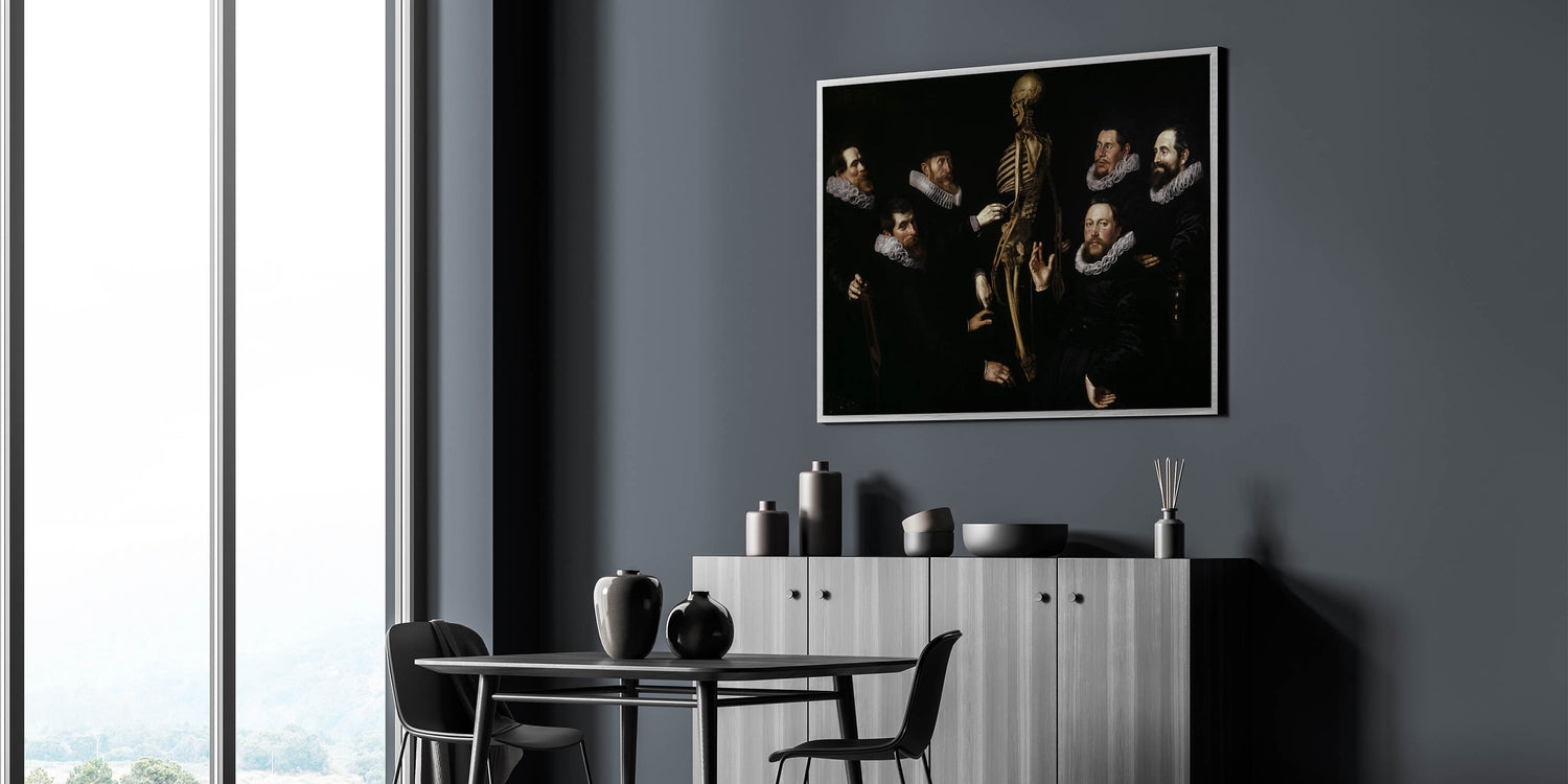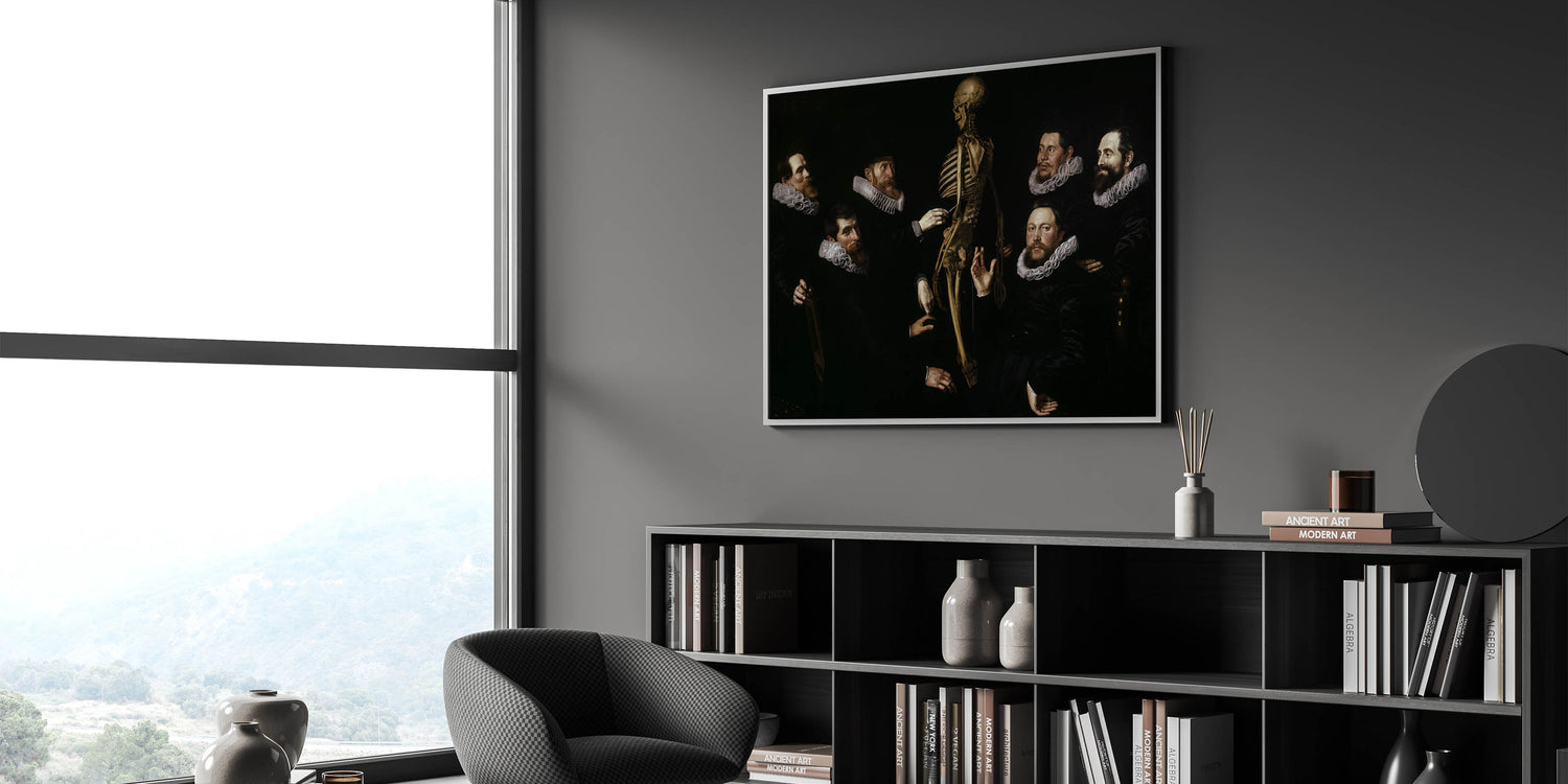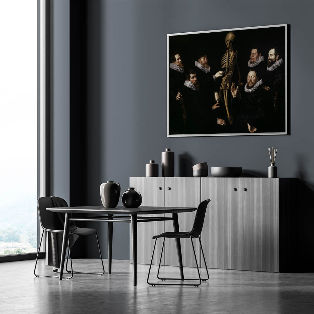 This captivating Dark Academia wall art piece brings to life the intellectual tradition of anatomical studies, featuring a group of scholars examining a skeleton. The dark, dramatic tones and detailed depiction of the figures’ expressions evoke a sense of mystery and inquiry, making it a prime example of vintage Gothic prints. The interplay of shadows and light highlights the figures' ruffled collars and serious expressions, creating a powerful moody aesthetic decor ideal for those who appreciate classic literature art and historical themes.