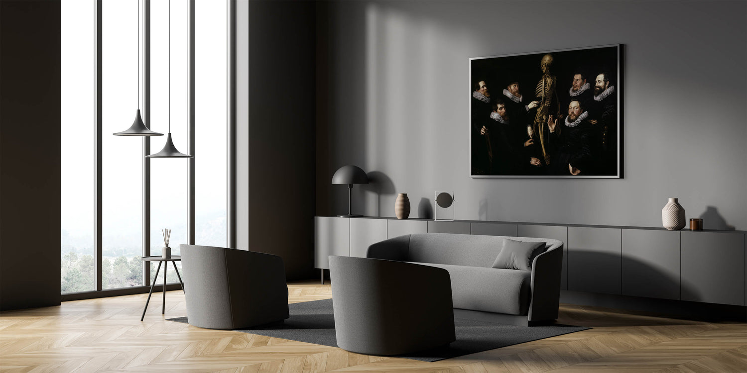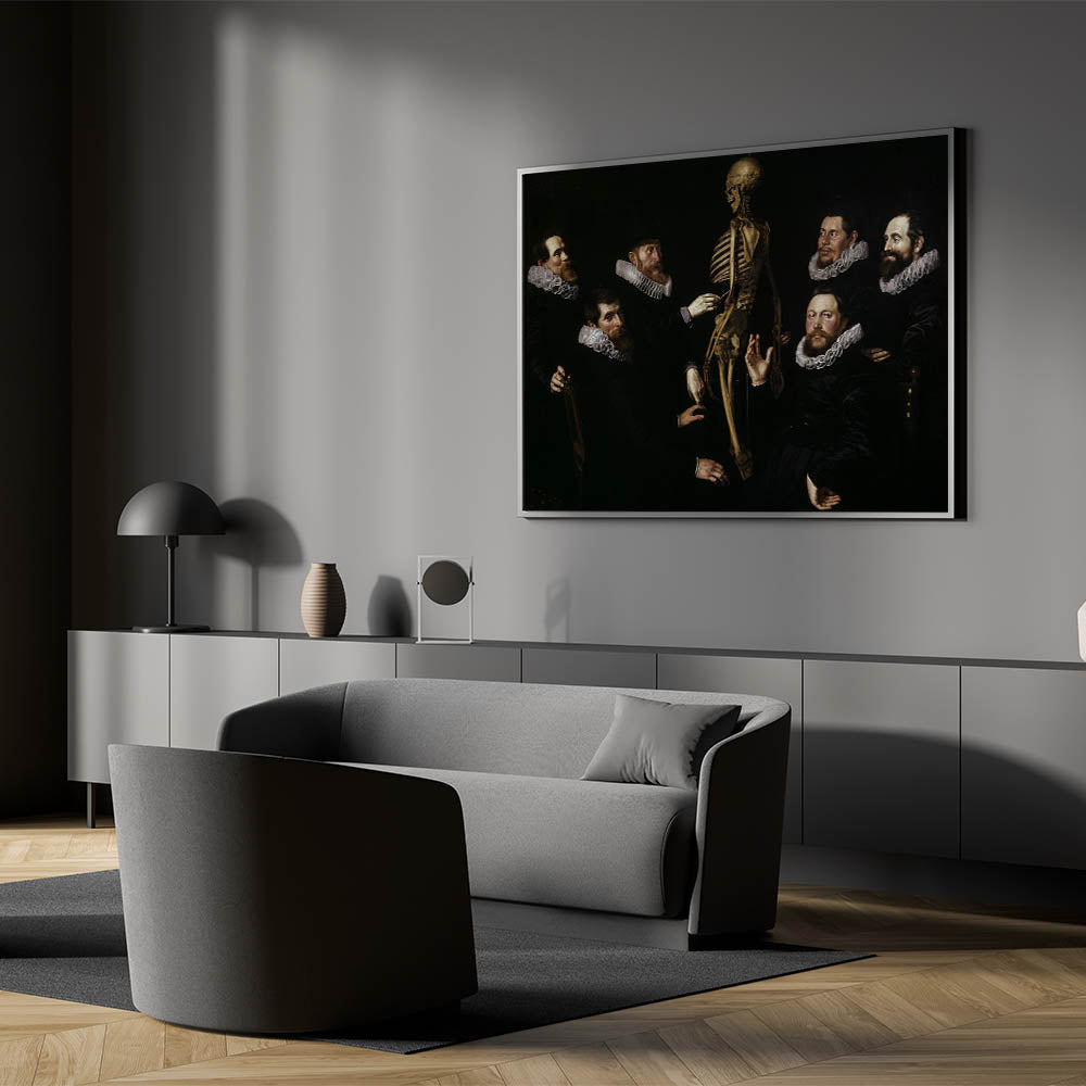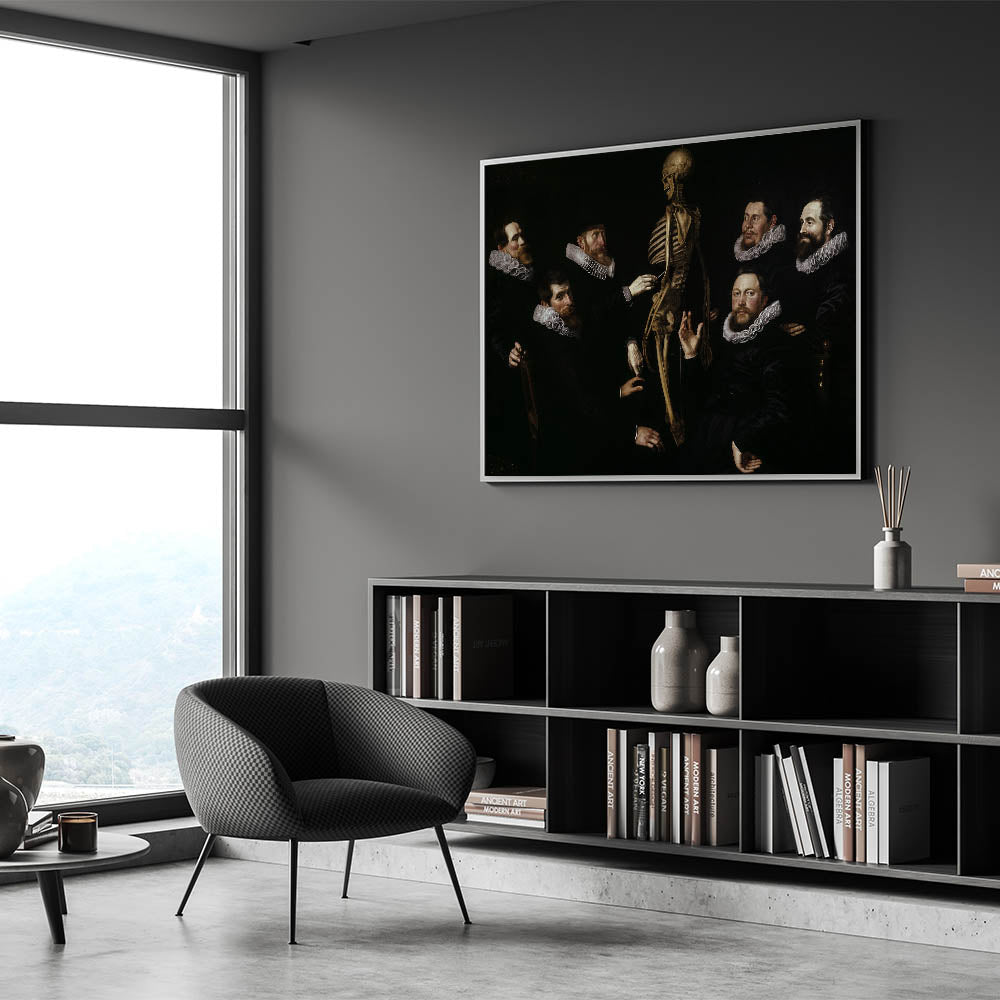 This captivating Dark Academia wall art piece brings to life the intellectual tradition of anatomical studies, featuring a group of scholars examining a skeleton. The dark, dramatic tones and detailed depiction of the figures’ expressions evoke a sense of mystery and inquiry, making it a prime example of vintage Gothic prints. The interplay of shadows and light highlights the figures' ruffled collars and serious expressions, creating a powerful moody aesthetic decor ideal for those who appreciate classic literature art and historical themes.