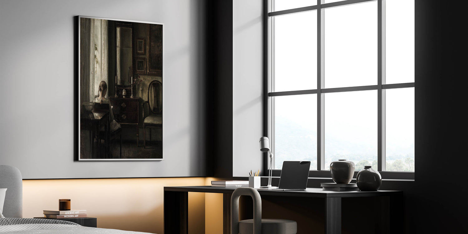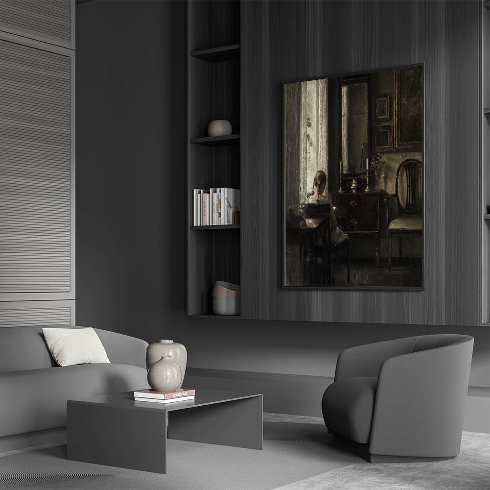 This Dark Academia wall art captures a tranquil scene of a young girl reading in a shadowy, antique study room. The dim lighting and vintage furniture set the tone for deep contemplation and intellectual pursuit, making this piece an excellent choice for moody room decorations and atmospheric art for study spaces. The muted colors and intricate details of the room create a timeless aesthetic that complements the Dark Academia style, blending gothic charm with a vintage academic vibe.