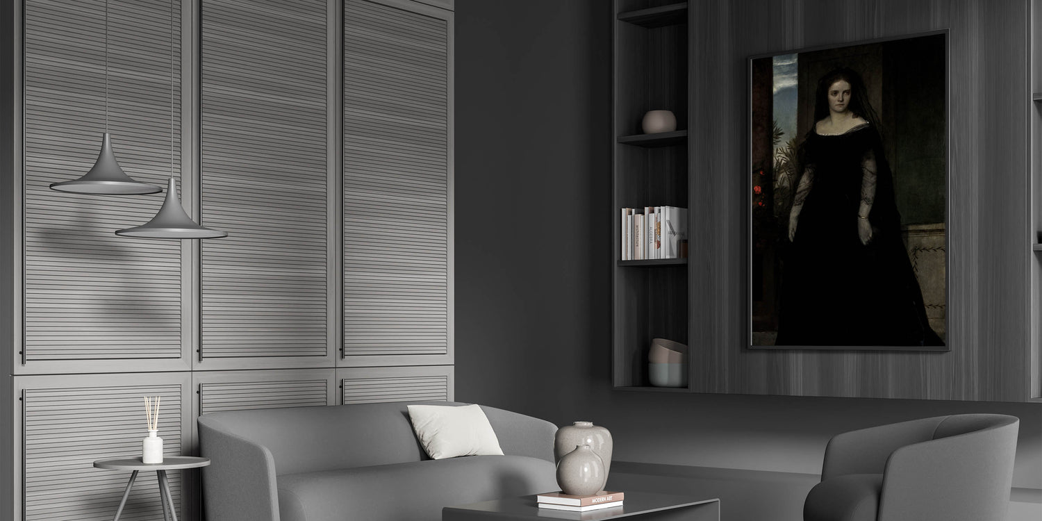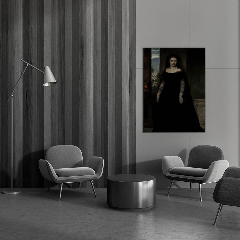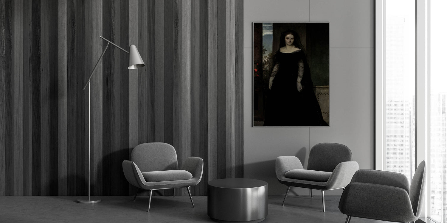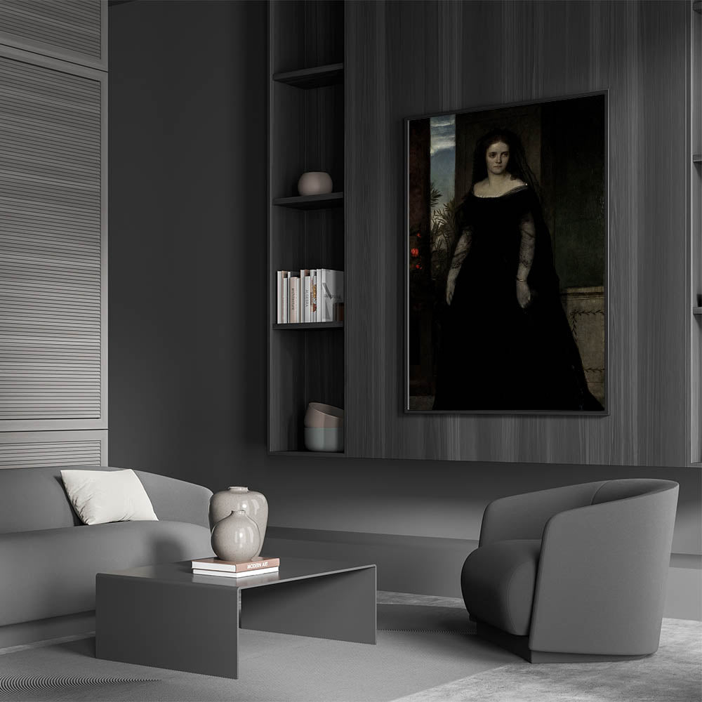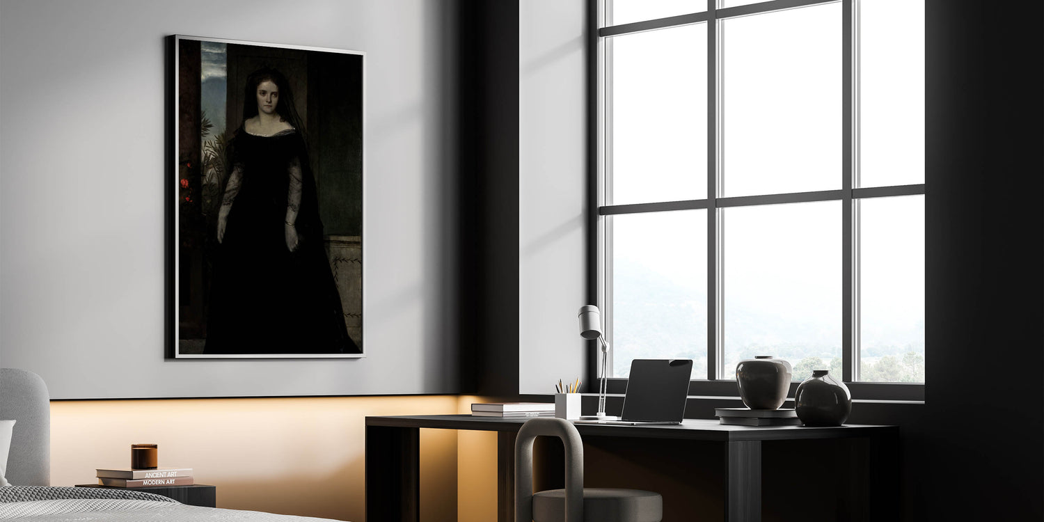 Embrace the haunting beauty of this Gothic-inspired Dark Academia artwork, featuring a mysterious woman draped in a black veil. Her somber expression and the muted tones of the painting evoke a sense of melancholy and reflection, making this piece perfect for lovers of moody aesthetic decor. The delicate interplay of light and shadow highlights the details in her attire and the lush foliage in the background, adding an air of mystique and timeless elegance to any room. This artwork brings a vintage, Gothic feel to your space, making it ideal for studies, libraries, or living rooms.