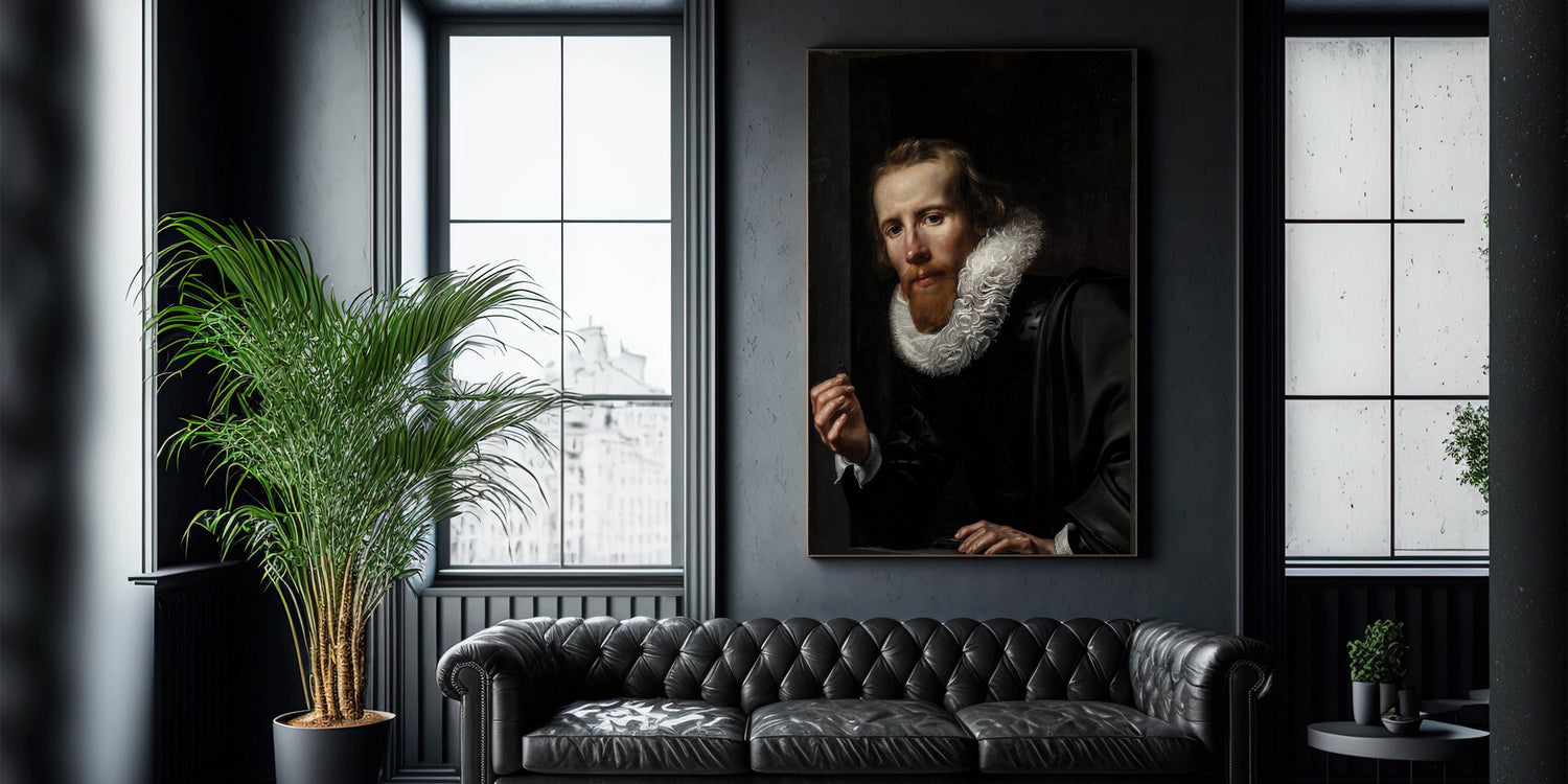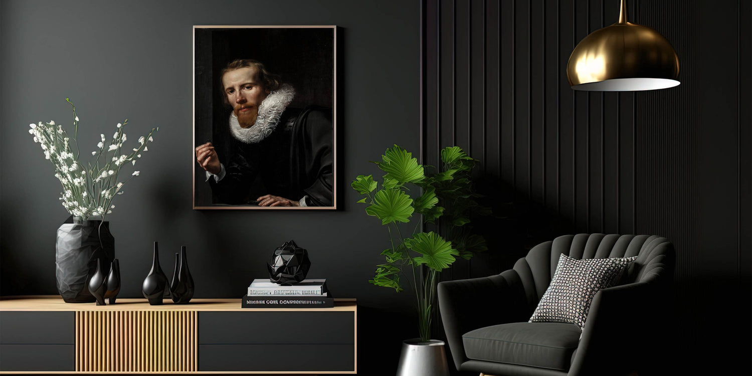 This striking Dark Academia wall art captures a gentleman dressed in dark, elegant attire, his gaze contemplative and refined. The intricate detail of the ruffled collar and the smooth texture of the black fabric evoke a timeless, scholarly atmosphere, perfectly aligned with the gothic and academic aesthetic. The depth of the portrait draws the viewer in, creating a sense of intellectual sophistication and vintage charm.