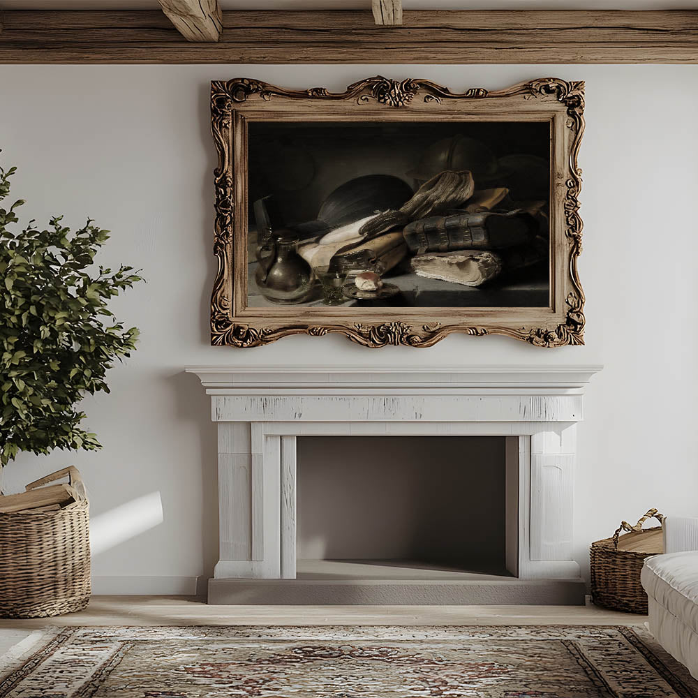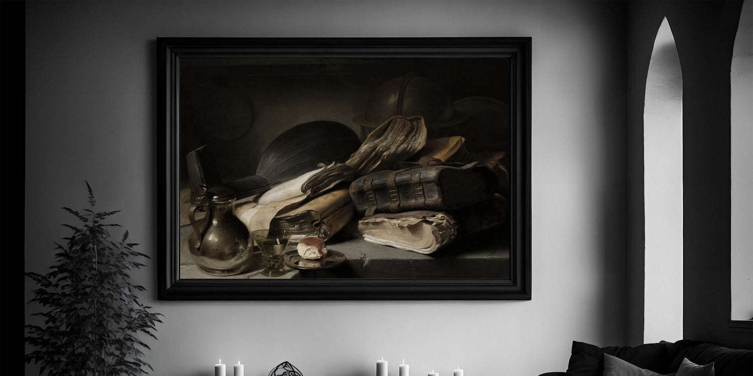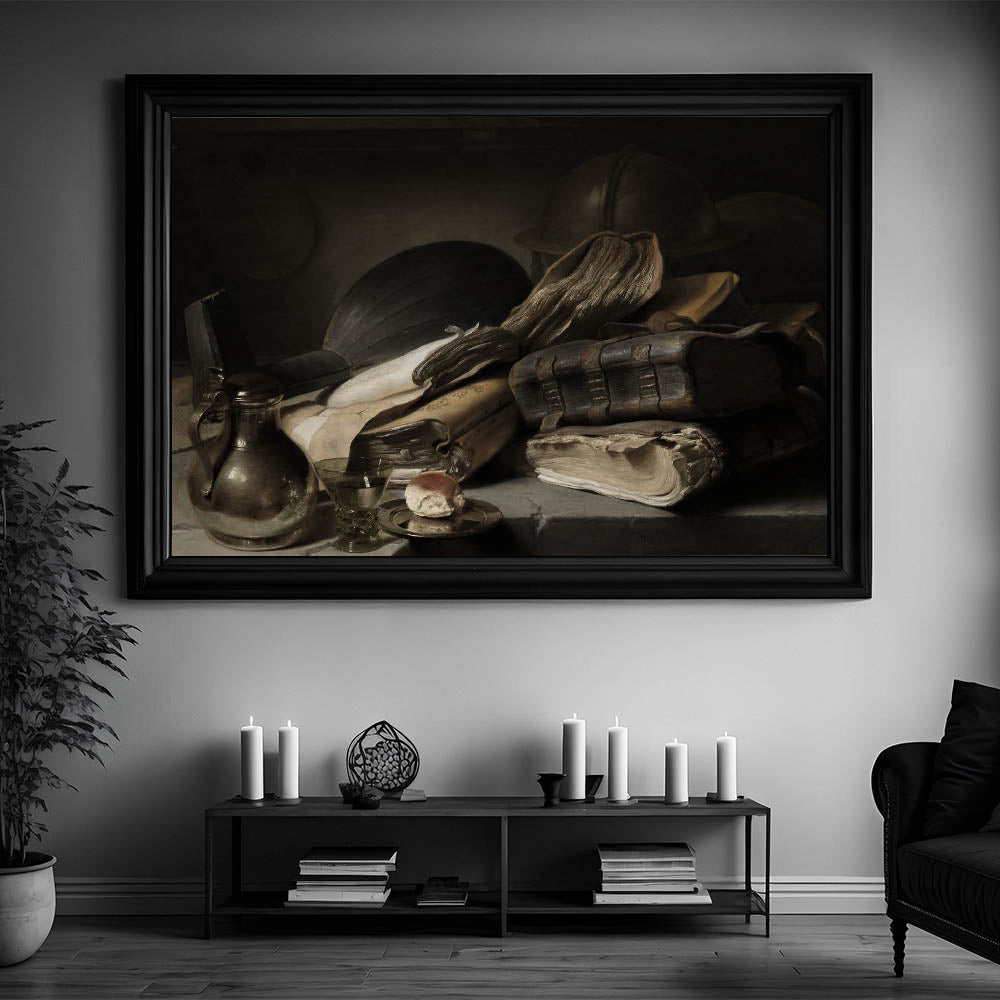 Dark Academia Wall Art – Still Life with Books, Helmet, and Jug