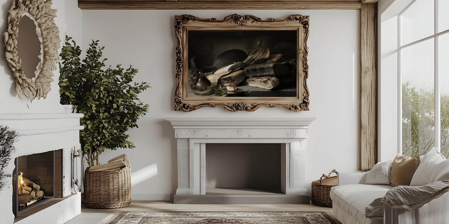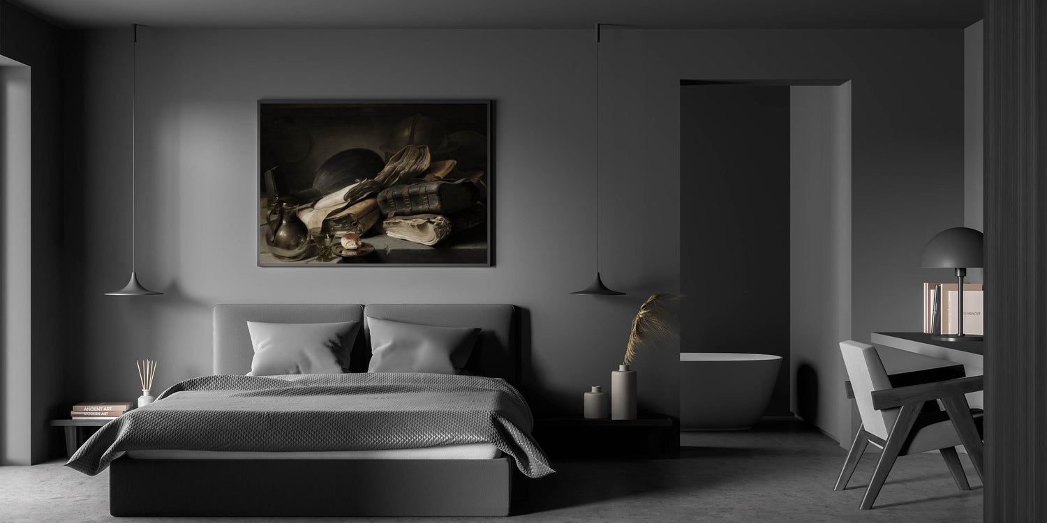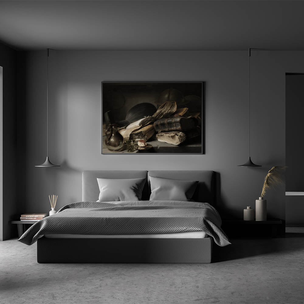 Dark Academia Wall Art – Still Life with Books, Helmet, and Jug