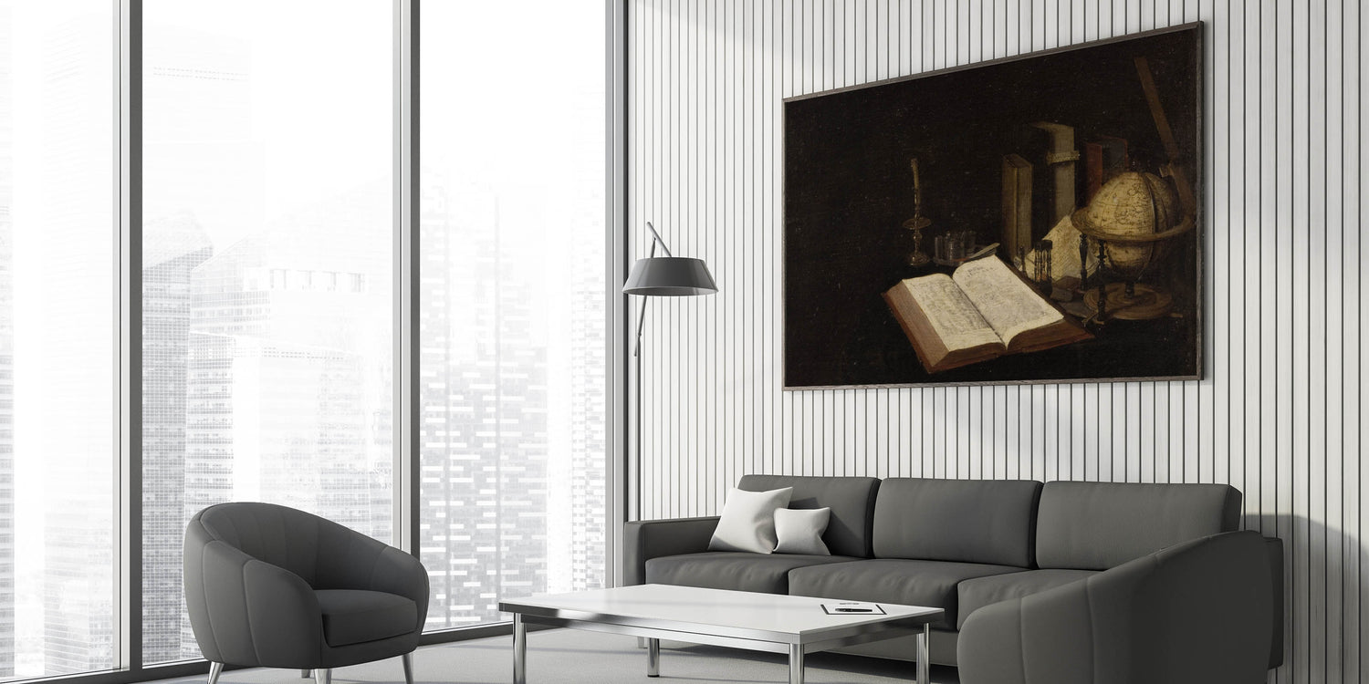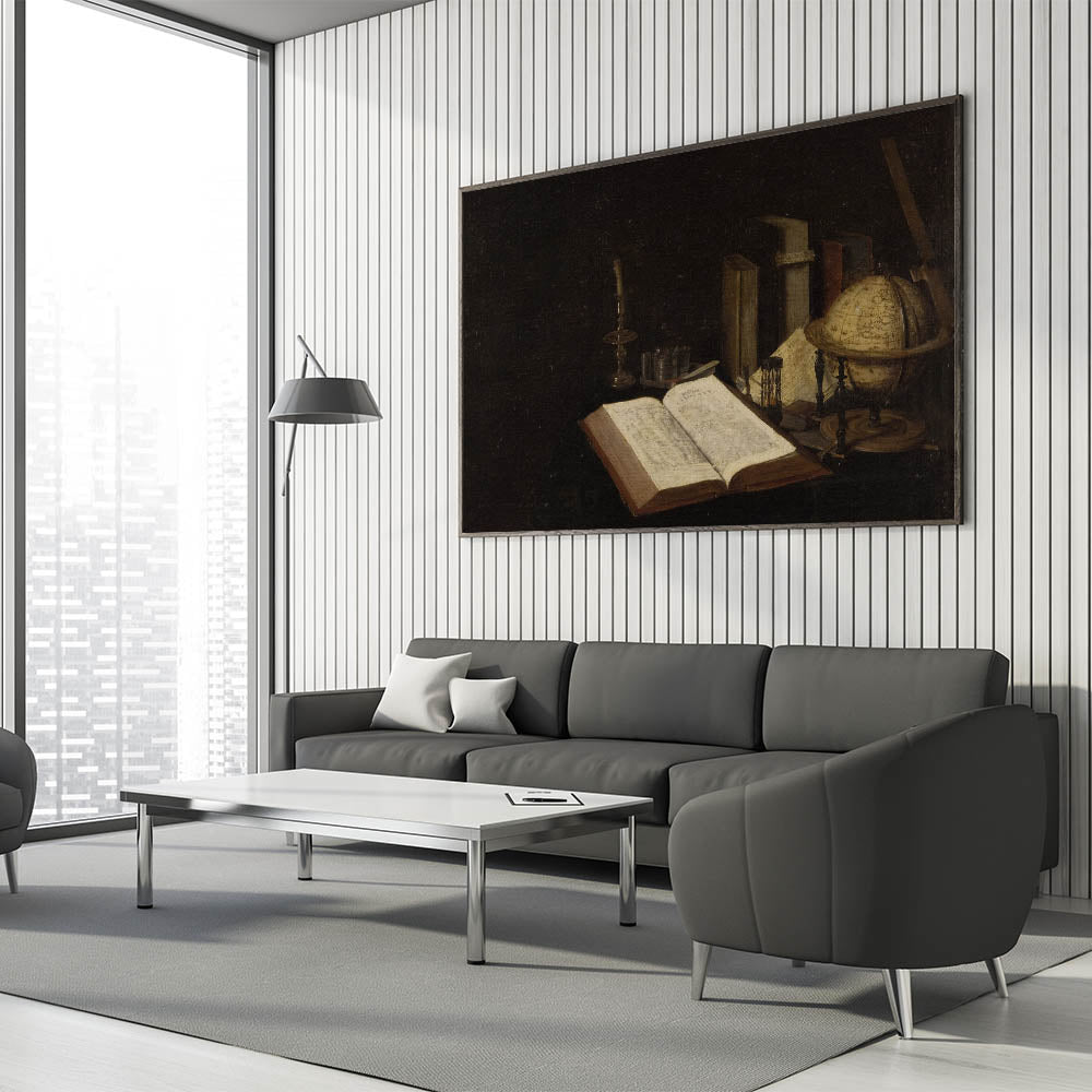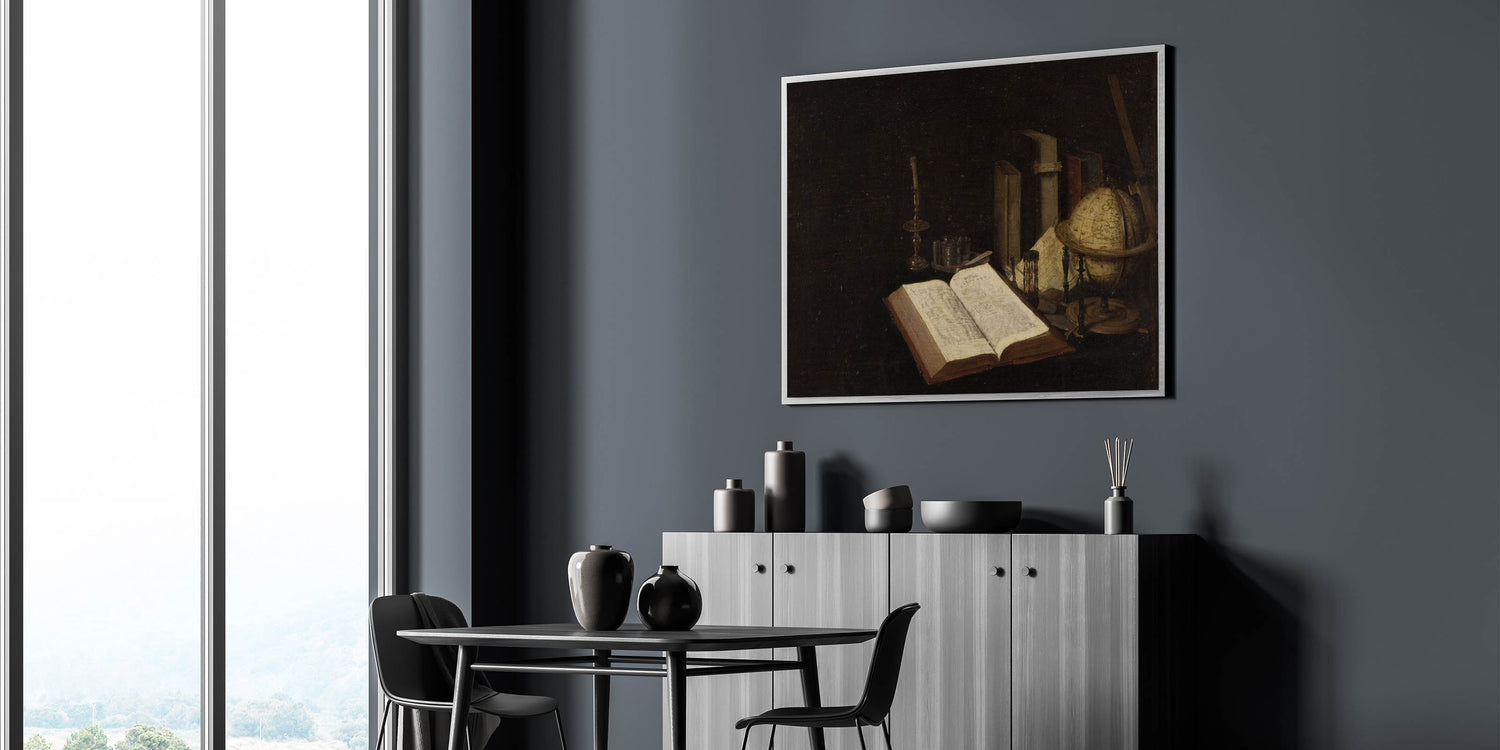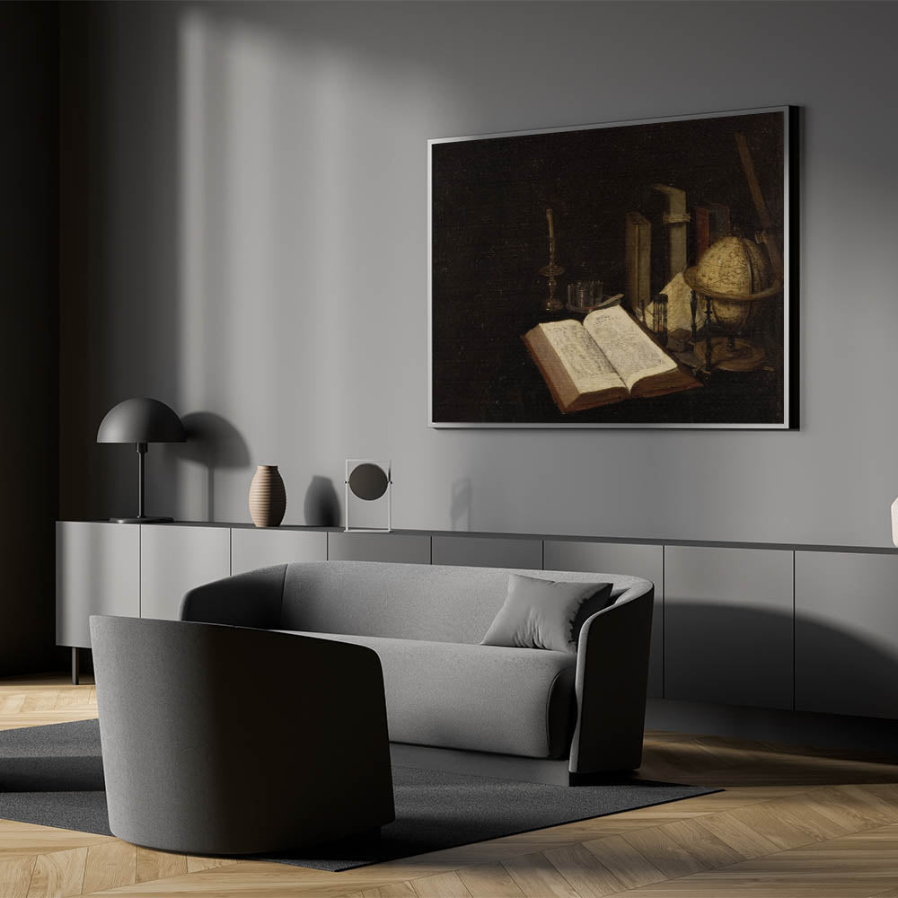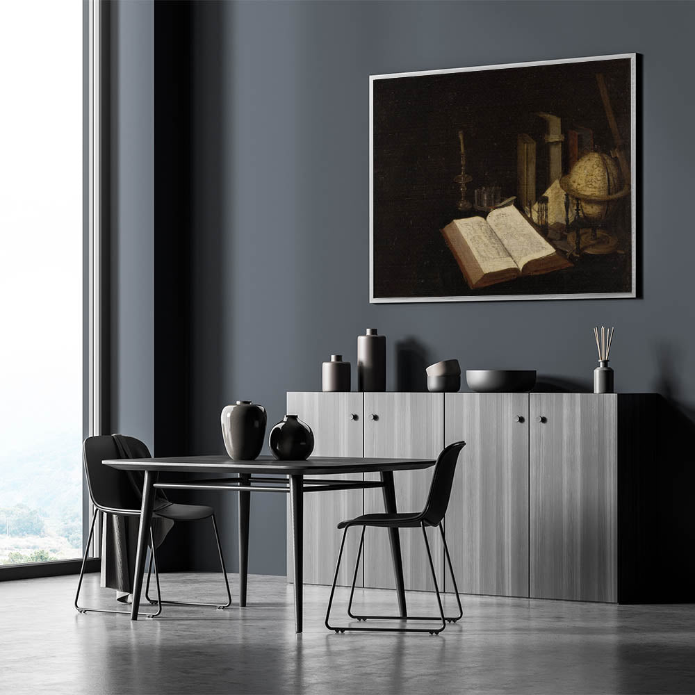This moody room decoration transports you to a time of quiet learning, making it the ideal artwork for anyone who loves the quiet beauty of books and globes in a scholarly setting.