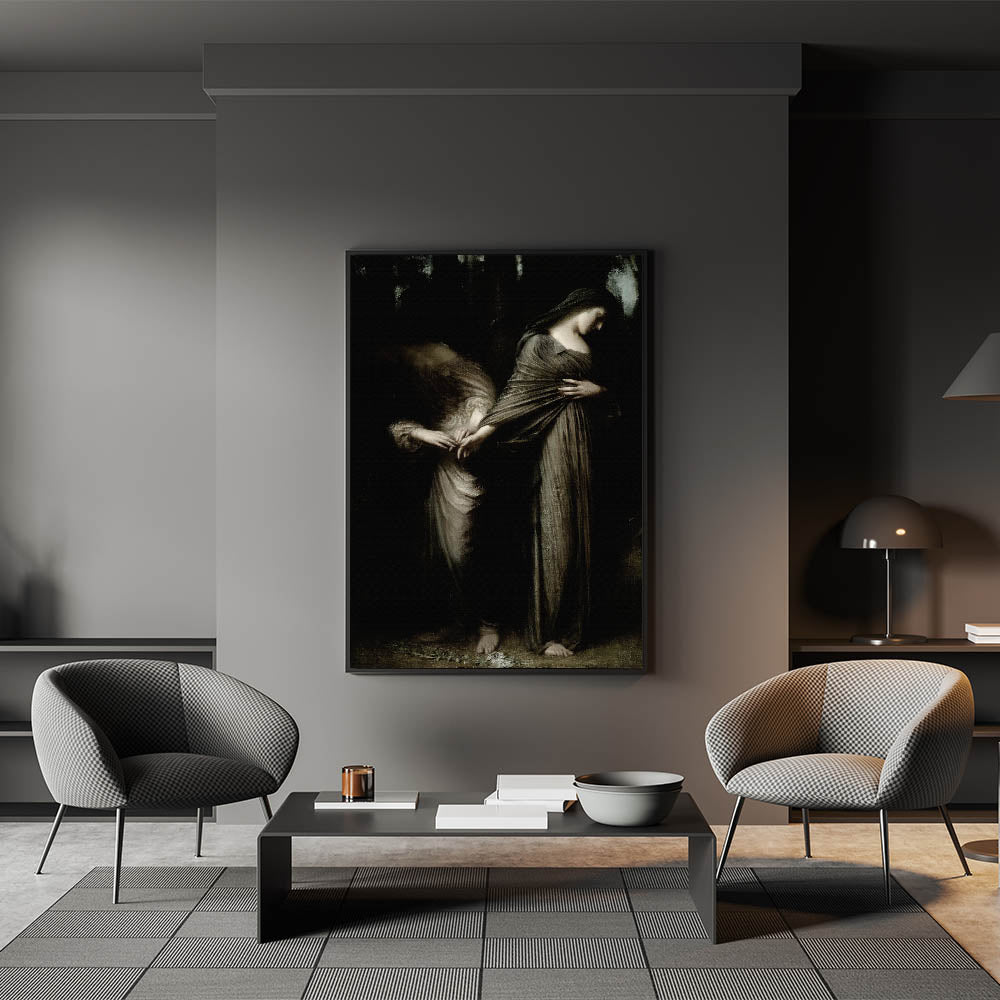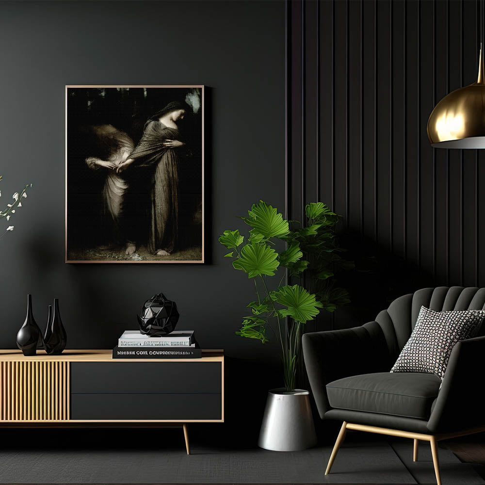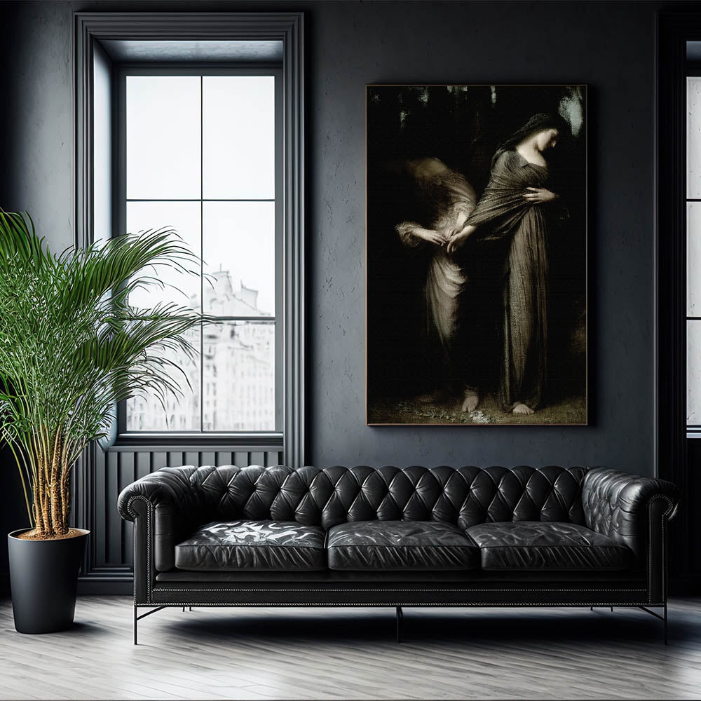 This ethereal Dark Academia wall art depicts two women entwined in shadows, their flowing garments and graceful poses evoking a sense of mystery and gothic allure. The dark background contrasts with the soft, ghostly figures, creating an intense yet delicate atmosphere that perfectly captures the essence of Dark Academia decor. The minimal use of color enhances the moody aesthetic, making this artwork ideal for those seeking a captivating, atmospheric piece for their home.